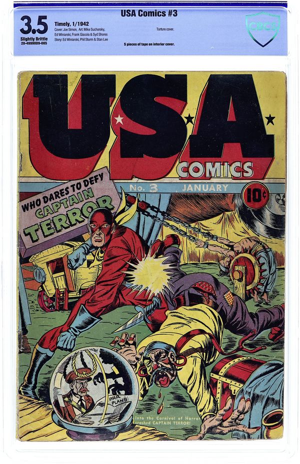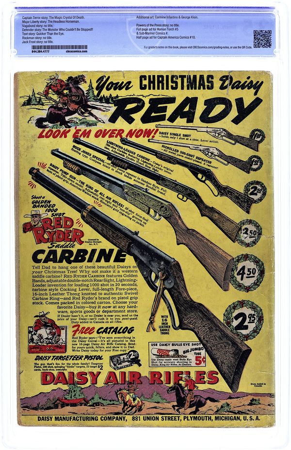 Starts Jul 4 Edited by Joe Simon. Cover by Joe Simon. Young Allies Comics ad. "The Magic Crystal of Death," art by Mike Suchorsky; Captain Terror becomes involved in a case involving a super-secret invention that can render planes invisible 200' above the ground...a secret desired by local fifth columnists. "The Headless Horseman," script by Phil Sturm, art by Syd Shores; The murder of his old college Dean inspires John Liberty to call upon the spirits of the glorious past to help him avenge this murder: death at the hands of "the Headless Horseman"! "Orrible Oress's Horrible Plan," script and pencils by Ed Winiarski, inks by George Klein; The Vagabond ventures to the city of Middletown, where an arch-criminal has plans to become that town's Czar! "The Monster Who Couldn't Be Stopped!!", art by George Klein; Don and Rusty visit the carnival and witness the brute strength of Mango, the Human Muscle. Unfortunately, moonlight changes this individual into a blood-thirsty monster who has no desire...except to kill! "Quicker Than the Eye" text story by Stan Lee. Magician Paul North, of the All-Star Traveling Carnival, is informed by the owner of a threat made against the carnival by the owner of a rival, the Brite-Lite Carnival, who feels the All-Star property is hogging all the most prosperous towns to set up business in. "The Deadly Pixies," script by Stan Lee, art by Charles Nicholas; Rockman is asked by a king to save his daughter, captured by the Pixies, taken to their stronghold, and forced to become queen of that realm and the soon-to-be bride of the Pixie King. "The Ambulance Racketeers," pencils by Frank Giacoia, inks by Carmine Infantino and George Klein; Jack Frost has to deal with a man who threatened a hospital superintendent, wanting him to buy ambulances and supplies from him...or else! "Muscles Moe's Million-Dollar Robbery," script and art by Ed Winiarski; Tom investigates the gas attack made on an armored car and the murder of the guards inside. Ad for Human Torch #5 and Sub-Mariner #3, art by Schomburg. Ad for Captain America Comics #10, with art by Jack Kirby and Joe Simon, including a plea for reader's to join Cap's Sentinels of Liberty. 68 pgs., full color. Cover price $0.10.