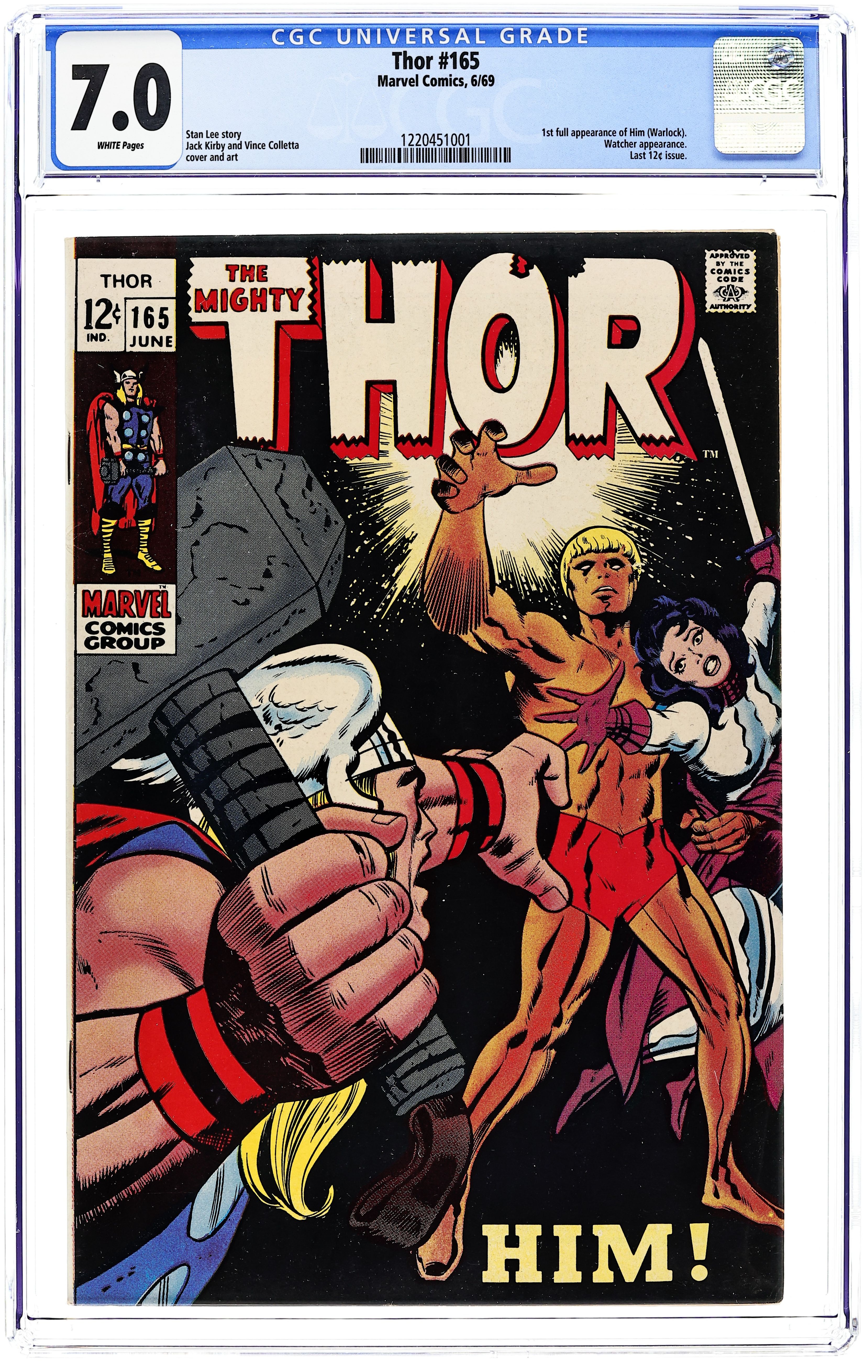 Last 12-cent cover price. Cover pencils by Jack Kirby, inks by Vince Colletta. First full appearance of Adam Warlock in "Him!", script by Stan Lee, pencils by Jack Kirby, inks by Vince Colletta; Balder continues to resist the feminine wiles of Karnilla, and the Norn Queen calls in reinforcements; Meet Haag, a morally-dubious sorceress who has mastered the power of persuasion; Will Balder cave to the sinister love of Karnilla?; Plus, Thor encounters a strange earthling who goes only by the name of "Him." Appearances by Sif and the Watcher. 36 pgs., full color. $0.12. Cover price $0.12.