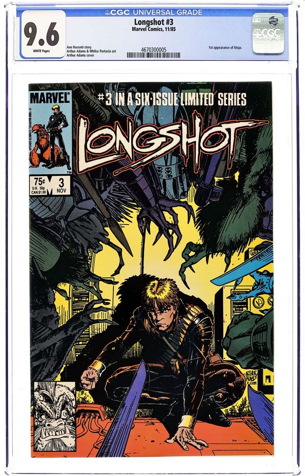 Direct Edition. Written by Ann Nocenti. Art by Arthur Adams, Whilce Portacio, and Scott Williams. Cover by Arthur Adams. Just Let Me Die; Tired of his mind numbing domestic life, middle-aged loser Theo leaps from a bridge to his death; Instead of dying, however, he instead lands on Longshot who was dumped in the river at the end of last issue; He begins to tell Longshot his everyday woes including the fact that Con Edison rips him off in charging excessive amounts for electrical power; The naive Longshot decides to break into Con Ed and steal a cache of diamonds to pay Theo his money back; The pair make it into the power plant and the wires and machinery spark a few of Longshot's memories about his home world; They get the diamonds but are attacked by Spiral, Gog and their allies who are after the same thing; During the ensuing battle, machinery gets destroyed and blacks out all of New York City. 36 pgs., full color. $0.75. Cover price $0.75.