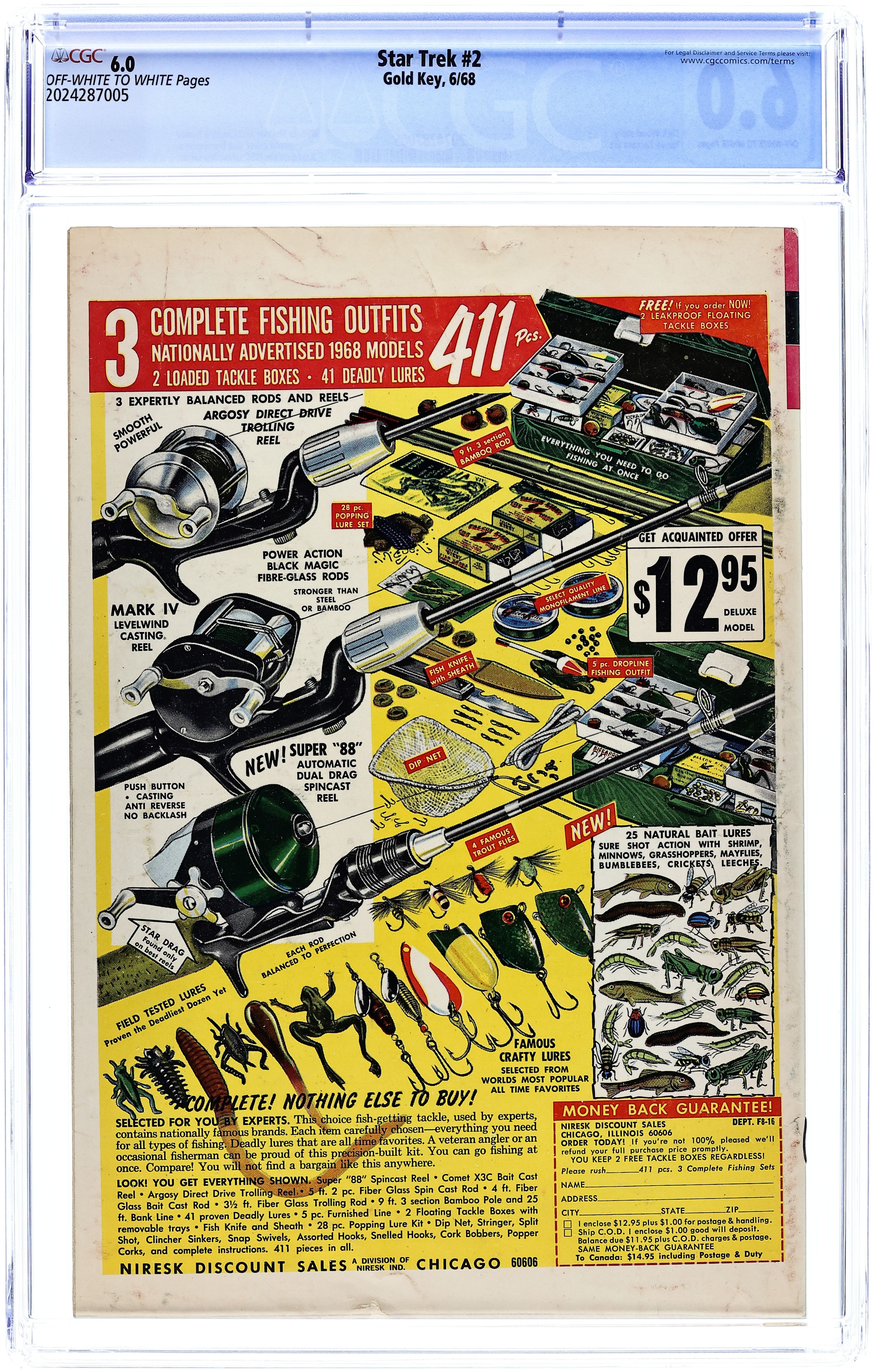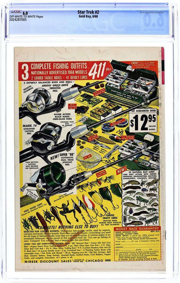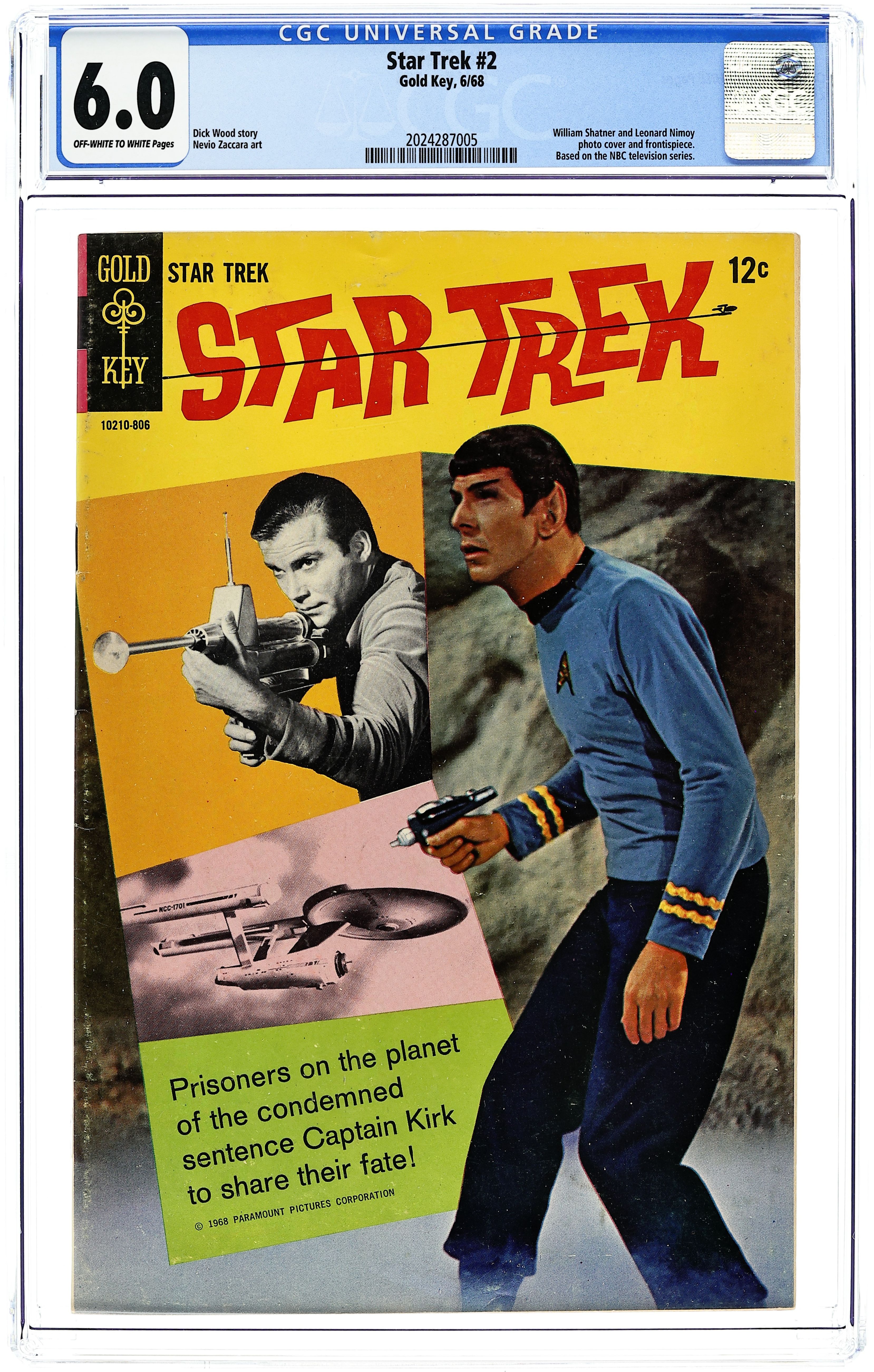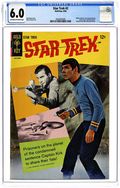 Comic book version of the original Star Trek TV series that starred William Shatner and Leonard Nimoy. Photo cover of Leonard Nimoy, William Shatner, & George Takei. Photo of U.S.S. Enterprise inside front cover. Note: There is ONLY one version of this issue. It has a photo of William Shatner on the back cover. There is no version of this issue with an ad on the back. "The Planet of No Return," script by Dick Wood, art by Nevio Zeccara; An expedition team discovers its secret too late... K-G, Planet of Death!; The planet K-G is a plant dominated planet that sends out spores that change mammals into plants; They also eat mammals; The crew beams down five crewmen and you never know who will make it because no one wears red. 36 pgs., full color. $0.12. Cover price $0.12.
