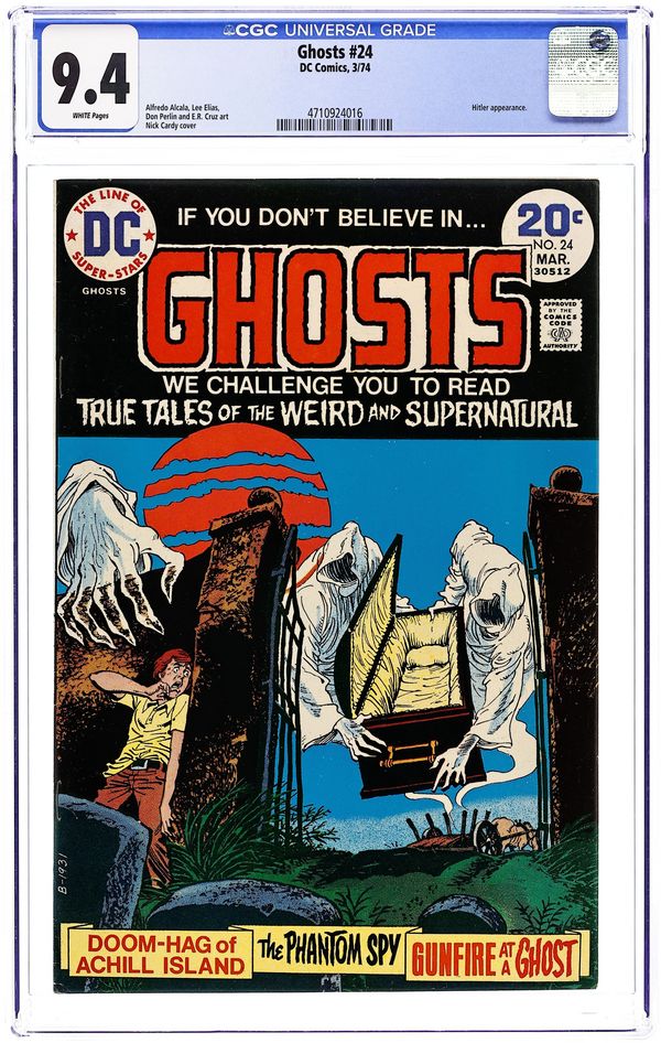 Cover by Nick Cardy. Stories by Carl Wessler and unknown. Art by Buddy Gernale, Sam Glanzman, Alfredo Alcala and Rico Rival. If you don't believe in ghosts...we challenge you to read true tales of the weird and supernatural! In this issue: "The Ghost That Wouldn't Die" with art by Buddy Gernale; 1-page text story "My Friend the Phantom"; "A Phantom in the Alamo" by Carl Wessler and Sam Glanzman; "Who Dares Cheat the Dead?" with art by Alfredo Alcala; and "Hand from the Grave" with art by Rico Rival. 32 pages, full color. Cover price $0.20.