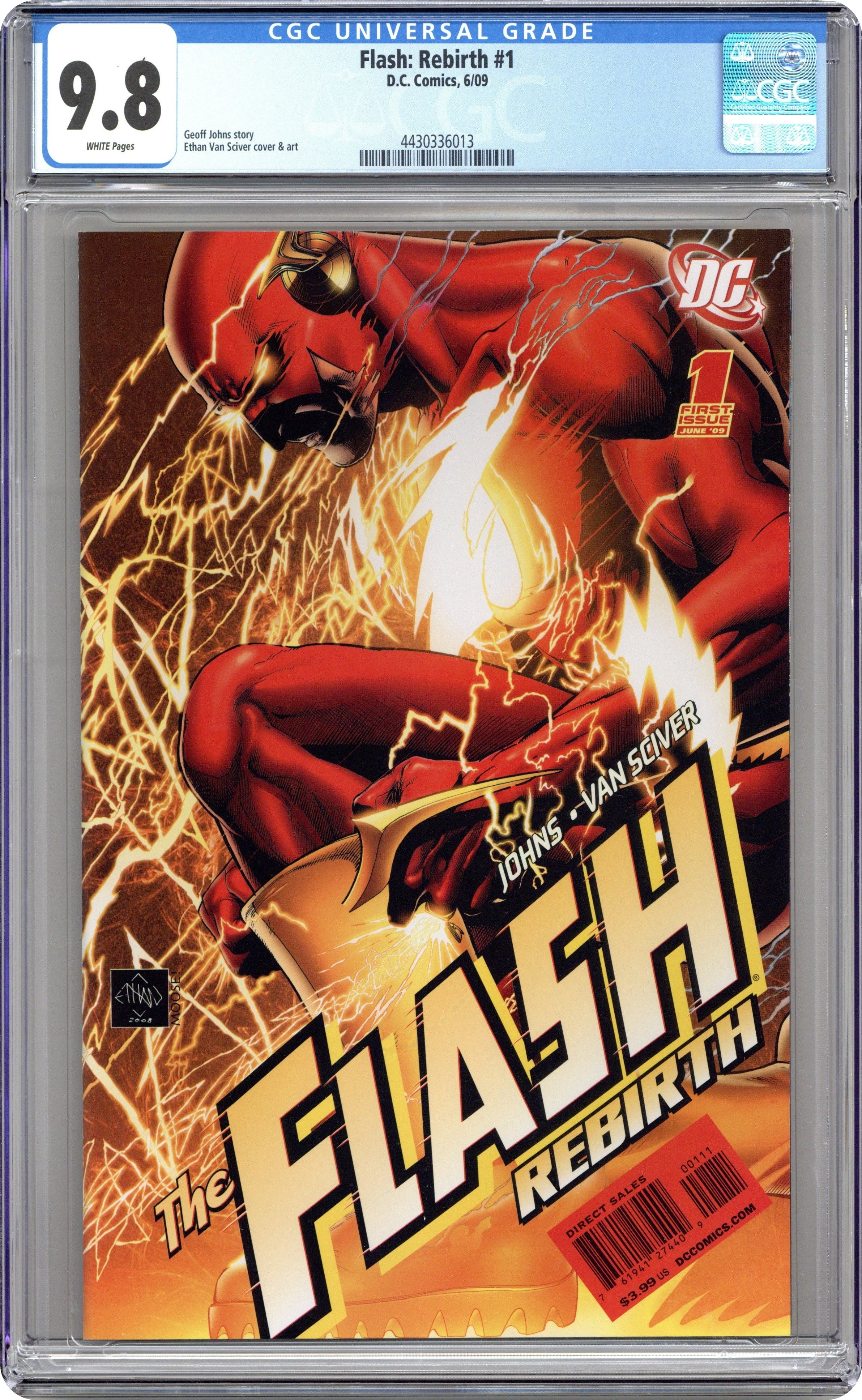 Cover by Ethan Van Sciver. Written by Geoff Johns Art by Ethan Van Sciver Through the decades, many heroes have taken the mantle of The Flash, but they all ride the lightning that crackles in the wake of the greatest hero the DC Universe has ever known, the man who sacrificed himself to save the Multiverse: Barry Allen! Following the events of FINAL CRISIS, Barry has beaten death and returned to a fast-paced world that a man out of time wouldn't recognize. Or is it a world that is only just now catching up? All the running he's done before was just a warmup for the high-speed race that he and every other Flash must now run, because even though one speedster might have beaten death, another has just turned up dead! From Geoff Johns and Ethan Van Sciver, the visionaries responsible for the blockbuster GREEN LANTERN: REBIRTH and THE SINESTRO CORPS WAR, comes the start of an explosive and jaw-dropping epic that will reintroduce to the modern age the hero who single-handedly birthed the Silver Age of comics! DC history will be made, and the Flash legacy will be redefined! Retailers please note: This issue will ship with two covers. For every 25 copies of the Standard Edition (with a cover by Ethan Van Sciver), retailers may order one copy of the Variant Edition (with a cover by Ethan Van Sciver). Please see the Previews Order Form for more information. 1 of 5 40 pg, FC. Cover price $3.99.