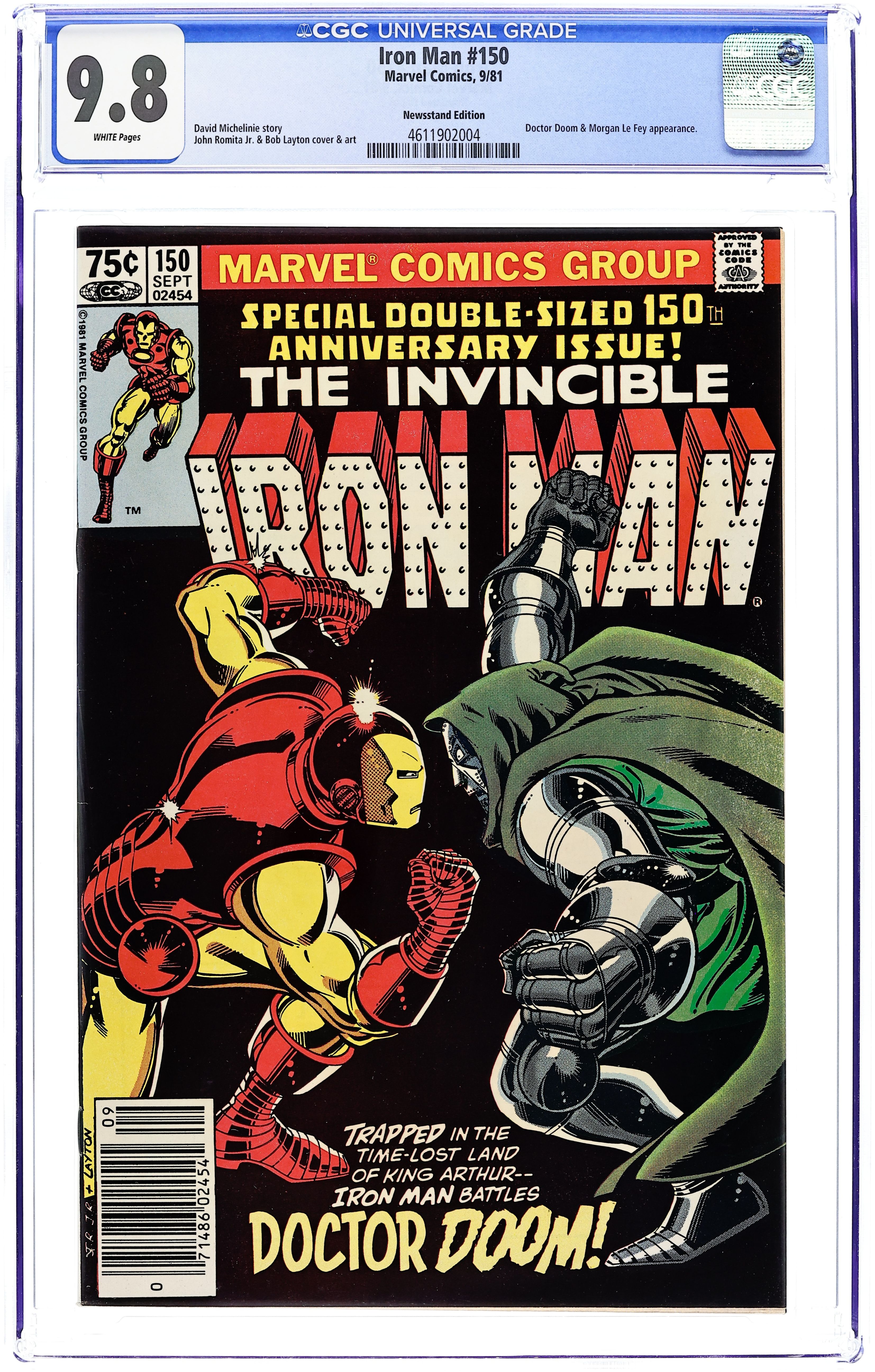 Newsstand Edition. "Knightmare" Part 2 of 2. Double-Sized 150th Anniversary Issue. Plot by David Michelinie and Bob Layton. Script by David Michelinie. Art by John Romita Jr. (breakdowns) and Bob Layton (finishes). Cover by John Romita Jr. and Bob Layton. One of the classic Iron Man issues of the bronze age! In a staggering change of events, Doctor Doom and the armored avenger are transported back in time to medieval Camelot! Wow! And while the golden avenger takes counsel with King Arthur, Victor Von Doom bargains for the soul of his mother with Morgana Le Fey! The powerful sorceress agrees to help the Fantastic Four's greatest foe! But first he must lead an army of the undead against the knights of the round table! So the battle lines are drawn! King Arthur and the Invincible Iron Man vs. Morgana Le Fey and Doctor Doom! Truly a battle for the (middle) ages! Will Camelot survive? And how will Shell-Head make it back to the 20th century? An outstanding issue! Flashback cameo by Cynthia Von Doom. (Notes: The golden avenger and Doctor Doom meet again in Iron Man 249-250. What if (1977 1st series) 33 explores an alternate reality in which Tony Stark is left behind in Camelot.) 48 pages. Cover price $0.50.