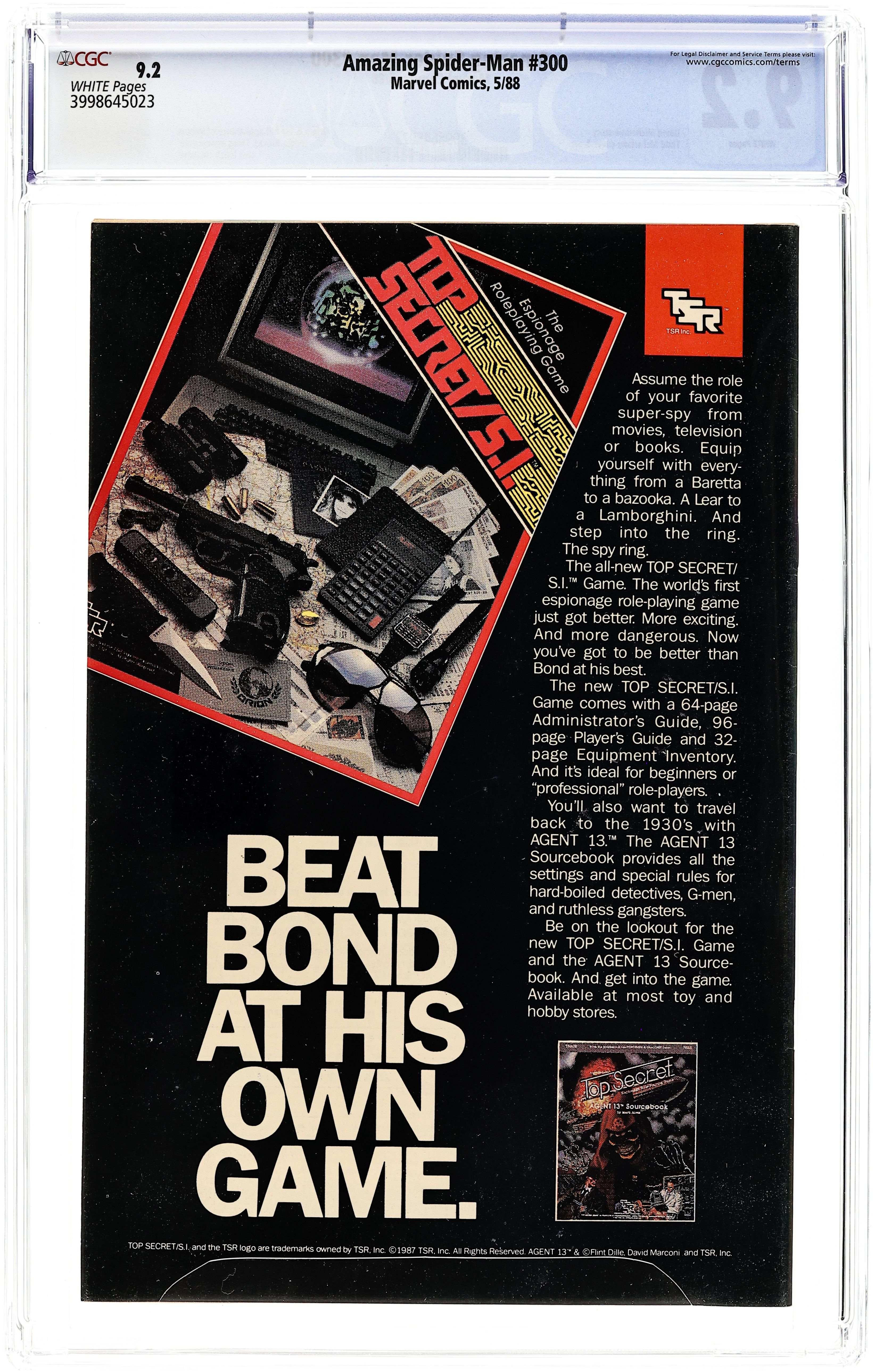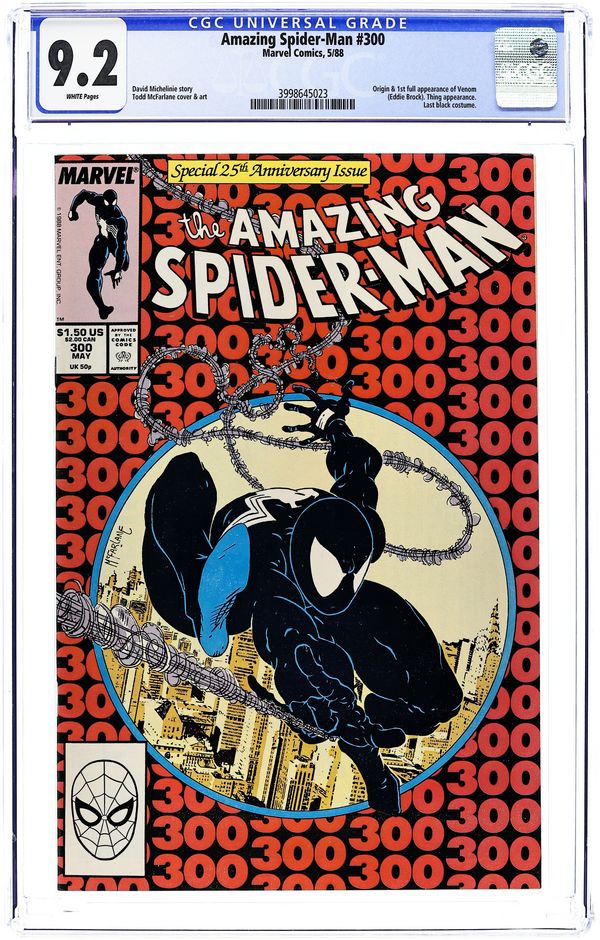 Direct Edition. Giant-sized 25th anniversary issue. First full appearance of Venom in "Venom!", script by David Michelinie, art by Todd McFarlane; Spidey's old alien costume has merged with reporter Eddie Brock who thinks his career was ruined by Spider-Man and the symbiote of the two, Venom, takes on the web slinger; At MJ's request, Spidey returns to the blue and red costume as she now finds his black duds way too creepy; This is the last issue in which Spider-Man appears in his black costume; Thing (of the Fantastic Four) cameo.. Stan's Soapbox Special in place of letters page: Full page editorial by Stan on the occasion of Spider-Man's 300th issue. 52 pgs., full color. Cover price $1.50.