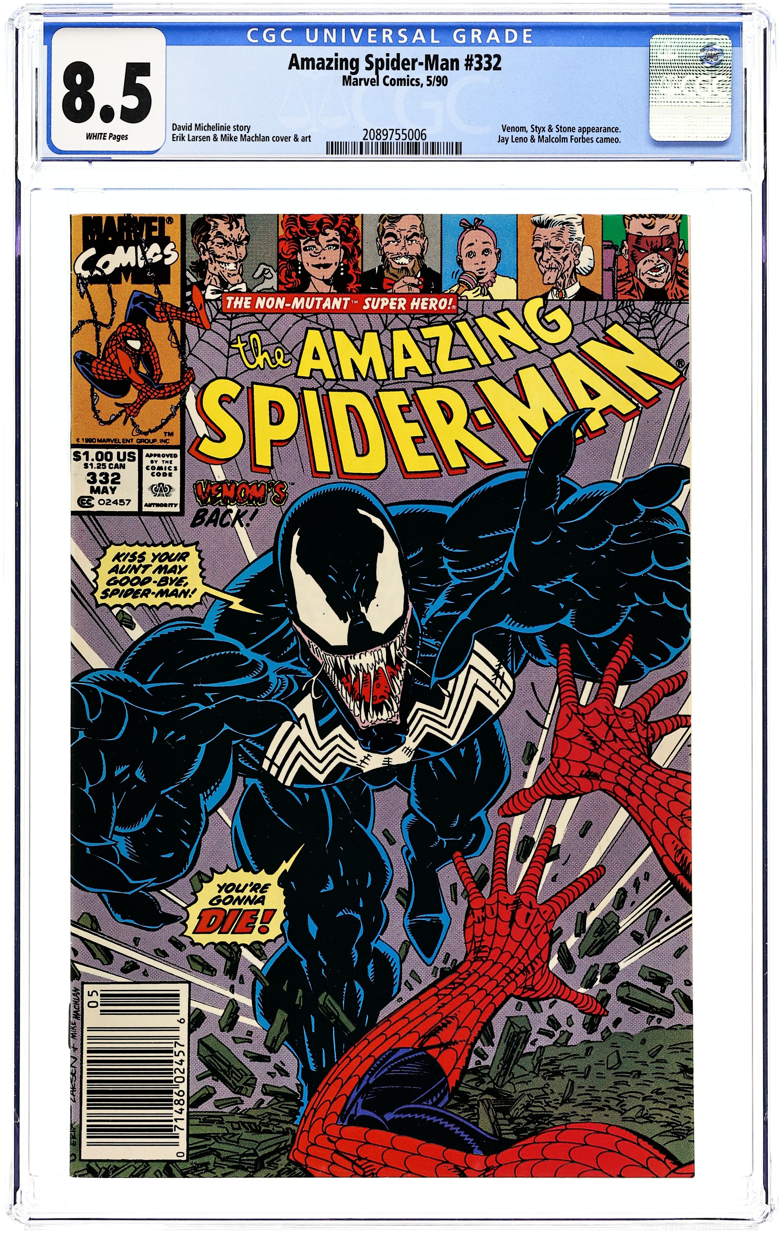 Direct Edition. "Sunday in the Park with Venom" Part 1 of 2. Script by David Michelinie. Pencils by Erik Larsen. Inks by Mike Machlan, Jack Abel, Keith Wilson, Keith Williams, Brad Vancata, Joe Rosas, and Mickey Ritter. Cover by Erik Larsen and Mike Machlan. The web-slinger's worst nightmare is back again! Venom! And so is Mary Jane's! Jonathan Caesar! Add Styx and Stone to the volatile mix and the Parkers are in for a very rough day! The Amazing Spider-Man battles the psychotic Venom in Central Park, while Mary Jane confronts the deranged Caesar at Bedford Towers! Could the wall-crawler and his wife score a double victory against their respective nemeses? Mary Jane has a chance; Spider-Man not so much. Cameo appearances by Aunt May, Jimmy Olsen, Jay Leno, and Malcolm Forbes. (Note: The letters page contains a statement of ownership: average print run 426,790; average paid circulation 266,100.) 36 pages. Cover price $1.00.