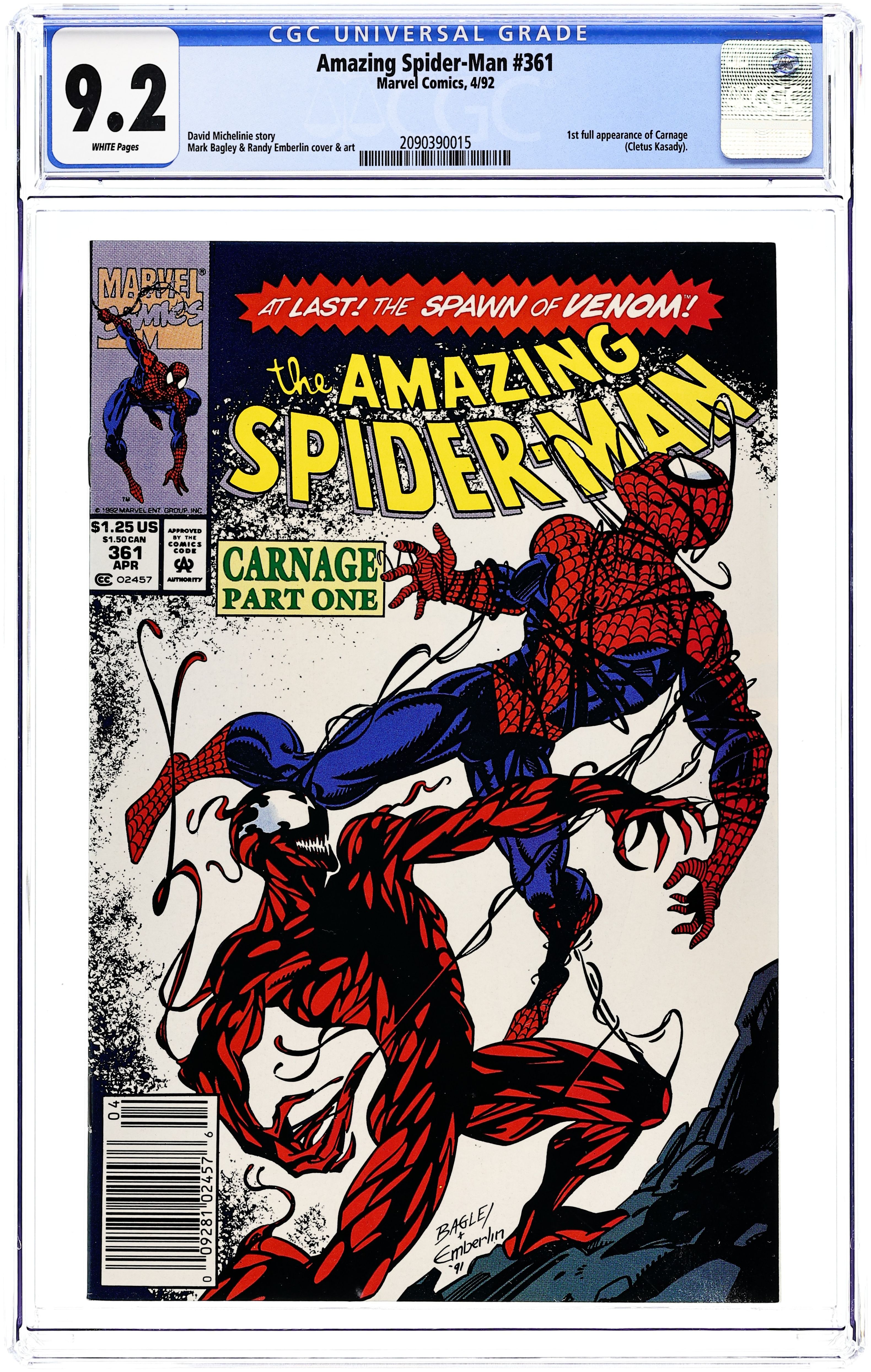 First Printing. Newsstand Edition. First (full) appearance of Carnage in "Savage Genesis!" Part 1 of 3. Script by David Michelinie. Pencils by Mark Bagley. Inks by Randy Emberlin. Cover by Mark Bagley and Randy Emberlin. Blood runs in the streets as a serial killer roams New York City! And as the web-slinger investigates the murders, he notices a very disturbing similarity to another killer's modus operandi! In a burned-out building in Brooklyn, the spectacular one comes face-to-face with his new homicidal foe...Carnage! Can the wall-crawler end Cletus Kasady's rampage in their very first encounter? Cameo appearances by Aunt May and Mary Jane Watson. Flashback cameo by Venom. (Note: This three-part story was reprinted in 2011 in the trade paperback: Spider-Man -- The Vengeance of Venom.) 36 pages, full color. $1.25 cover price. NOTE: Most of these were distributed with slight printer tears in the bottom edge of the cover. Cover price $1.25.