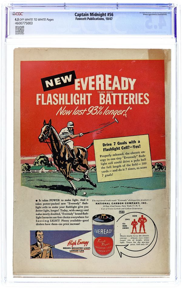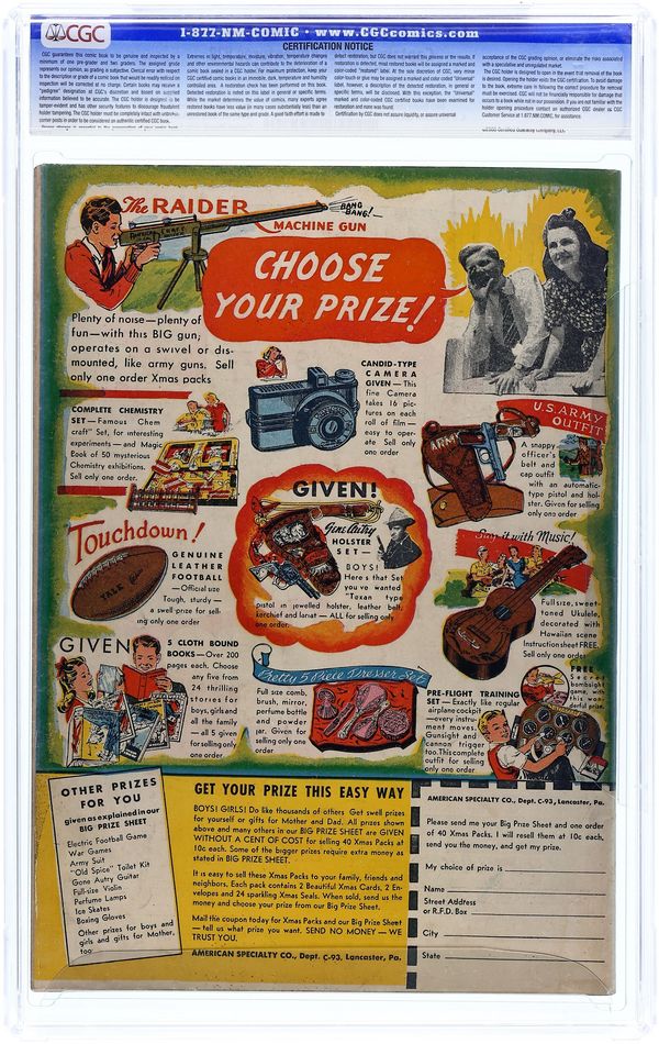 - C.C. Beck, Jack Kirby Authenticated Autographs on inside front cover. "I did this story" inscription from Jack Kirby. "I did this cover only!" inscription from C.C. Beck dated 1975. C.C. Beck, Jack Kirby and Joe Simon Authenticated Autographs on page 1. Restoration includes: color touch, pieces added, tear seals, reinforced. Top and right edge trimmed. View the item images to see the autographs and inscriptions as imaged prior to grading and encapsulation by CGC.