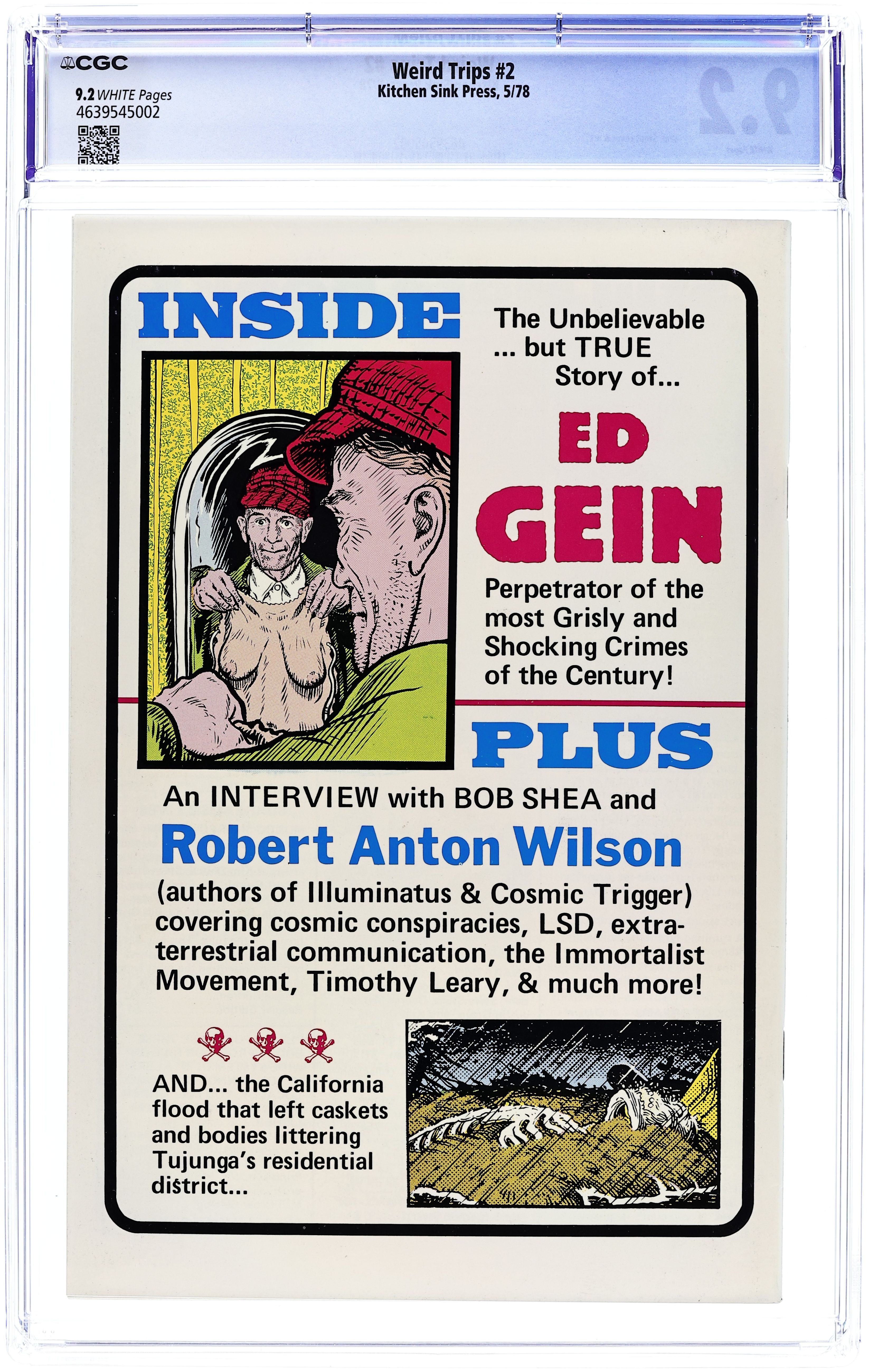 Adults only. Ed Gein cover by Bil Stout. Content: Interview w/ Bob Shea & Robert Anton Wilson; "The Wonderful World of Animals", by Joel Beck; "Thirty Escape in Boothill Breakout", by Greg Dempsey; "Ed Gein and the Lefy Hand of God", by David Schreiner. Cover price $1.00.