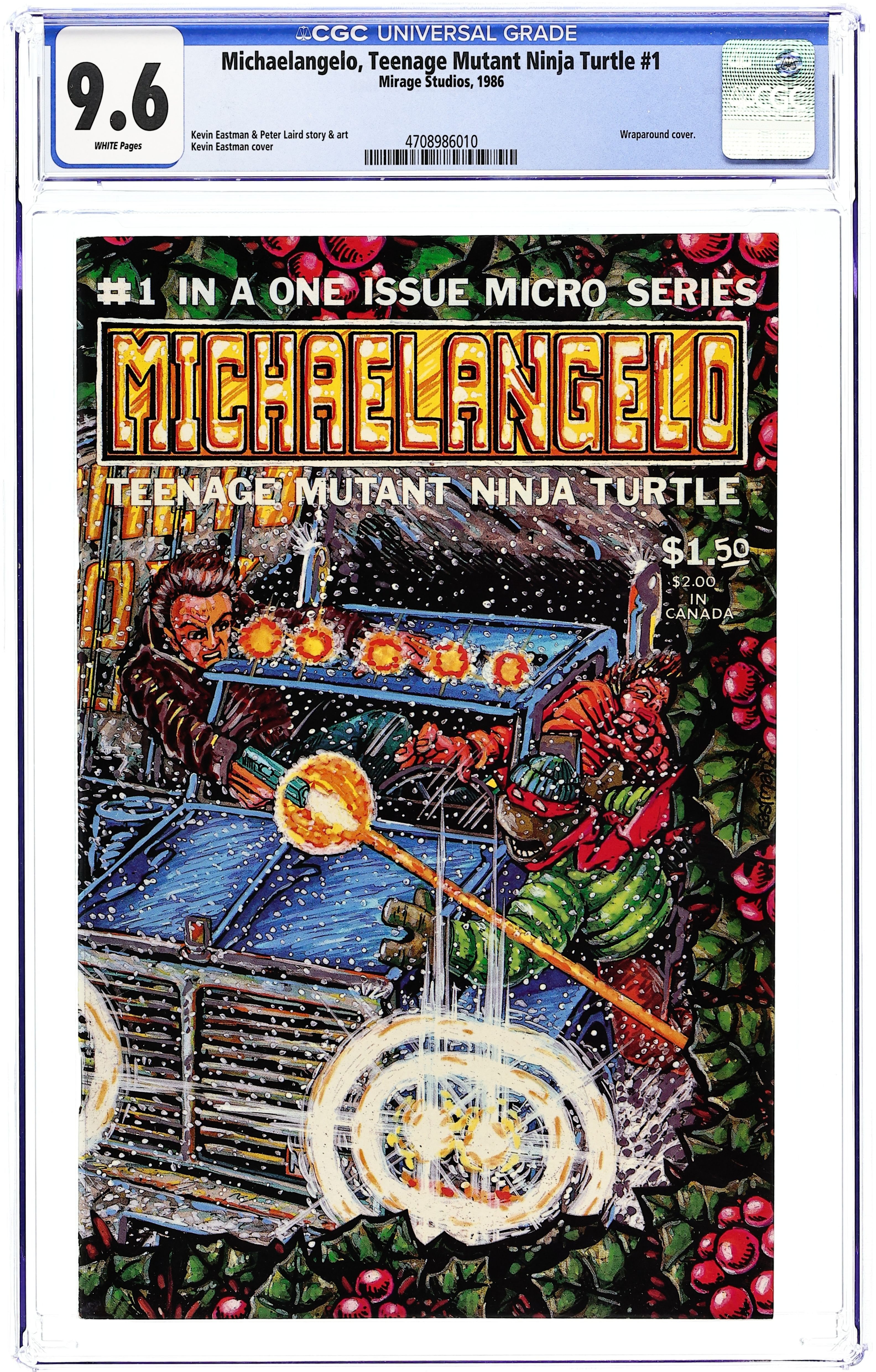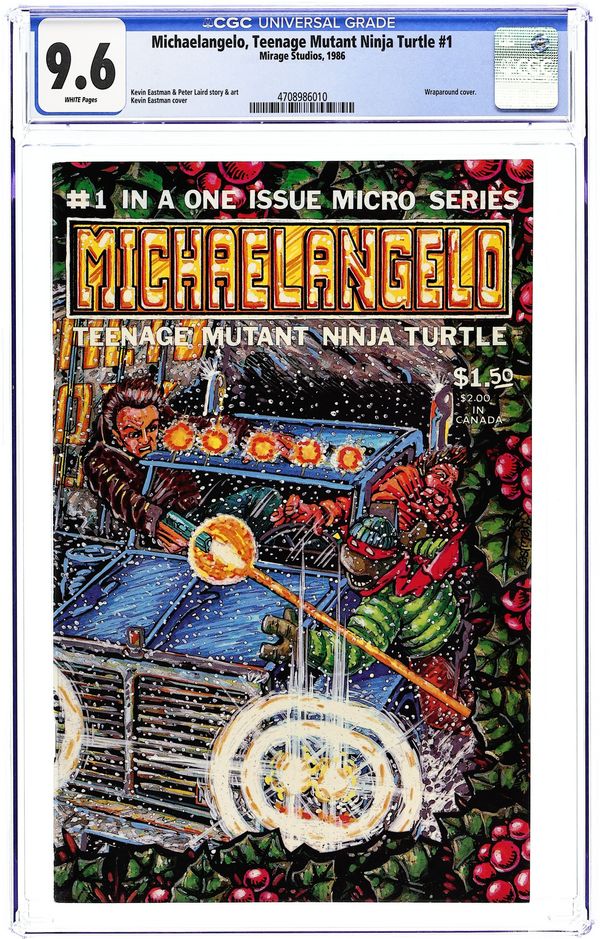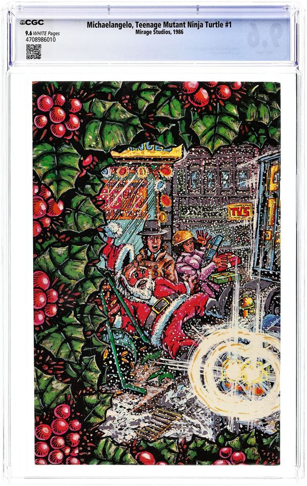 Michaelangelo of the Teenage Mutant Ninja Turtles has a solo Christmas adventure, as he battles hoodlums who have hijacked a truck full of toys intended for an orphanage. Part of a series of one-shots featuring the Turtles in solo stories. Story and art by Kevin Eastman and Peter Laird. Backup story featuring Gizmo; story and art by Michael Dooley. Black and white; 44 pages. Wraparound cover by Eastman. Cover price $1.50. Cover price $1.50.