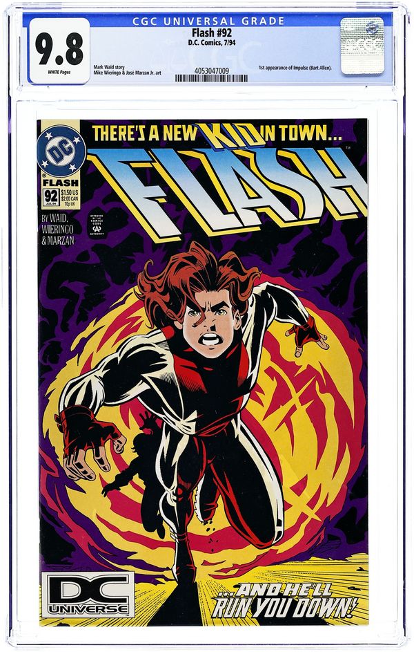 Newsstand Edition. In "Reckless Youth, Chapter One: Speed Kills", Iris Allen arrives from the future, bringing with her a special someone. Featuring the first appearance of Impulse. Part 1 of 3, continued next issue. Script by Mark Waid, pencils by Mike Wieringo, inks by Jose Marzan, Jr. Wieringo/Marzan, Jr. cover. Cover price $1.50.