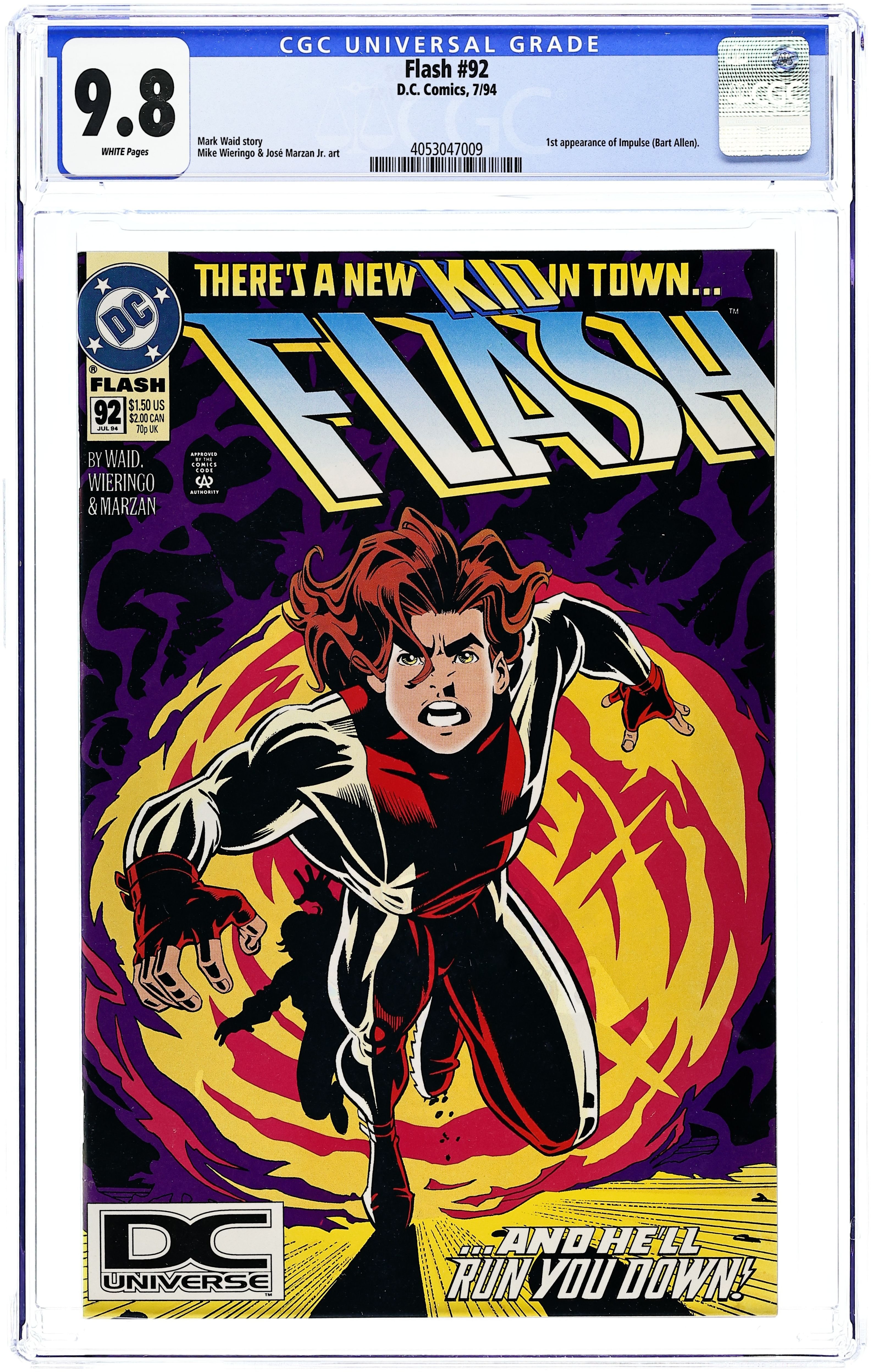 DC Universe UPC Multipack Variant. In "Reckless Youth, Chapter One: Speed Kills", Iris Allen arrives from the future, bringing with her a special someone. Featuring the first appearance of Impulse. Part 1 of 3, continued next issue. Script by Mark Waid, pencils by Mike Wieringo, inks by Jose Marzan, Jr. Wieringo/Marzan, Jr. cover. Cover price $1.50.