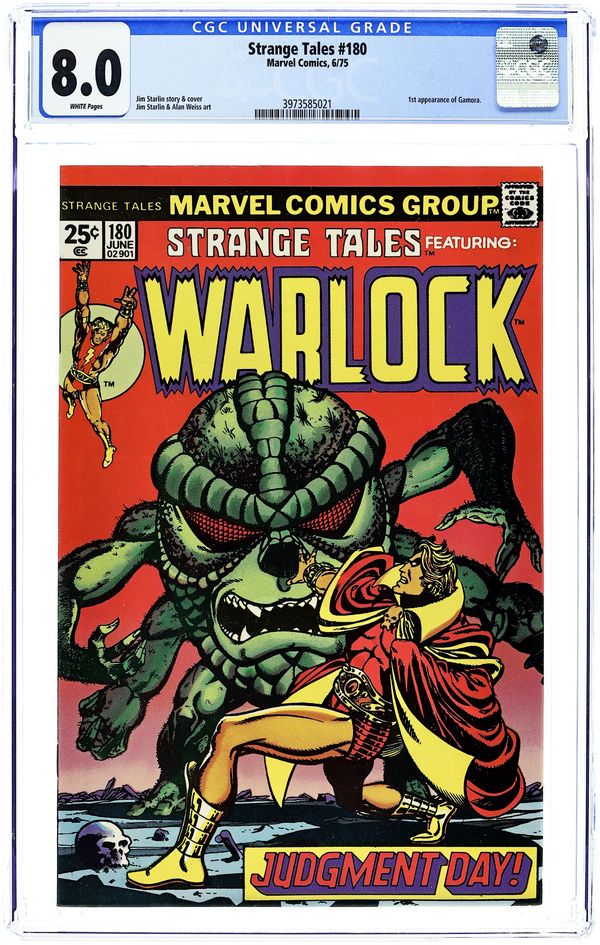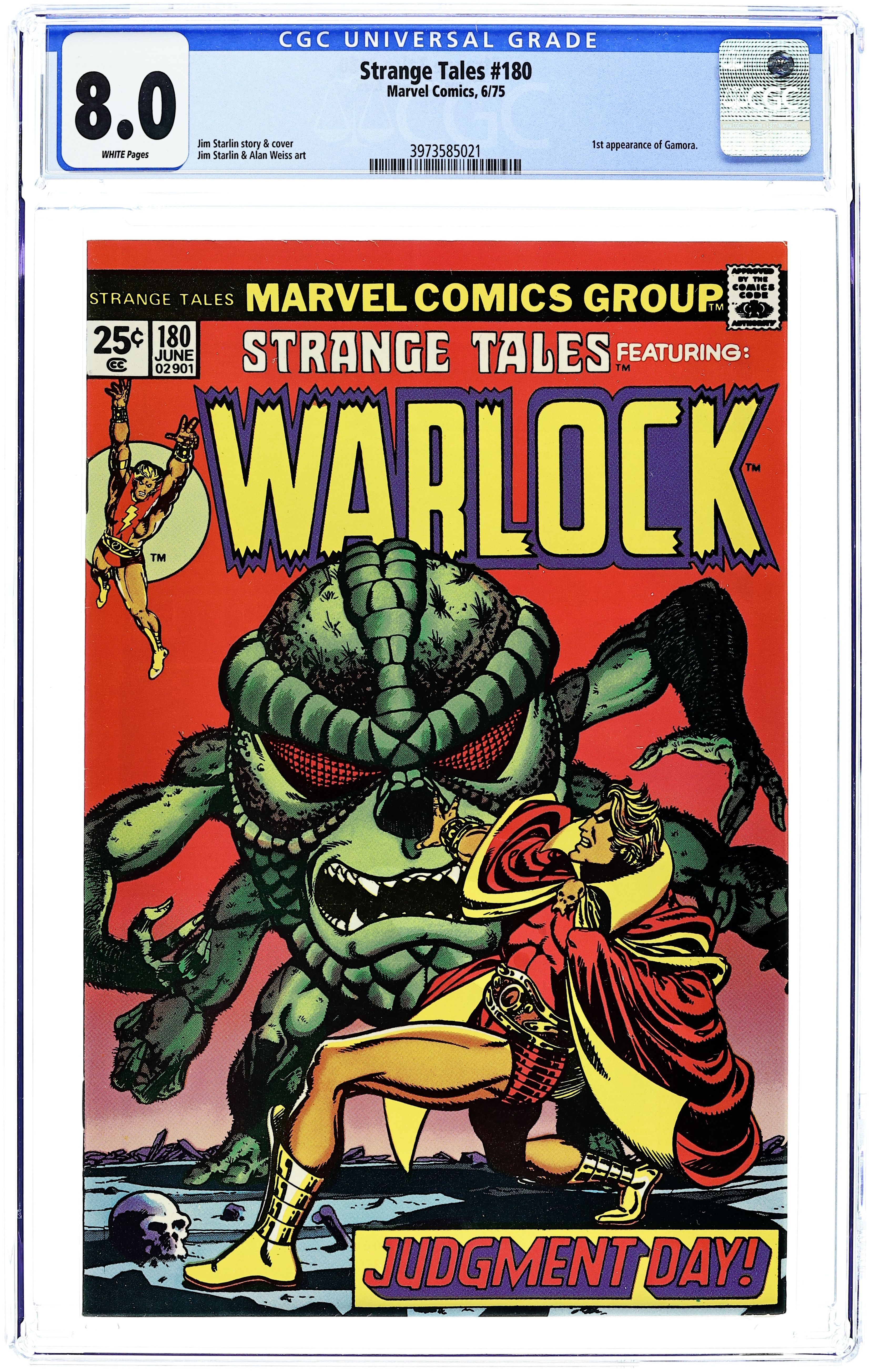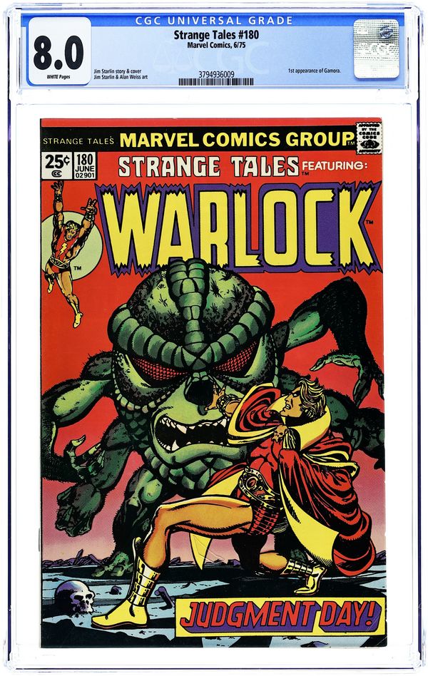 Ends Jan 26 9:34 PM CST Bid History 10 bids Current Bid $47 Your Secret Max Bid If you'd like to bid, please log in or register. Cover art by Jim Starlin. "The Judgment!", script by Jim Starlin (as Sam Jiltirn), pencils by Jim Starlin, inks by Jim Starlin (as J.L. Minirats) and Alan Weiss; While battling a couple of the Black Knights the Soul Gem almost takes control again and Warlock decides, that he must destroy it, however as he takes it off Warlock collapses and realizes, that he can no longer exist without the Gem as it has been sucking out Warlock's Soul in the last three Years thus becoming his life force; The Matriarch wants to make a Slave out of Warlock now instead of killing him; After trying to remove the Gem Warlock is invited by the Matriarch to the Sacred Palace, an obvious trap, but since she claims, that she knew that the gem would become a danger even to Warlock himself, Warlock decides to accept the invitation and ditches; Pip First appearance of Gamora. Spider-Man stars in a one-page Hostess ad, "The Trap." 36 pgs., full color. Cover price $0.25.