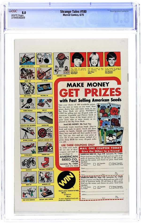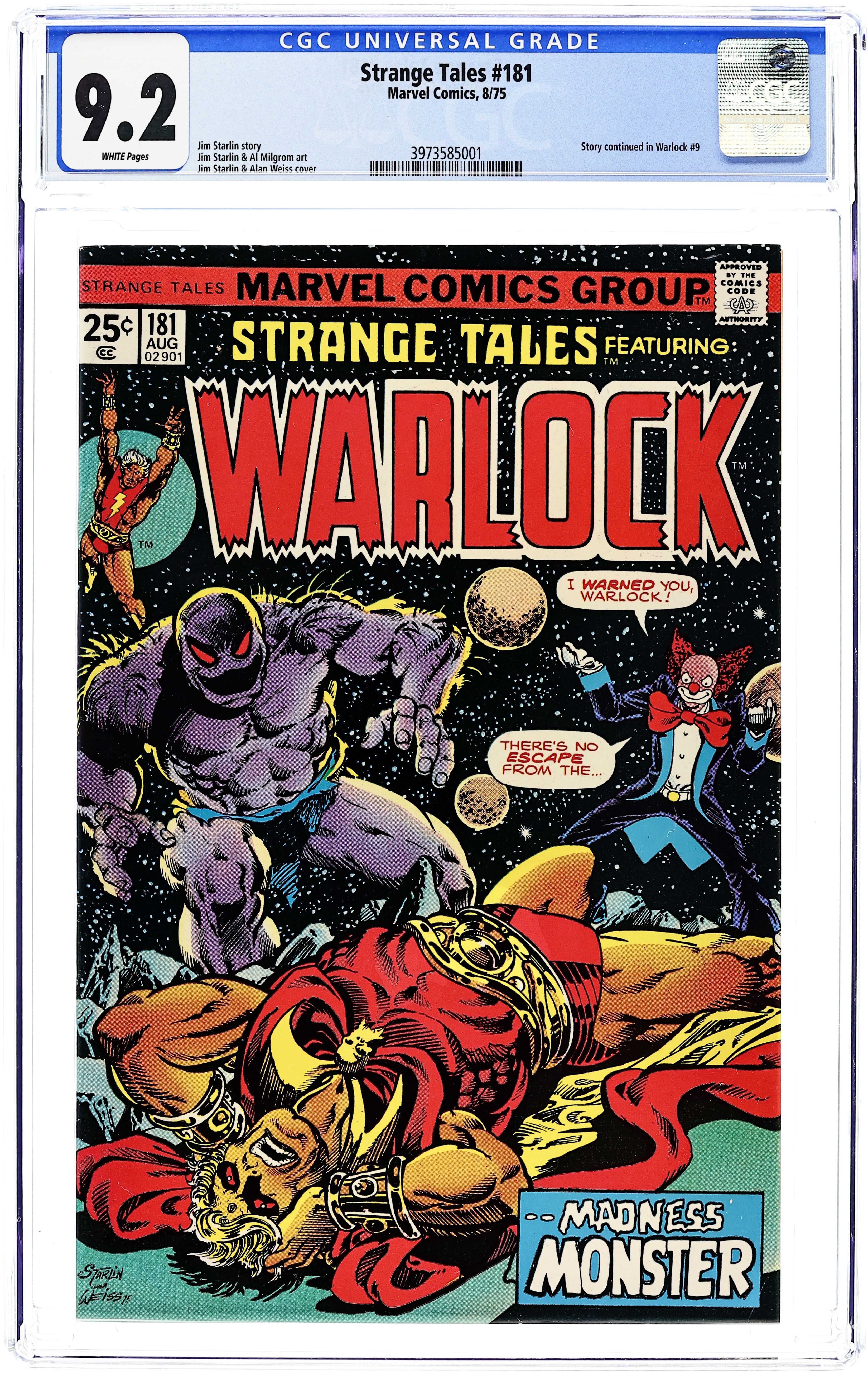 Cover art by Jim Starlin. "Death Ship!", script and art by Jim Starlin; Warlock is captured by Autolycus of the Black Knights an brought aboard Magus' Flagship; His fellow prisoners tell Warlock, that survivors of the Wars of the Church are taken as slave laborers, those who refuse will be terminated and their remains will be chemically broken down and valuable elements that can be retrieved will be used to further the cause of the Church; They also tell him, that Non-Humanoids are not considered fashioned in the Magus' image and thus must be disposed of, this also holds true for some Humanoid types—such as Trolls; First appearance of Pip the Troll. 36 pgs., full color. Cover price $0.25.
