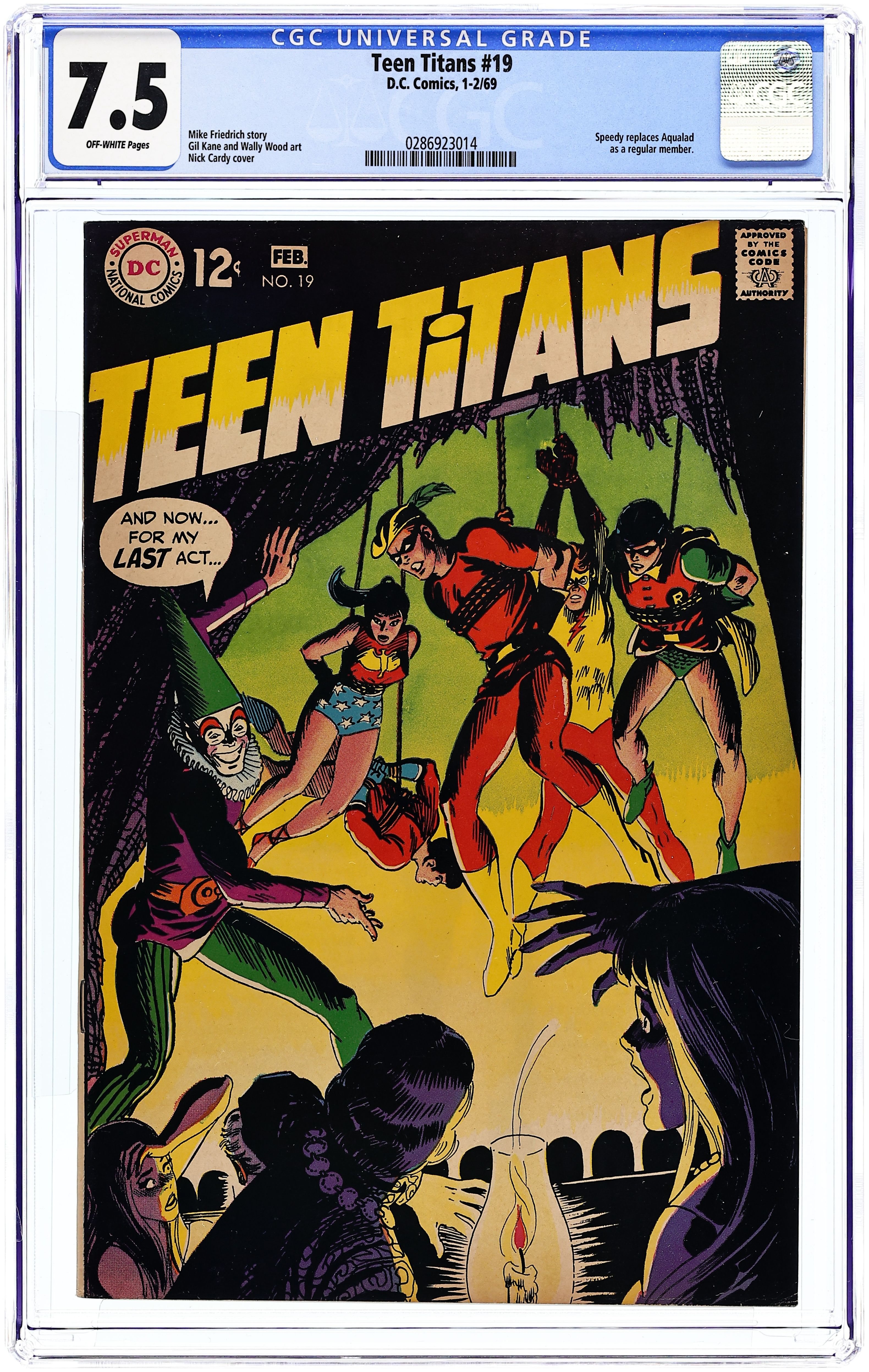 Written by Mike Friedrich. Art by Gil Kane and Wally Wood. Cover by Nick Cardy. The Titans battle Punch a teen-age would-be villain. Punch defeats two groups of Titans, but when they escape they are able to capture him with ease. Aqualad takes a leave of absence from the Titans. Wonderful World of Comics #7 article. 36 Pages, Full Color. Cover price $0.12.