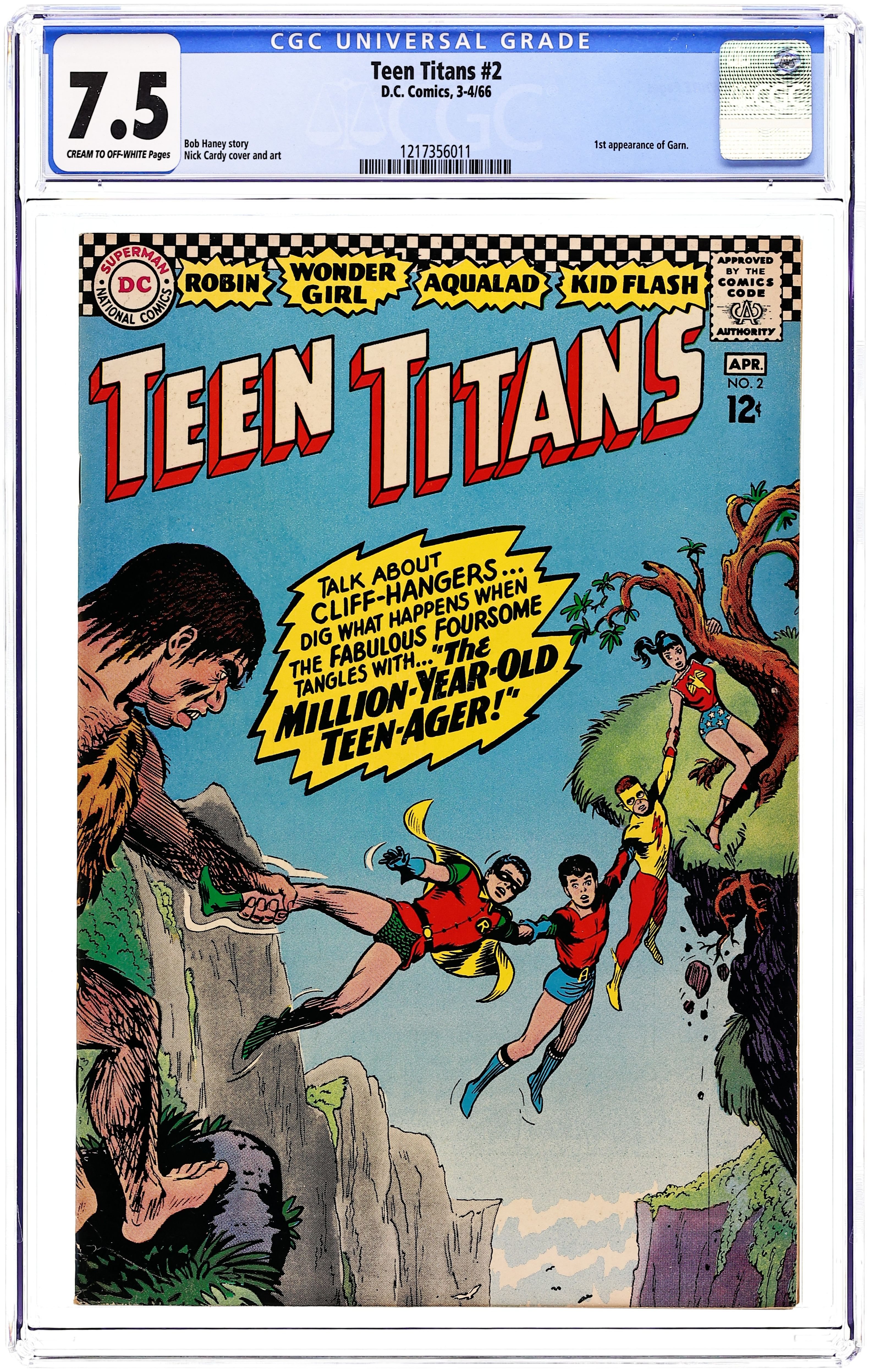 Written by Bob Haney. Art and cover by Nick Cardy. The Titans help a caveboy defeat his enemy after they are revived from suspended animation. First appearance of Titans' Lair. 1st appearance of Garn. 36 Pages, Full Color. Cover price $0.12.