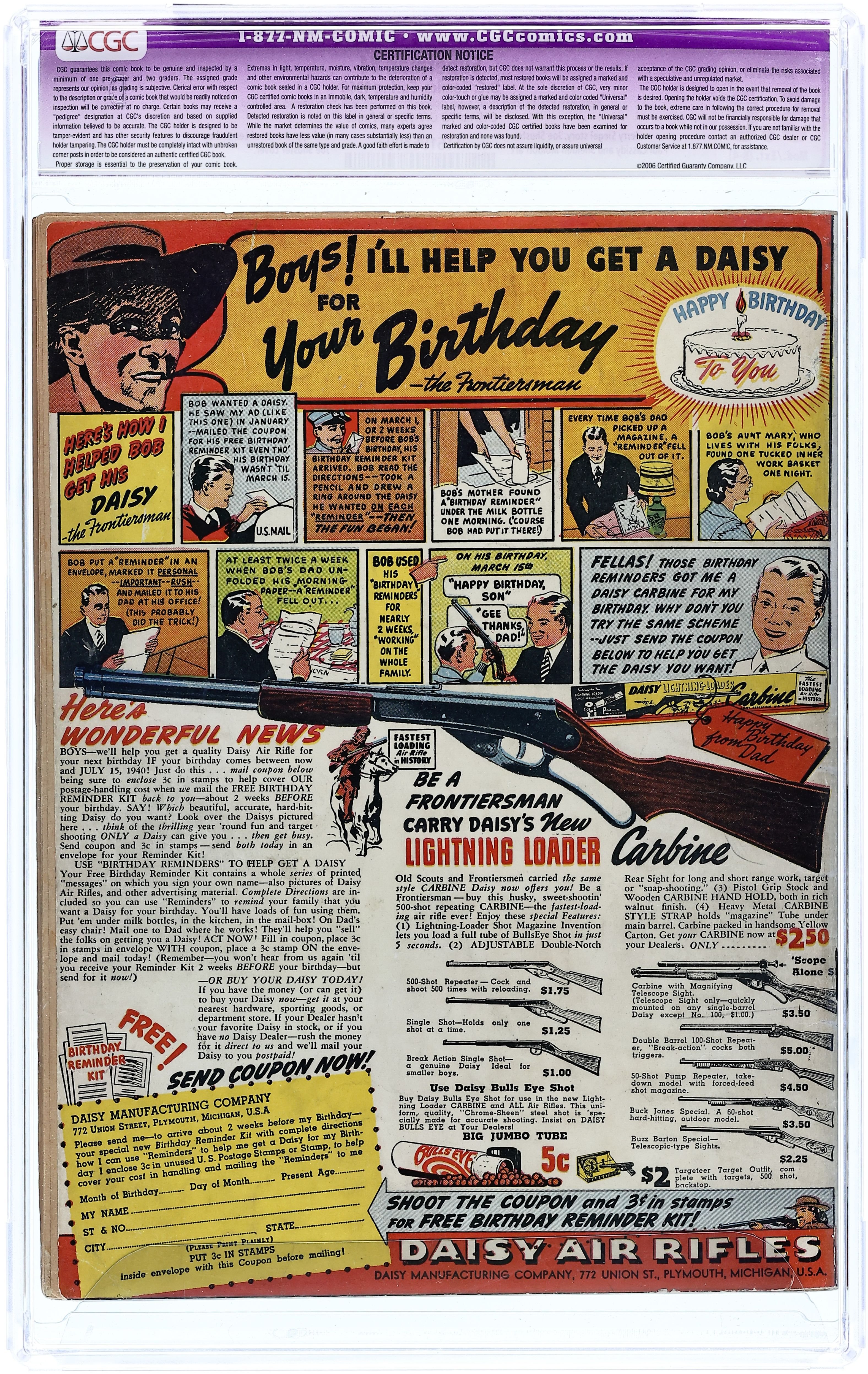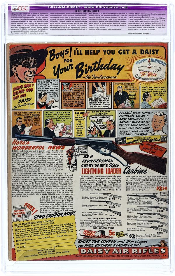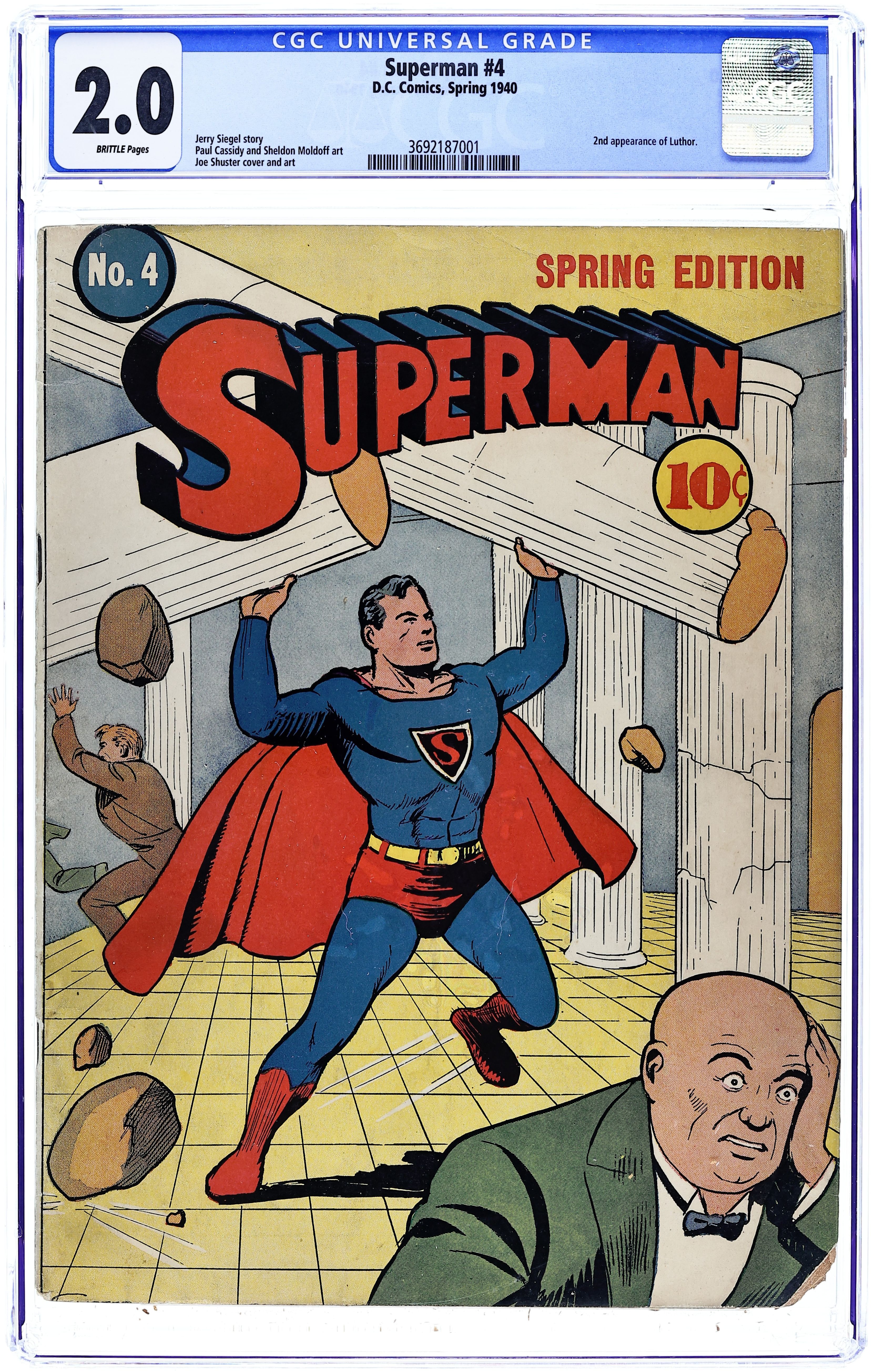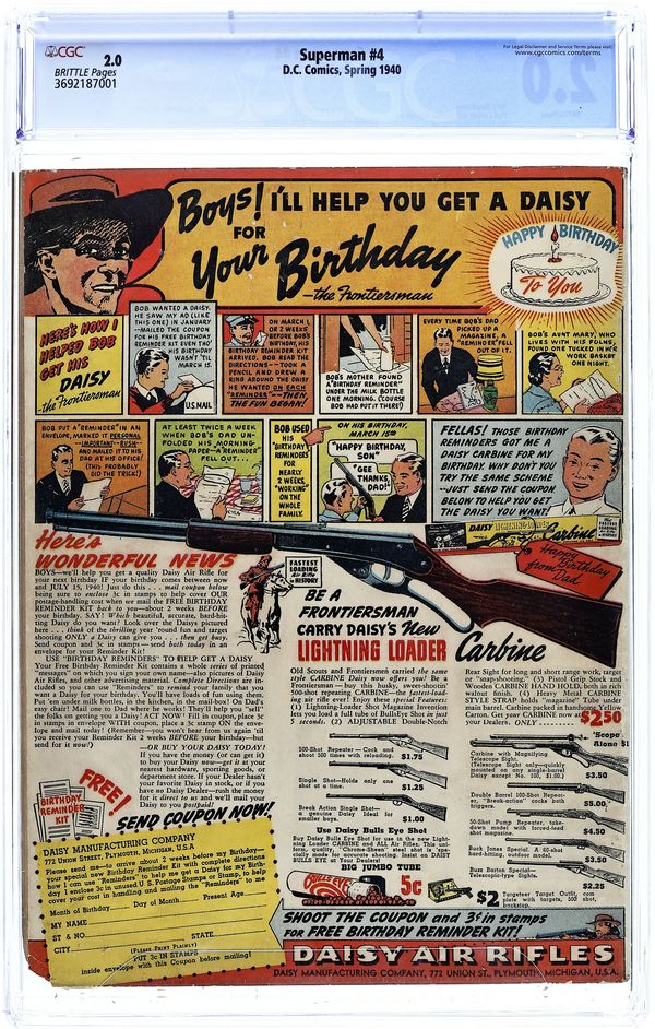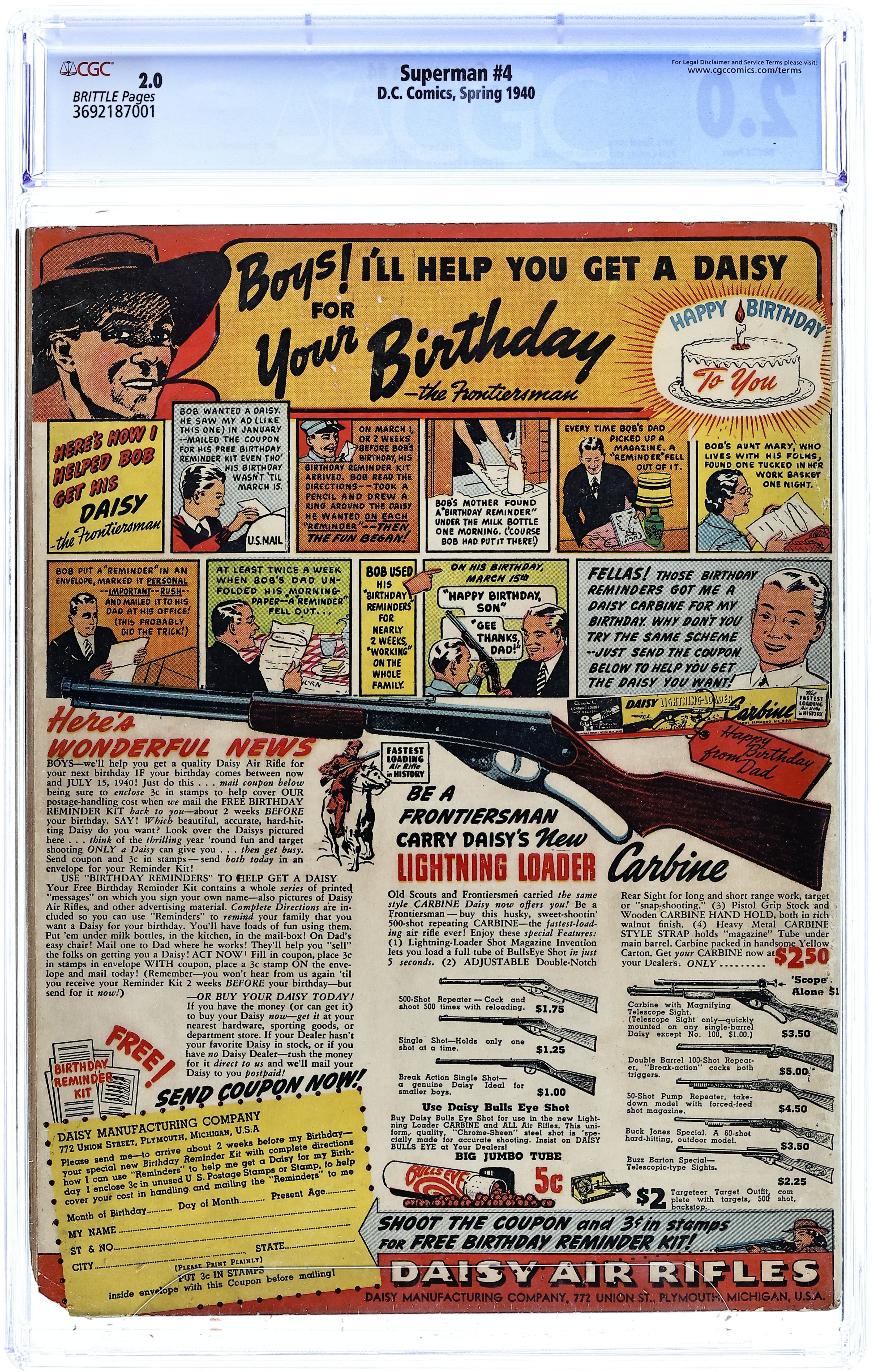 Cover art by Joe Shuster. Features a two page origin (new material) of Superman by Jerry Siegel and Joe Shuster, plus four pages previously omitted from the Action Comics series. Untitled Superman story; Clark Kent applies for a job at the Daily Star, but is turned down until Superman stops a lynching and Clark phones in the story. Untitled Superman story; Superman breaks into the Governor's mansion to stop the execution of Evelyn Curry, and Lois is kidnapped by gangsters, no thanks to that spineless milksop, Clark Kent, but is rescued by Superman. Scientific Explanation of Superman's Amazing Strength! Superman text story featuring Biff Dugan. Action Comics #14 ad, art by Fred Guardineer. Article with photos and biographies of Jerry Siegel and Joe Shuster. Back cover features the first pin-up of Superman with is also the 1st ever pin-up page to appear in a comic book. 68 Pages, Full Color. Cover price $0.10.