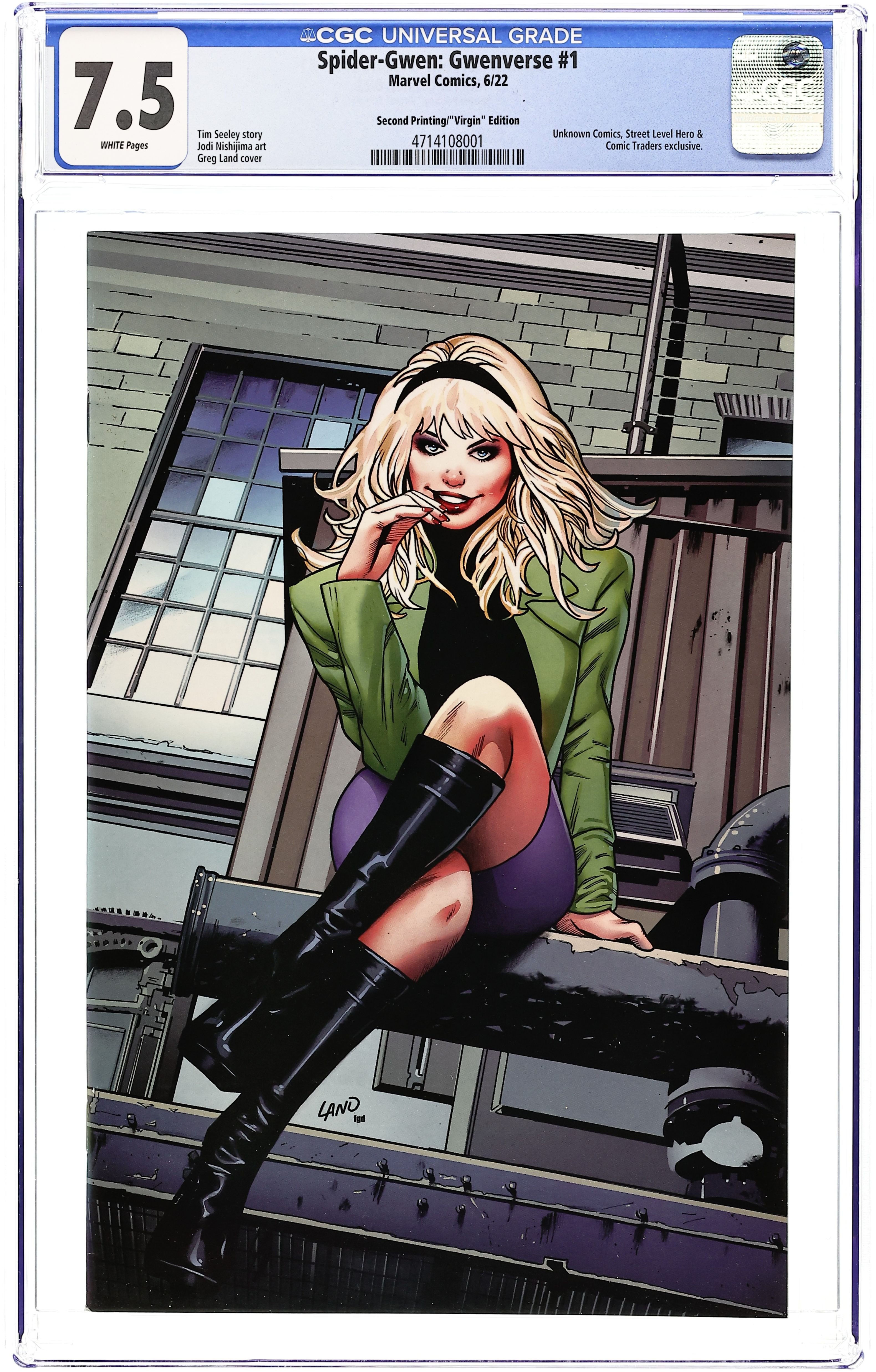 Comics Illuminati (Unknown Comics, Street Level Hero, and Comic Traders) Exclusive Virgin Cover by Greg Land. Written by Tim Seeley. Art by Jodi Nishijima. MEET THE CAPTAIN AMERICA OF 1954...GWEN STACY! Ghost Spider's time-traveling/dimension-hopping mission continues! Gwen has landed in her universe's 1954...so then how can there be someone running around with her face, carrying Captain America's shield?! 28 pages, full color. RATED T+