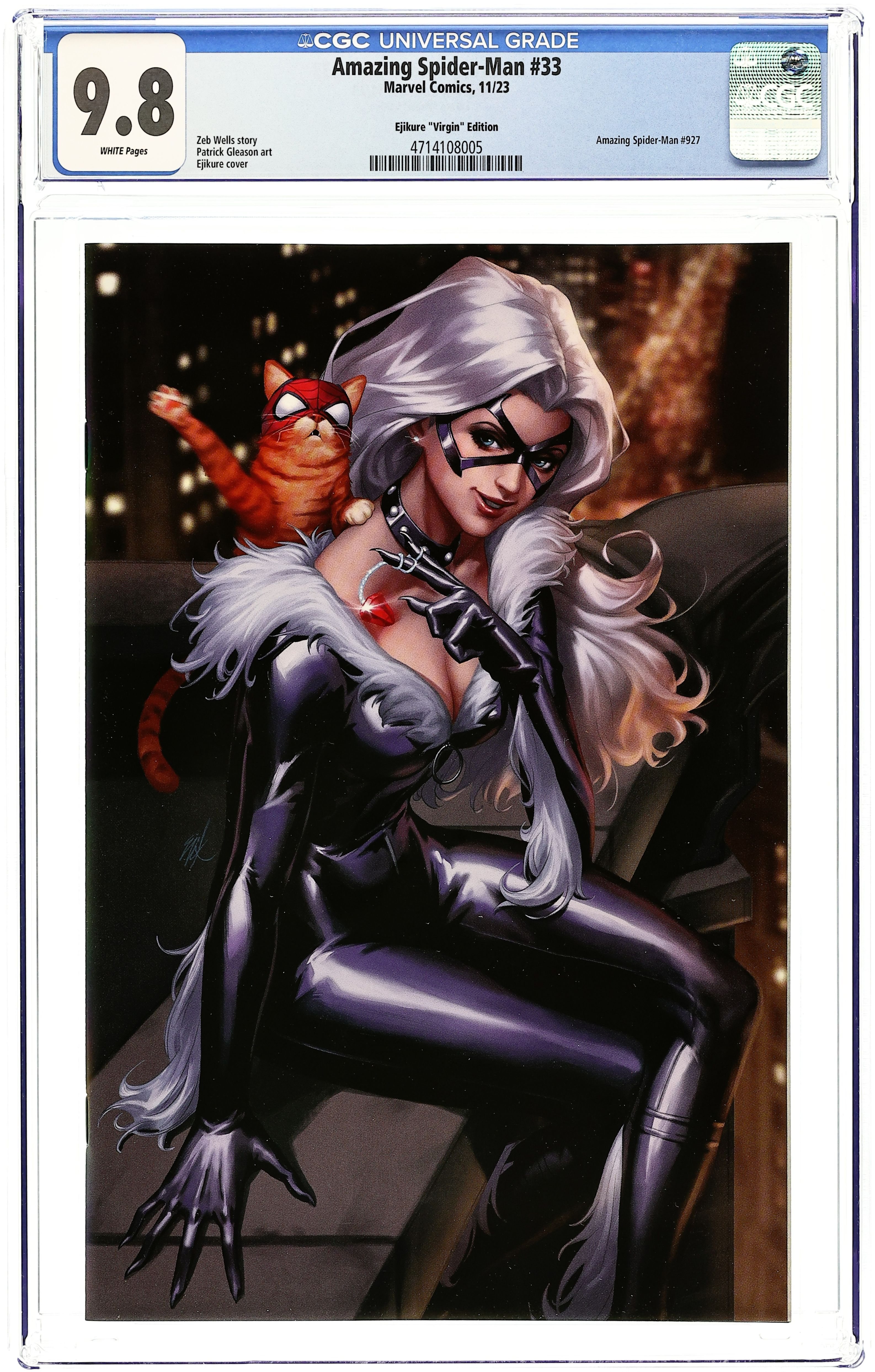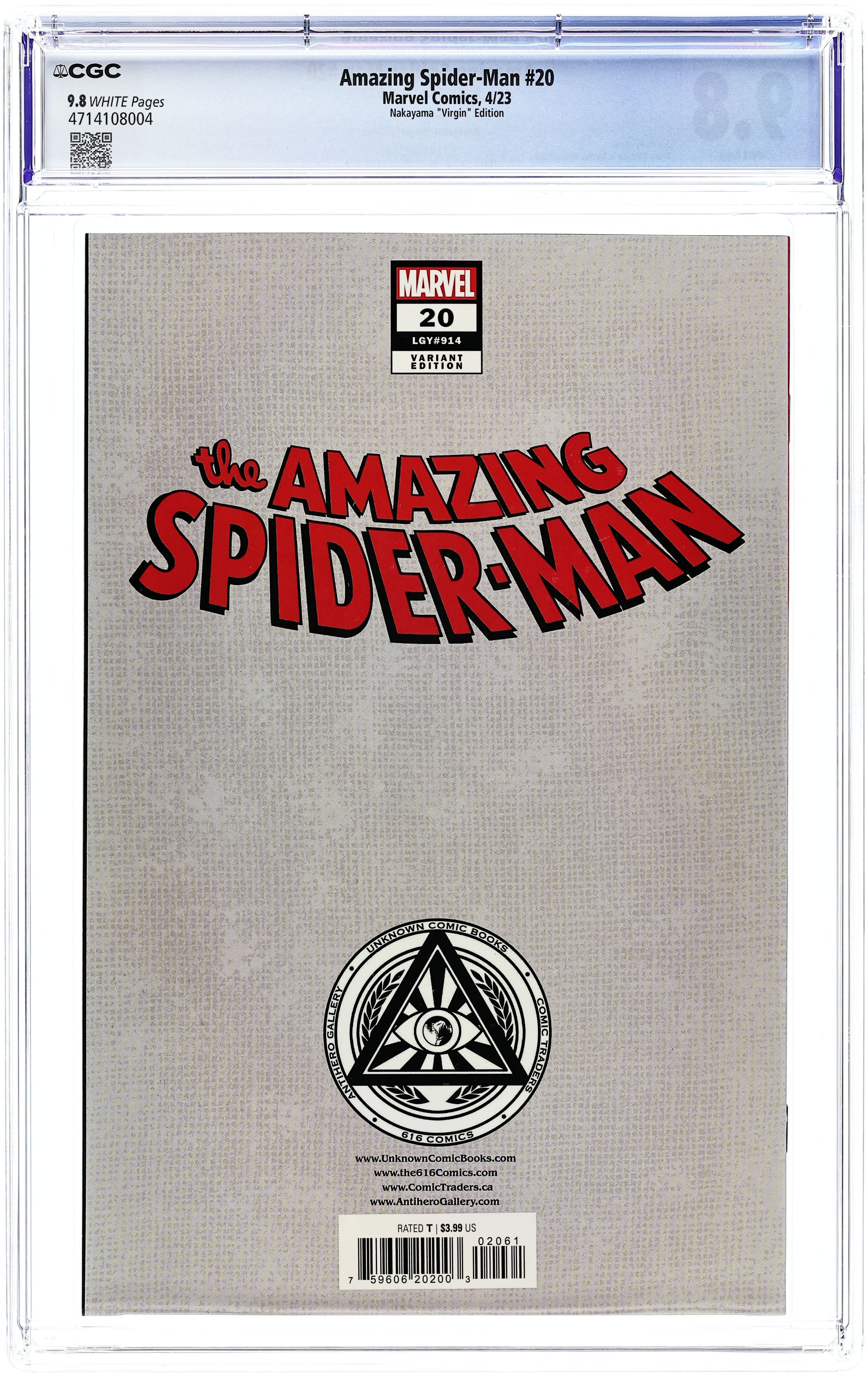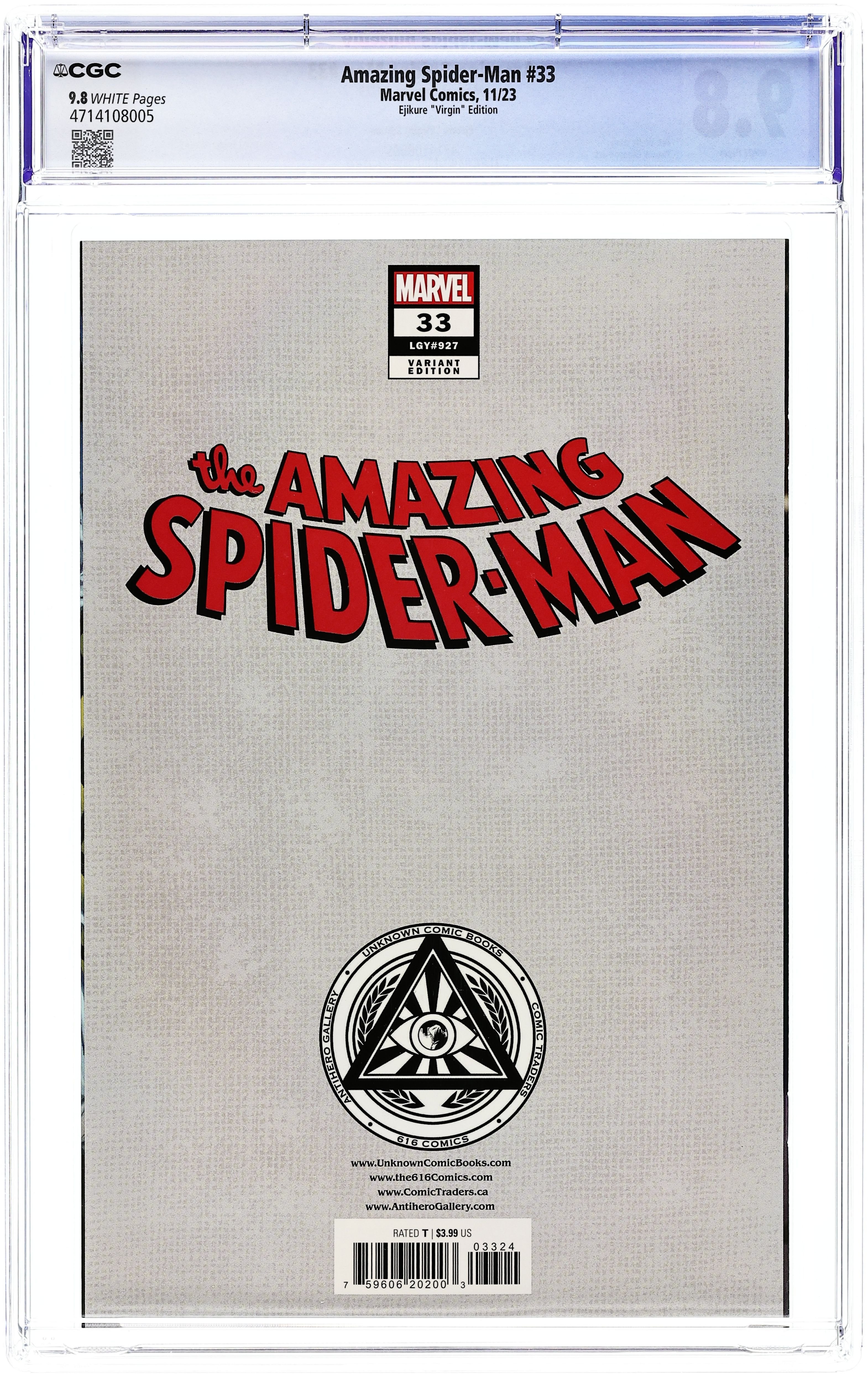 Comics Illuminati (Unknown Comics, Comic Traders, and Sleeping Giant) Exclusive Virgin Cover by Ejikure. Written by Zeb Wells. Art by Emilio Laiso. Cover by Luciano Vecchio. The last arc nearly killed Spider-Man (others weren't so lucky). Peter hopes to take a breath but gets a new challenge to face in this, the 949th legacy issue of AMAZING SPIDER-MAN! This is the last domino to fall as we head into our next big centennial! 32 pages, full color. Rated T