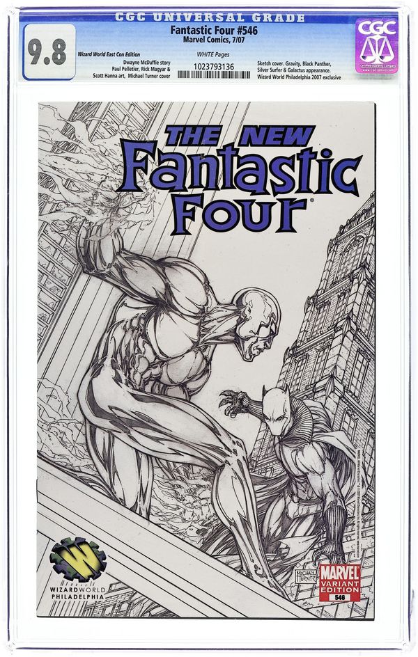 Wizard World Philadelphia '07 variant sketch cover. Written by DWAYNE MCDUFFIE Penciled by PAUL PELLETIER Cover by MICHAEL TURNER The Fantastic Four is helpless against the cosmic power of Epoch. The Black Panther goes one-on-one vs. The Silver Surfer. And oh, yeah, there's a new Protector of the Universe and he's got a bone to pick with Galactus. 32 PGS./Rated A