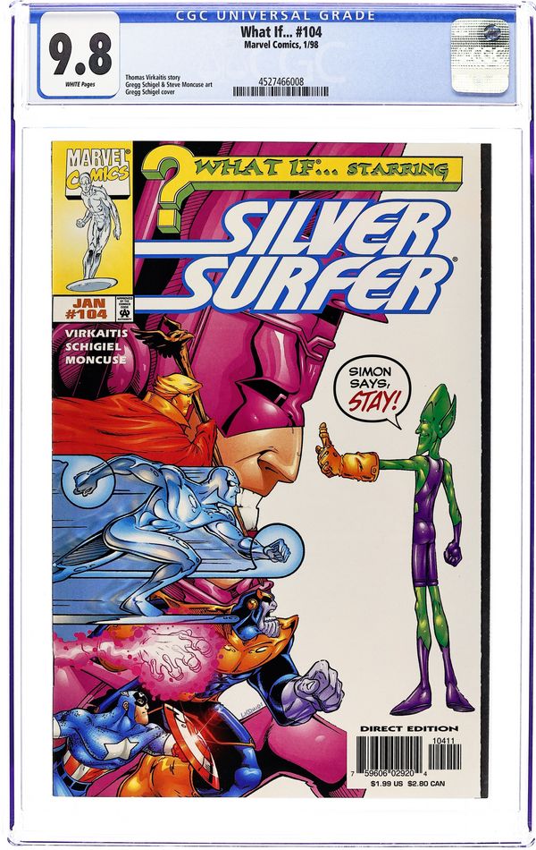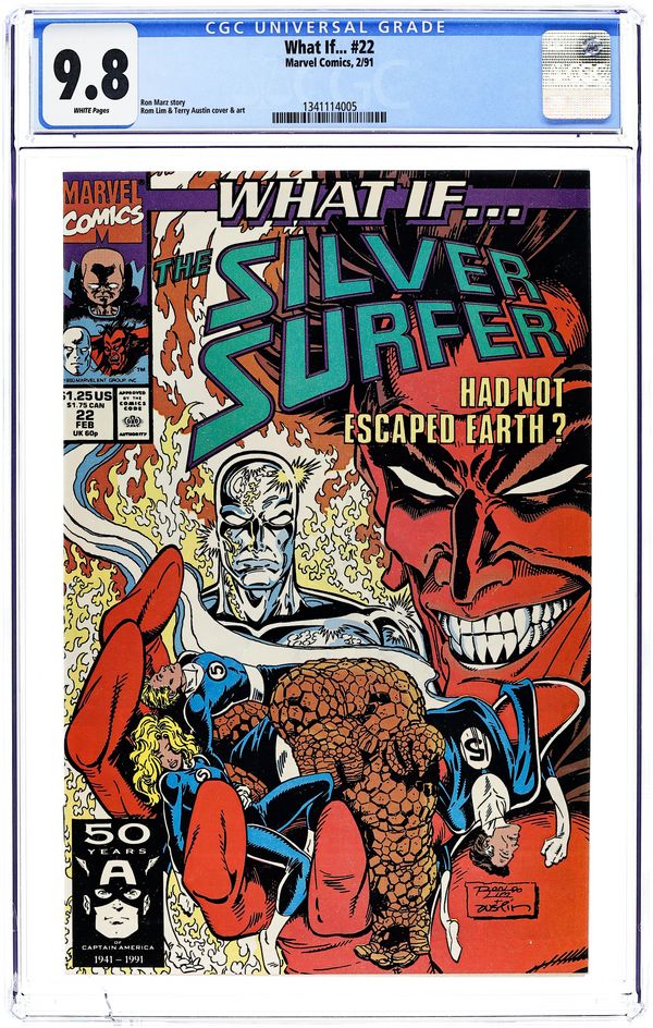 "What If the Silver Surfer Had Not Escaped Earth?" Script by Ron Marz, pencils by Ron Lim, inks by Terry Austin. Guest starring the Fantastic Four and Mephisto. Cameos by Thanos, Galactus, the Destroyer, Doctor Doom, Captain America, and the Punisher. Lim/Austin cover. Cover price $1.25.