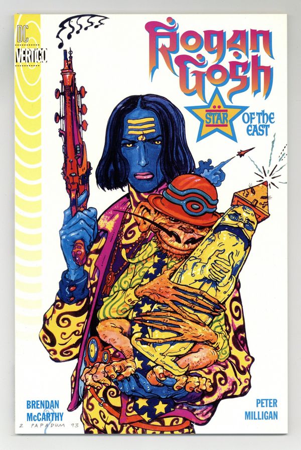 Published 1994 by DC/Vertigo.$19.00Slip the bounds of Reality; let fall the veils of Illusion; see the Truth and enter the world of ROGAN GOSH. Be prepared for the experience of a lifetime as one of the most dazzlingly original comics ever published makes its North American debut. ROGAN GOSH is a psychedelic adventure through Rudyard Kipling's opium dreams, past modern-day London, and into a futuristic India where an extraordinary creature called Rogan Gosh awaits. It's a story that combines Hindu mysticism with science fiction, and spiritual enlightenment with lavishly written Indian restaurant menus. Originally published as a serial in the British anthology 'Revolver,' ROGAN GOSH features a story by Brendan McCarthy and Peter Milligan. McCarthy also provides the lavish illustrations, scripted by Milligan. With a foreword by McCarthy and an afterword by Milligan, along with never-seen character sketches, this 56-page one-shot will mesmerize any reader looking for a comic-book experience beyond the norm. Painted cover by McCarthy. Suggested for Mature Readers. Contains strong language. Prestige Format. Cover price $6.95.