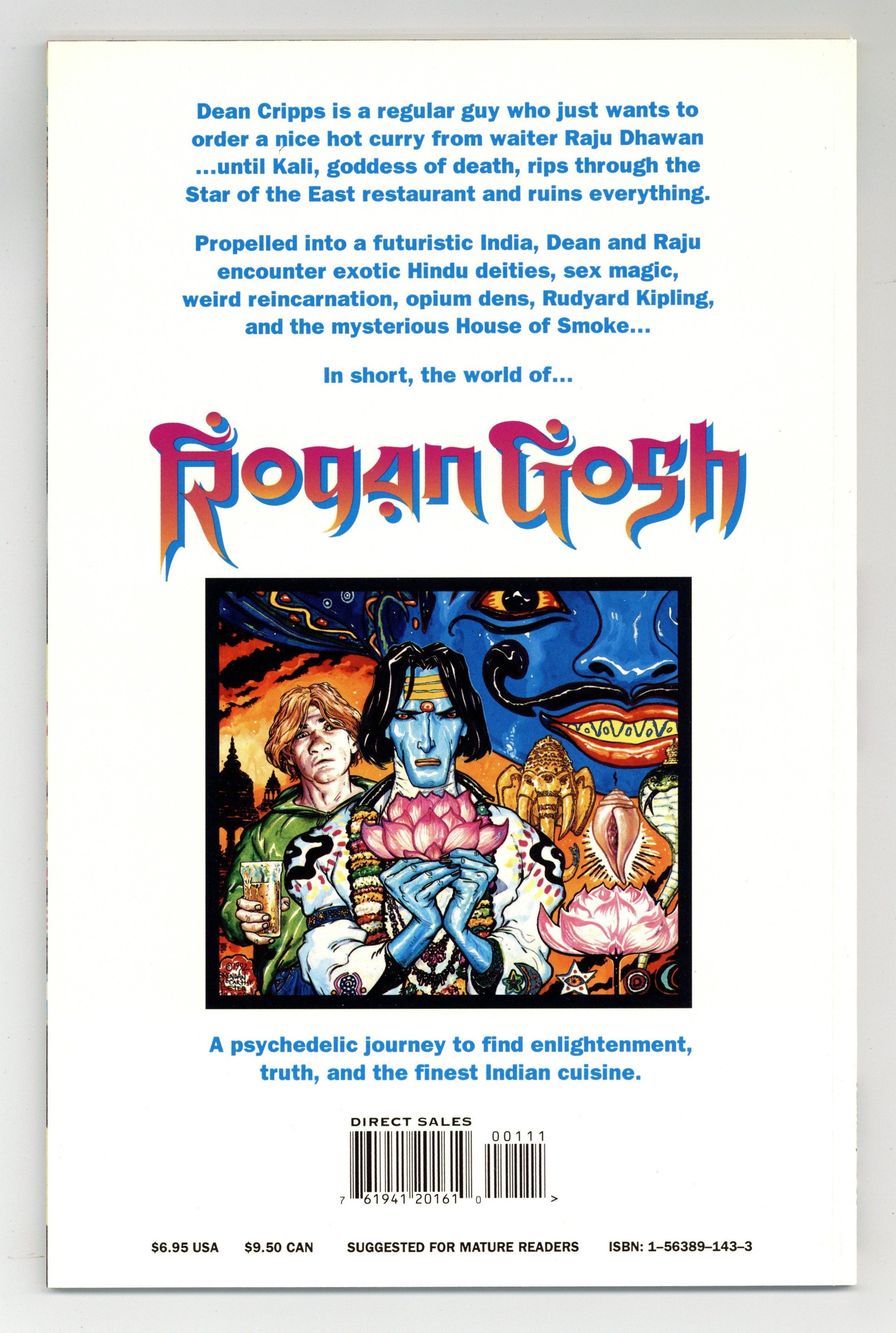 Published 1994 by DC/Vertigo.$14.00Slip the bounds of Reality; let fall the veils of Illusion; see the Truth and enter the world of ROGAN GOSH. Be prepared for the experience of a lifetime as one of the most dazzlingly original comics ever published makes its North American debut. ROGAN GOSH is a psychedelic adventure through Rudyard Kipling's opium dreams, past modern-day London, and into a futuristic India where an extraordinary creature called Rogan Gosh awaits. It's a story that combines Hindu mysticism with science fiction, and spiritual enlightenment with lavishly written Indian restaurant menus. Originally published as a serial in the British anthology 'Revolver,' ROGAN GOSH features a story by Brendan McCarthy and Peter Milligan. McCarthy also provides the lavish illustrations, scripted by Milligan. With a foreword by McCarthy and an afterword by Milligan, along with never-seen character sketches, this 56-page one-shot will mesmerize any reader looking for a comic-book experience beyond the norm. Painted cover by McCarthy. Suggested for Mature Readers. Contains strong language. Prestige Format. Cover price $6.95.