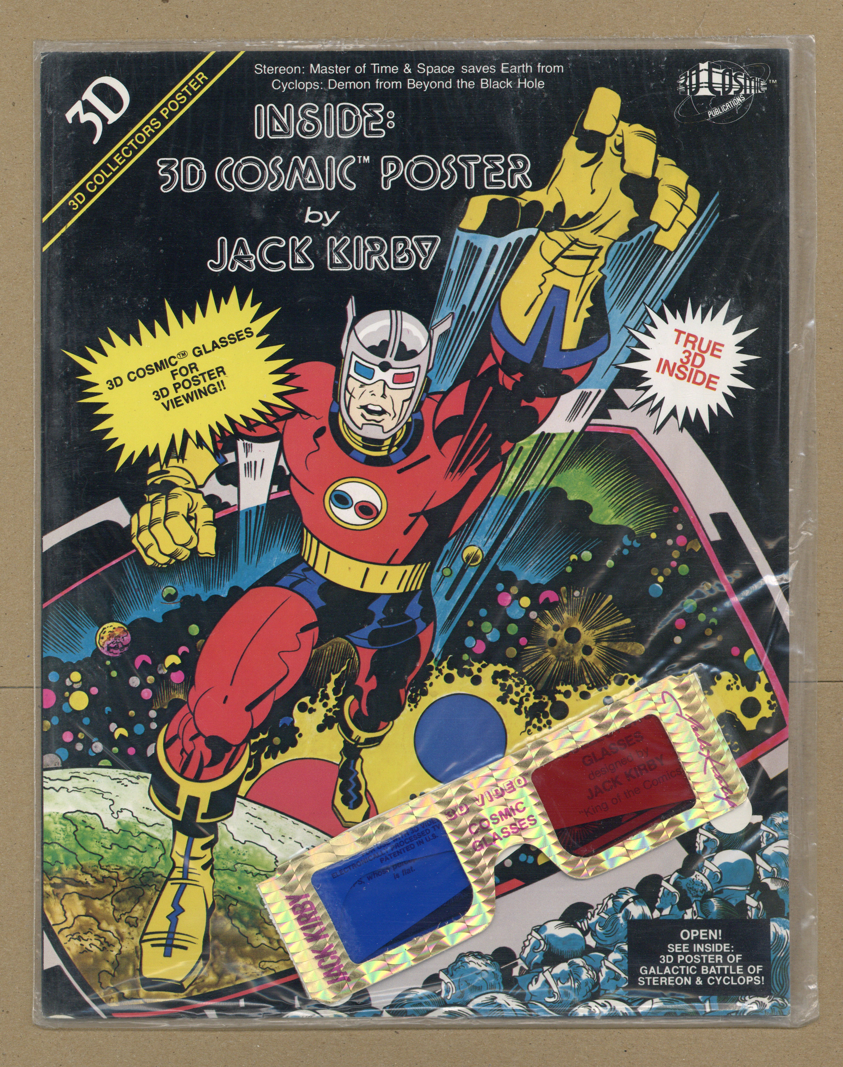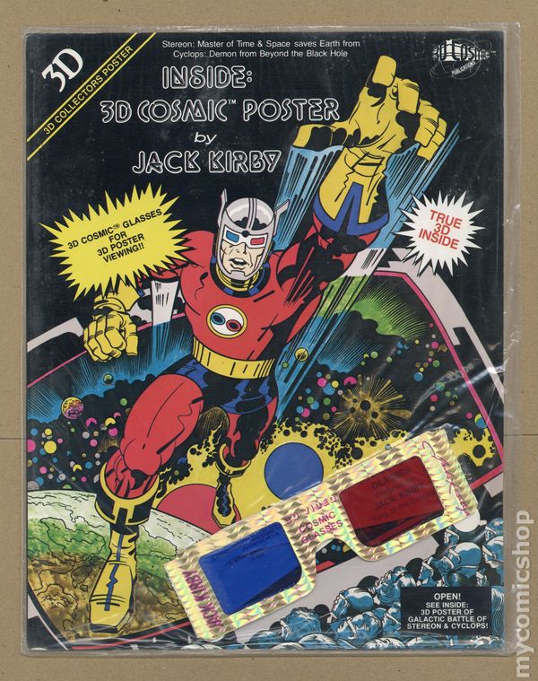Tags: 3-D Comic$5.003D Collector's Poster by Jack Kirby. "Galactic Battle of Stereon and Cyclops and featuring Jack Kirby 3D Cosmic Glasses." Back says "Coming Soon! 3D Cosmic Book by Jack Kirby Featuring: The Battle for a Three Dimensional World Stereon vs. Cyclops." No original cover price. Includes glasses; 11"x17" poster.