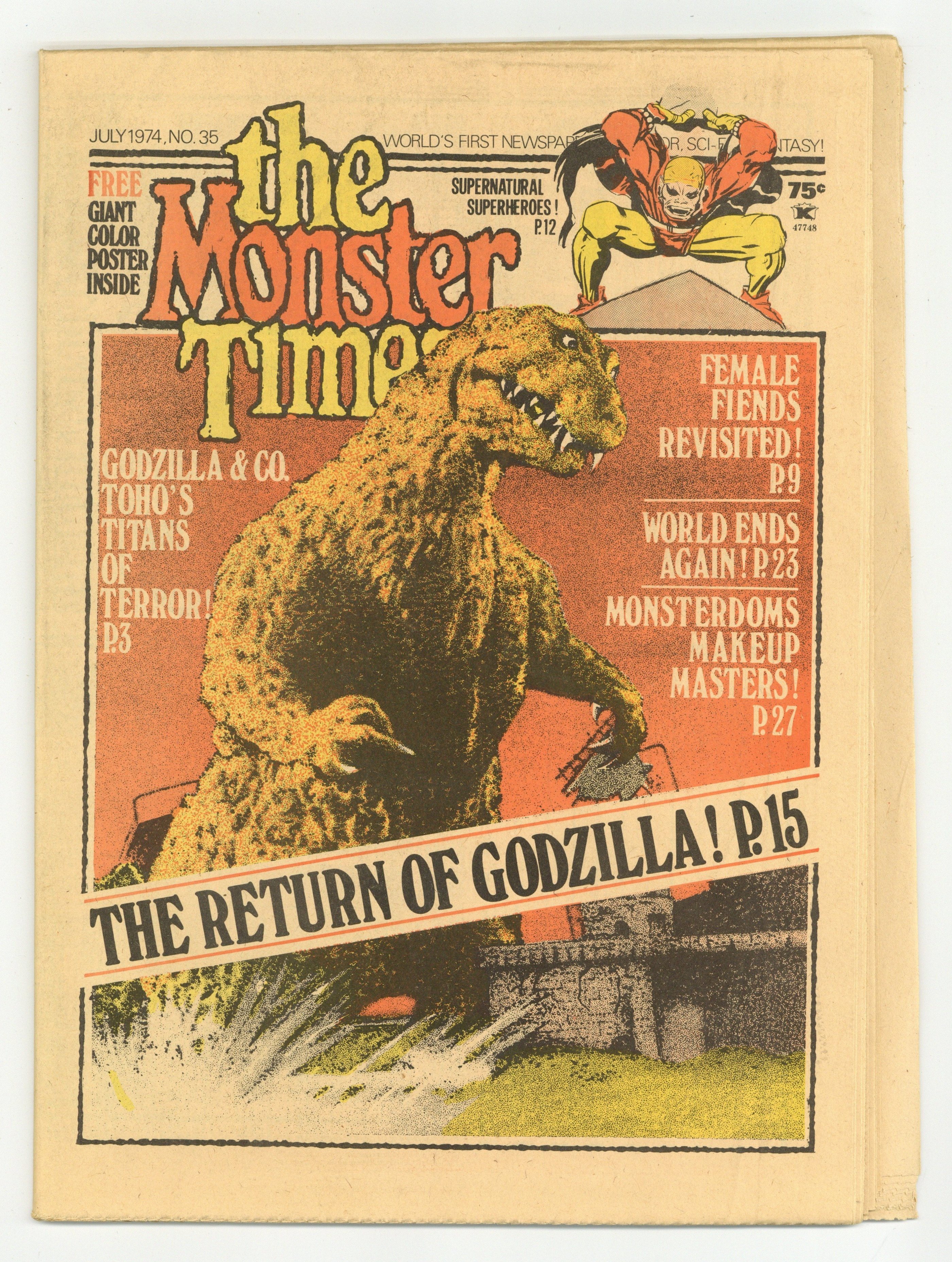 No. 35 - July 1974. The World's First Newspaper of Horror, Sci-Fi and Fantasy! This issue: The Return of Godzilla! Godzilla & Co. - Toho's Titans of Terror! Supernatural Superheroes! Female Fiends Revisited! World Ends Again! Monsterdom's Makeup Masters! Plus - Free Giant Color Poster Inside. 11.5" x 16.5", 32 pages, B&W. Cover price $0.75.