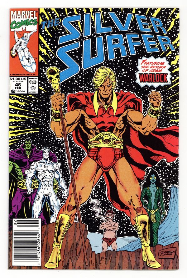 Mark Jeweler Advertisement Insert Variant. "...The Soul World!" Featuring the return of Adam Warlock. Guest-starring Drax the Destroyer. Story by Jim Starlin. Art by Ron Lim and Tom Christopher. Utterly defeated by Thanos, the Silver Surfer and Drax the Destroyer awaken in the mysterious Soul World. While, Drax is kept busy by Gamora, the most dangerous woman in the universe, Norrin Radd seeks the council of the master of this realm...the enigmatic Adam Warlock. 32 pages. Cover price $1.00.