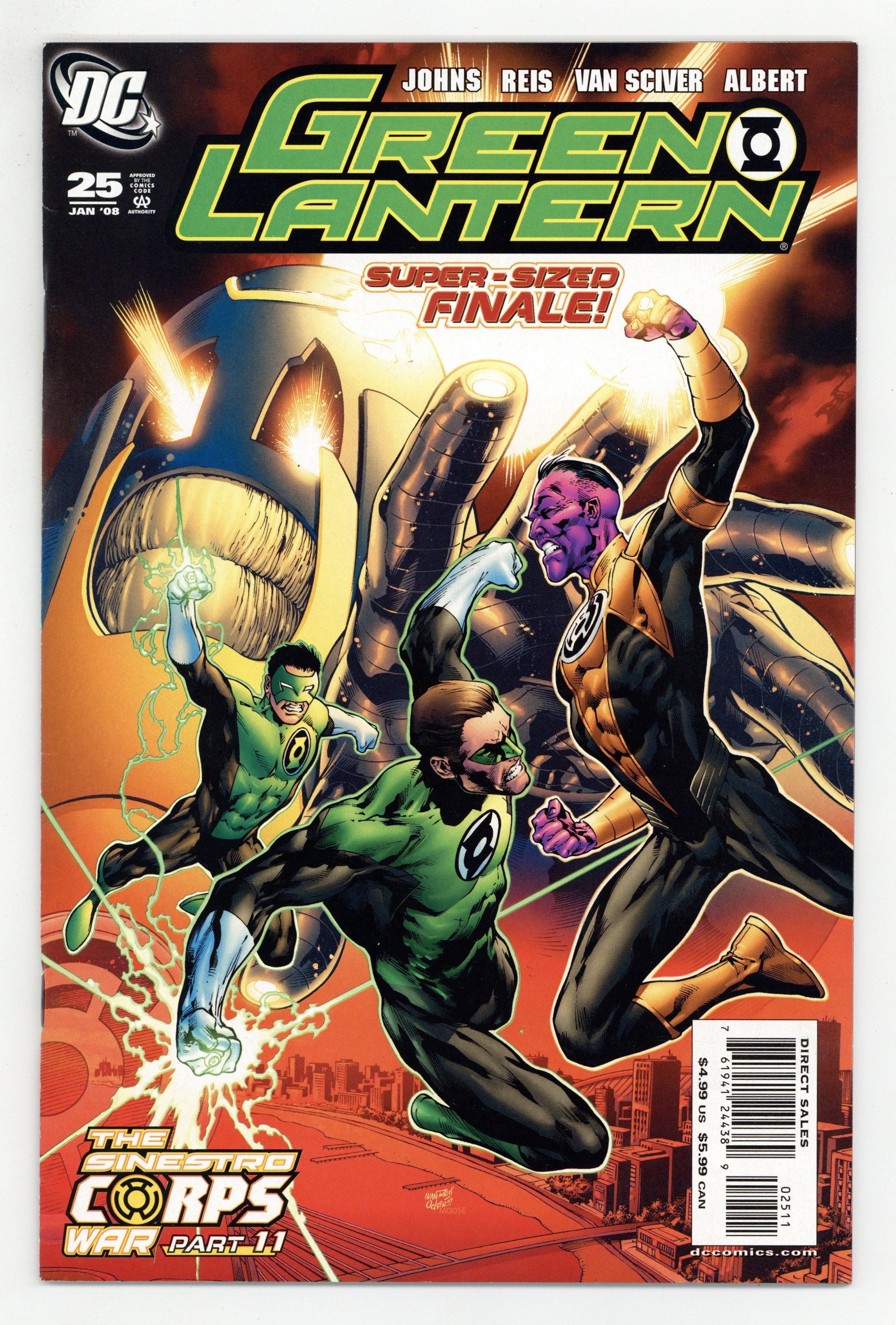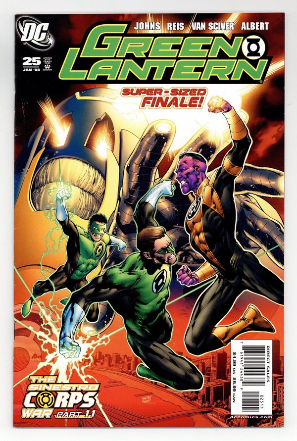 Direct Edition. Cover by Ivan Reis. Sinestro Corps War: Part 11 - Written by Geoff Johns Art by Ivan Reis, Ethan Van Sciver & Oclair Albert This is it! The most talked-about storyline of the summer, 'The Sinestro Corps War,' concludes in this double-sized anniversary issue! Why does Sinestro believe he has won? How will Hal Jordan stop his greatest enemy? What is the truth behind the prophecy of 'The Blackest Night'? Where will the end results of this battle take the Green Lantern Corps? What is the bizarre fate of the Anti-Monitor? Why has Earth been assigned so many Green Lanterns? Learn all the secrets! Witness all the battles! Prepare yourself for the startling ending of the greatest epic in the history of Green Lantern! Cover price $4.99.
