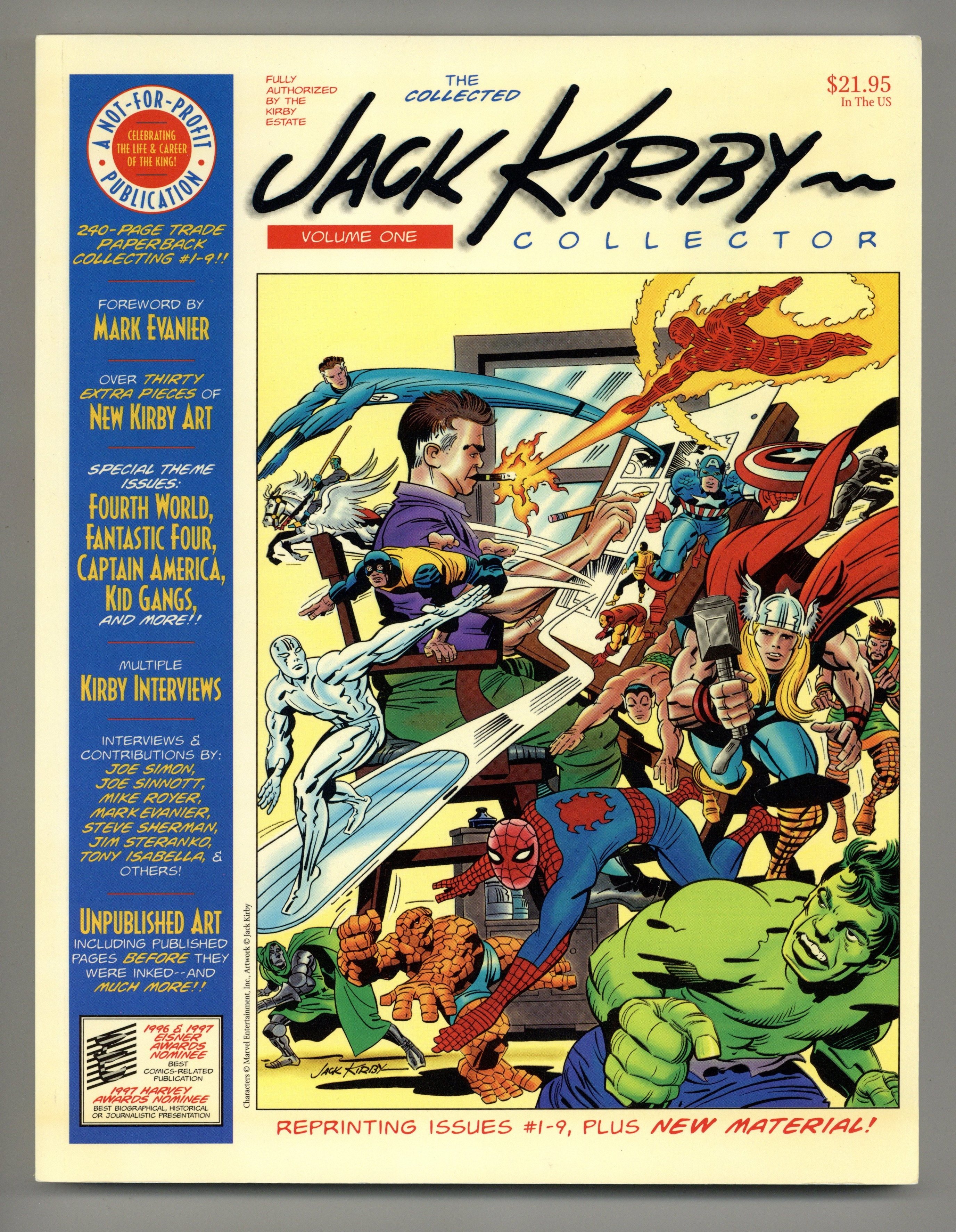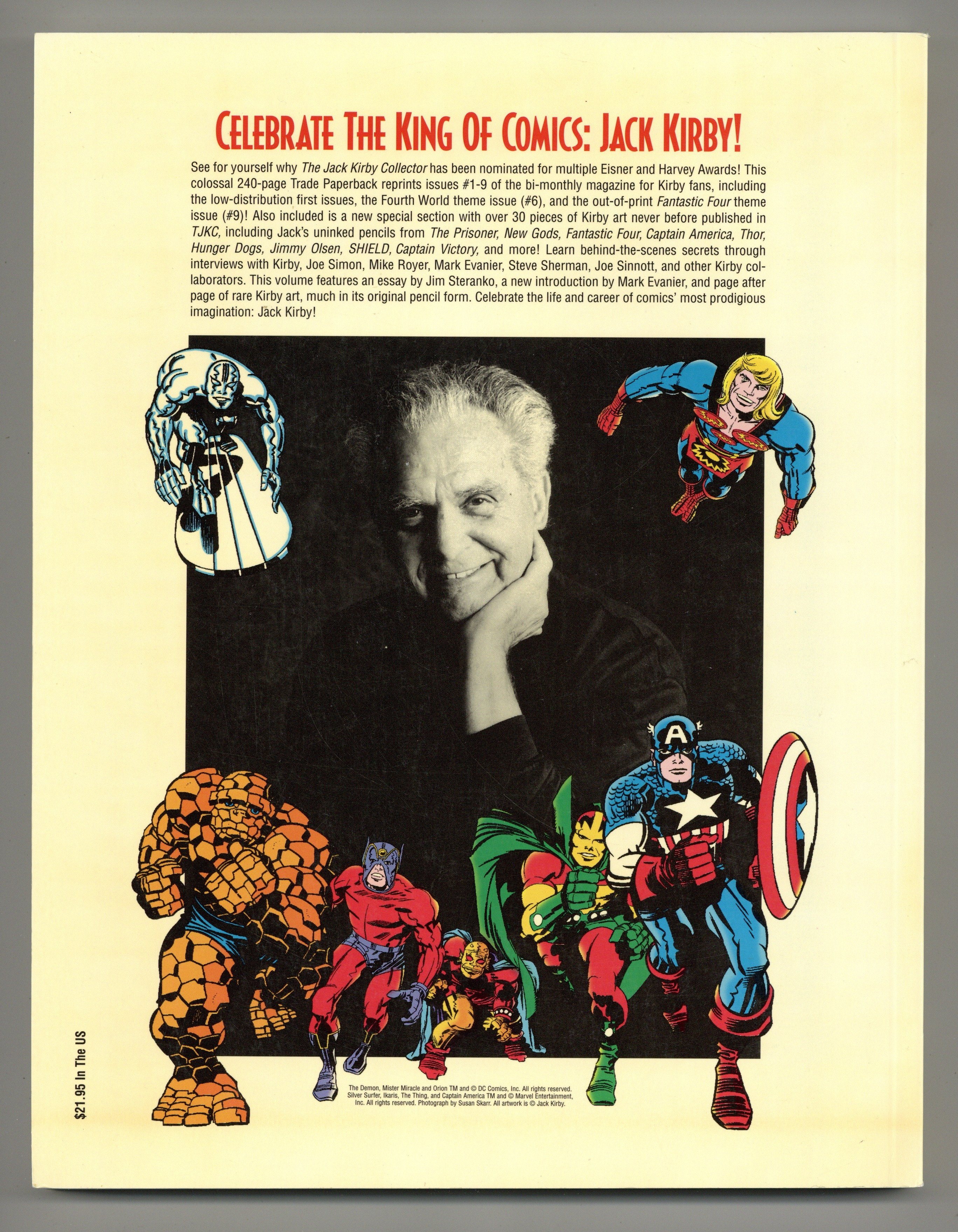 Published 1999 by TwoMorrows.$37.00Volume 1 - 1st printing. Collects Jack Kirby Collector (1994) #1-9. This colossal trade paperback collects the bi-monthly magazine for Kirby fans, including the low distribution first issues, the Fourth World theme issue (#6), and the out-of-print Fantastic Four theme issue (#9). Also included is a new special section with over 30 pieces never-before published Kirby art including convention sketches, animation concepts, and Jack's uninked pencils from The Prisoner, New Gods, Captain America, Thor and, a new introduction by Mark Evanier. Softcover, 8 1/2-in. x 11-in., 240 pages, B&W. Cover price $21.95.
