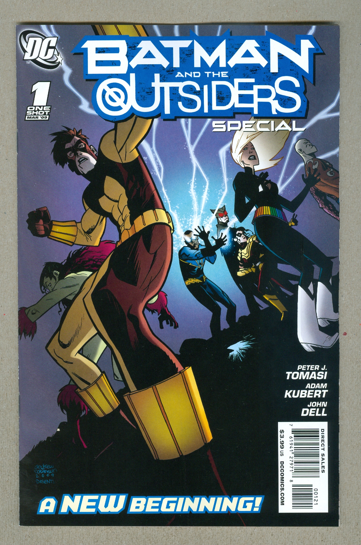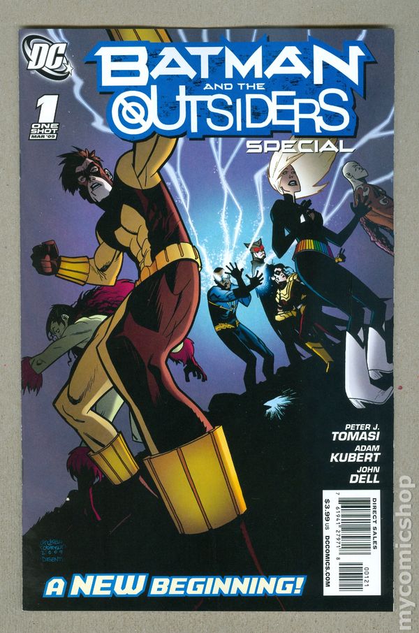 Variant cover by Andrew Robinson. Batman R.I.P.: Aftermath - Written by Peter J. Tomasi Art by Adam Kubert & John Dell. Spinning out of 'Batman R.I.P.' and DC UNIVERSE: LAST WILL AND TESTAMENT, this special features the birth of a new era for the Outsiders and is a perfect entry point for past and present readers alike. FINAL CRISIS has changed the universe forever and though Batman may be gone, his legacy must endure. Forces are set in motion that give rise to a new team ready to combat the secret evil that the Outsiders were truly formed for all those years ago. Is Geo-Force the best leader? Or will Black Lightning prove to be a challenger? Plus, the introduction of a never-before-seen character important to the Batman mythos! Writer Peter J. Tomasi (GREEN LANTERN CORPS, NIGHTWING) is joined by Adam Kubert (DCU: LAST WILL AND TESTAMENT) for this extra-length one-shot spectacular, which is the opening chapter of an epic storyline that will continue within the pages of February's THE OUTSIDERS #15! On sale January 21 ? 40 pg, FC, $3.99 US Cover price $3.99.