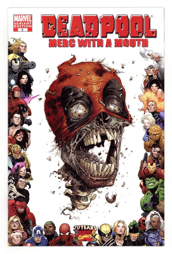 Limited (1 for 10) 70th Frame Variant Cover by TONY MOORE. Head Trip: Part 2 - Written by VICTOR GISCHLER. Art by BONG DAZO. It's the Merc with two mouths! It's the Dawn of the Living Deadpool! It's...oh, you get the point. Crash-landing in the Savage Land, Deadpool finds himself face-to-face with the last thing on Earth he ever expected to see: his own Zombiefied head! To make matters worse, the nasty little critter went ahead and bit a few of the locals, so Deadpool has to put the smackdown on some zombie cavemen if he's going to have any chance at escaping and completing his mission. Did we mention that a crack team of Hydra mercenaries are waiting in the wings? 32 pages. Parental Advisory Cover price $2.99.