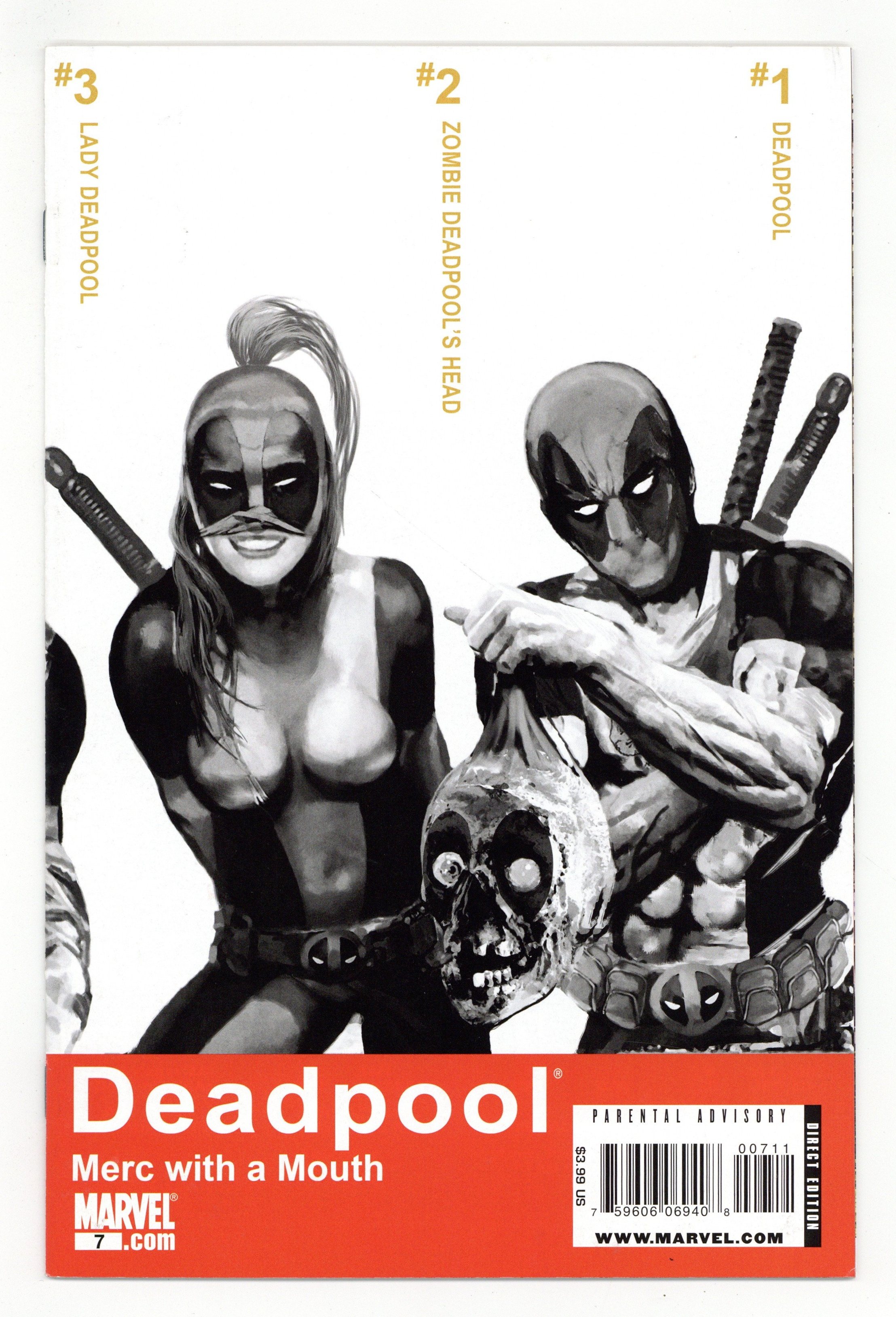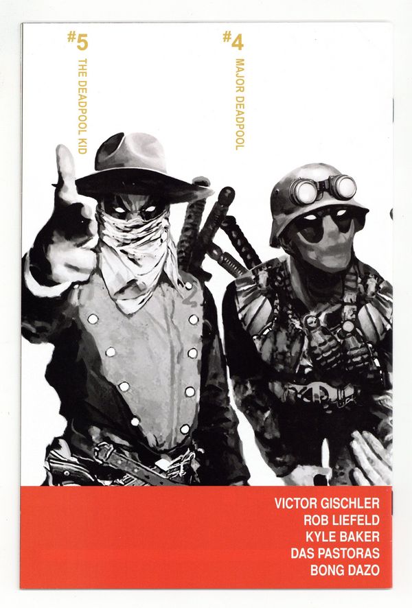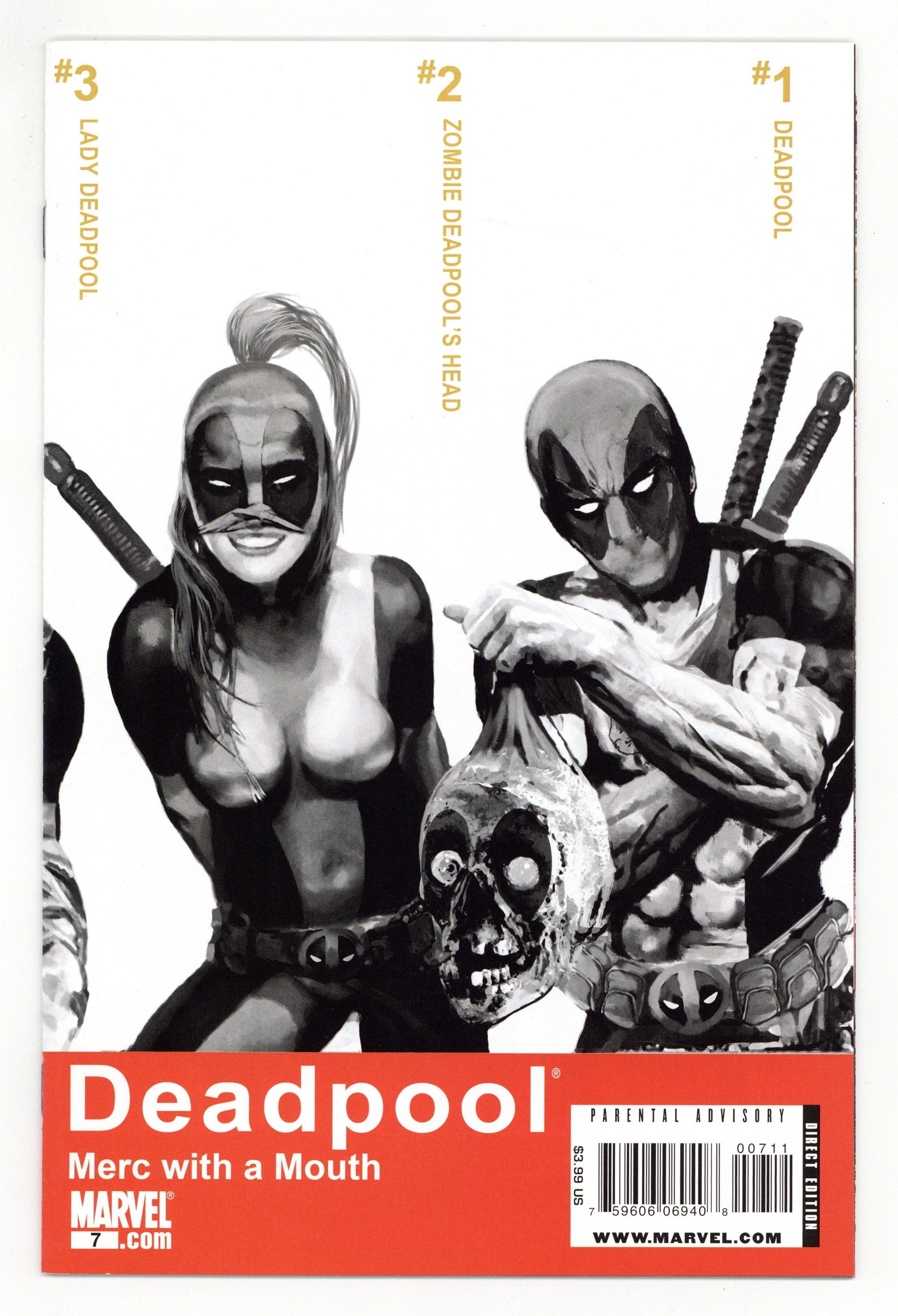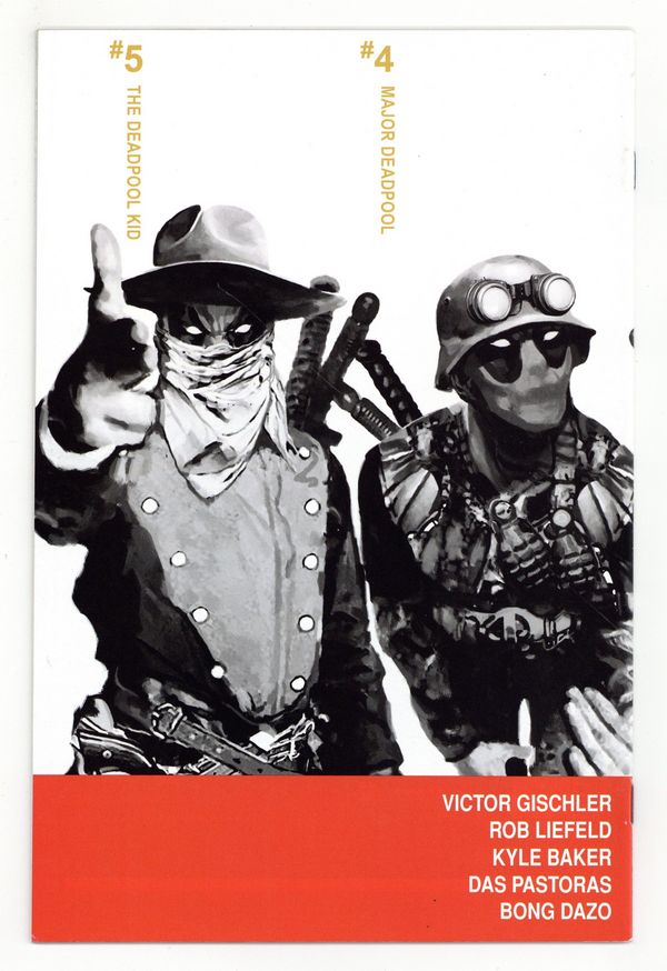 Wraparound Cover by ARTHUR SUYDAM. Written by VICTOR GISCHLER. Art by ROB LIEFELD, KYLE BAKER, DAS PASTORAS and BONG DAZO. 'ARE YOU THERE, DEADPOOL? IT'S ME DEADPOOL.' Special double-sized issue with art by ROB LIEFELD, KYLE BAKER, DAS PASTORAS and regular series artist BONG DAZO. What do you do with a homesick zombie head? Take it back to the zombie universe, of course! Hopping through an interdimensional portal in the Florida swamp with Headpool tucked under his arm, Deadpool soon finds himself bouncing through a series of outlandish alternate realities, each more warped than the last. Wade Wilson, say hello to Major Deadpool, the Deadpool Kid and - va-va-voom - Lady Deadpool. 40 pages, full color. Cover price $3.99.