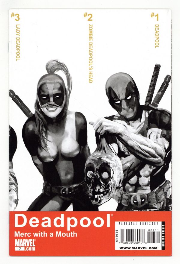 $60.00Wraparound Cover by ARTHUR SUYDAM. Written by VICTOR GISCHLER. Art by ROB LIEFELD, KYLE BAKER, DAS PASTORAS and BONG DAZO. 'ARE YOU THERE, DEADPOOL? IT'S ME DEADPOOL.' Special double-sized issue with art by ROB LIEFELD, KYLE BAKER, DAS PASTORAS and regular series artist BONG DAZO. What do you do with a homesick zombie head? Take it back to the zombie universe, of course! Hopping through an interdimensional portal in the Florida swamp with Headpool tucked under his arm, Deadpool soon finds himself bouncing through a series of outlandish alternate realities, each more warped than the last. Wade Wilson, say hello to Major Deadpool, the Deadpool Kid and - va-va-voom - Lady Deadpool. 40 pages, full color. Cover price $3.99.
