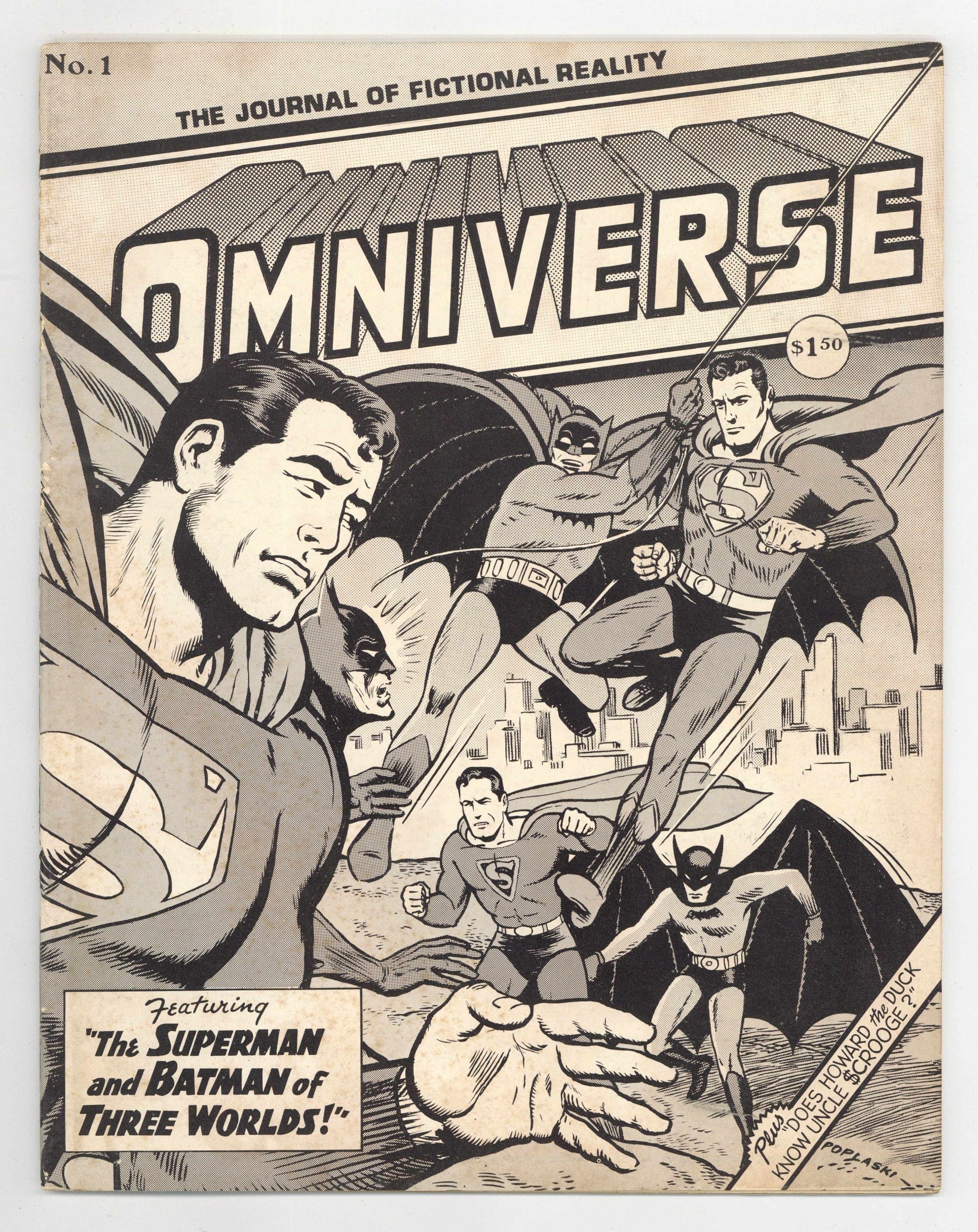 Onniverse (1977) is a fanzine published by Alternity Enterprises and edited by Mark Gruenwald. 8.5 x 10.5; black and white; 40 pages. Articles: "Howard the Duck Never Read the Duckburg Chronicle," "Sizing Up the Micro Worlds" (discussing the Atom, Ant-Man, and others), book and comics reviews, "Reality Spotlight on the Flash," "Phenomenal Relationships Among DC's Reality Lines," and "Marvel Omnipotents and Omniversal Awareness." Writers include Frank Lovece, Dean Mullaney, Kim Thompson, and others. Illustrations by Willie Blybert, Rich Bruning, Dennis Jensen, Jerry Ordway, Neal Pozner, and others. Pete Poplaski cover. Cover price $1.50.