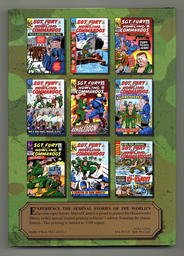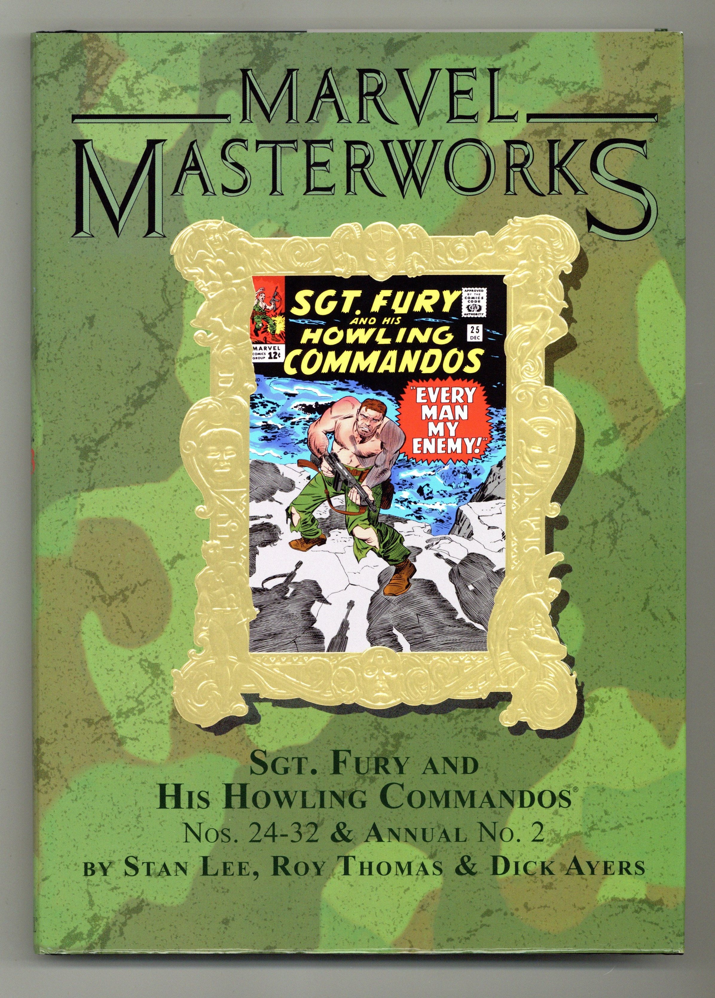 Volume 143 - 1st printing. "Sgt. Fury!" Collects Sgt. Fury (1964-1981) #24-32 and Annual #2. Written by STAN LEE and ROY THOMAS. Art by DICK AYERS. Cover by JACK KIRBY. Report for duty! It's time for another Marvel Masterworks mission with Sgt. Nick Fury and his Howling Commandos! It's all-out action against the Axis powers, done in the Mighty Marvel Method as Fury and the Howlers protect the Manhattan Project and the atom bomb against Nazi spies and saboteurs; uproot an undercover agent who is none other than Red Skull; confront a traitor in their own ranks; and go mano-a-mano with Baron Strucker in a knock-down, drag-out fight battle in war-torn France. You'll also see revealed-for the first time-the origin of Nick Fury's eye-patch, follow Dum Dum Dugan as he goes it alone behind enemy lines, and experience the Allied push when Operation Overlord comes together on D-Day! Illustrated by the fightin' man's penciller, Dick Ayers, and scripted by Stan "The Man" and his armed-forces heir apparent, Roy Thomas, it's an all-out classic. Reserve your copy today or it's gonna be K.P. duty for you! Collecting. Hardcover, 224 pages, full color. Cover price $54.99.