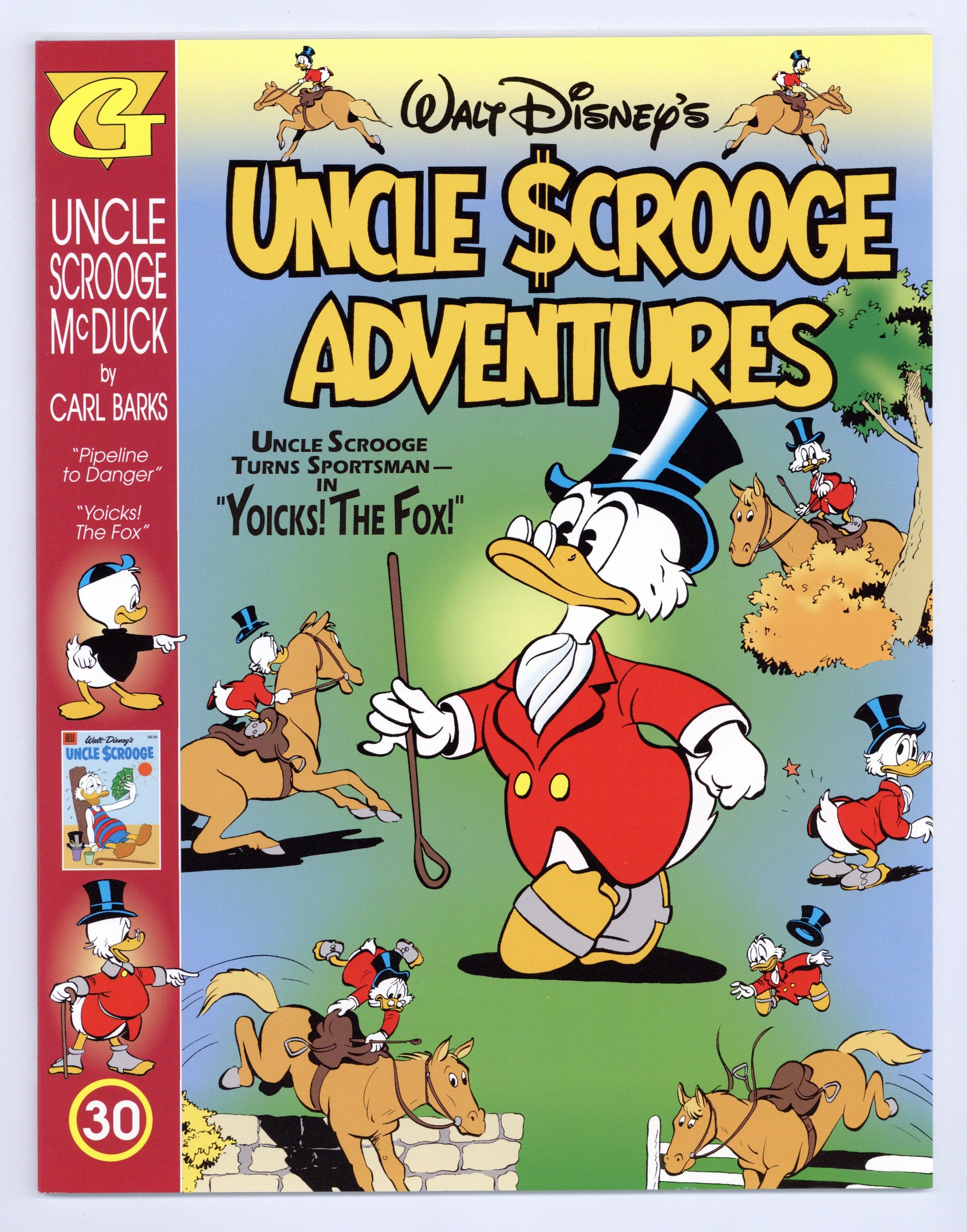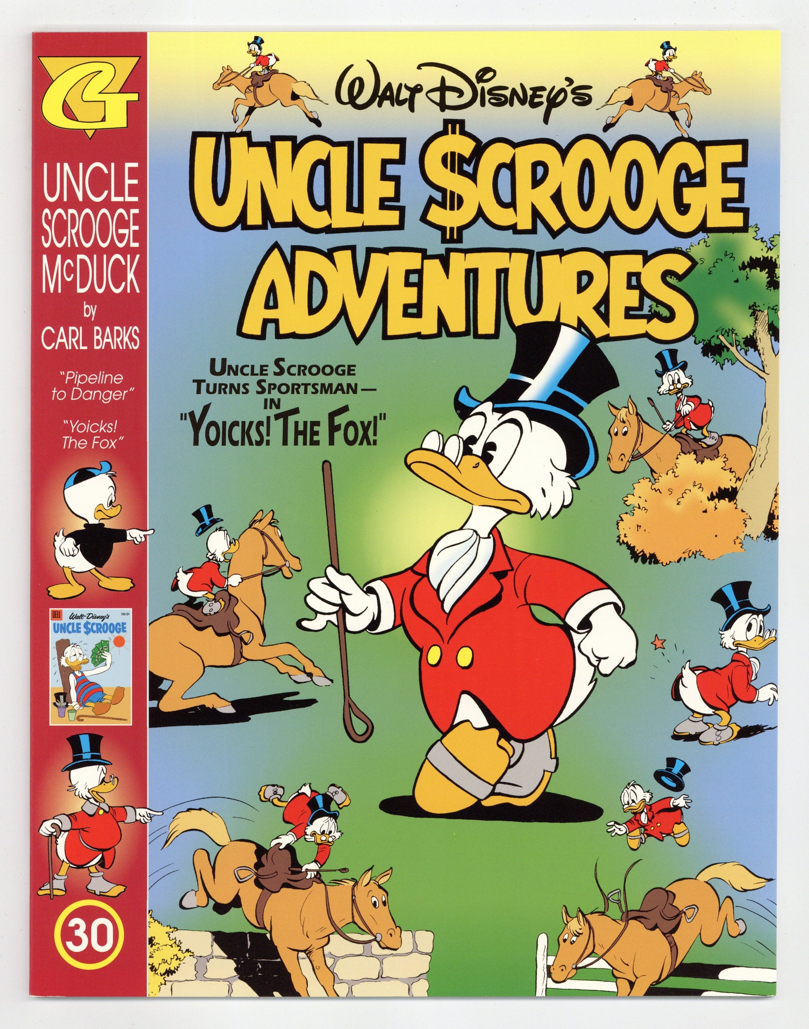 $15.00Cover by Carl Barks. Stories and art by Carl Barks, Thomas Andrae and Geoffrey Blum. Gladstone presents classic Scrooge stories by Carl Barks and behind-the-scenes articles, originally factory bagged with a trading card. Investigating strange events at Scrooge's Saharan oil wells, Scrooge, Donald, and his nephews encounter tiny desert-dwelling ducks. Scrooge must enter a fox hunt for a chance to buy Von Crankenshaft's car factory. Plus an article about Barks' stories about gold rushes. Pipeline to Danger; Yoicks! The Fox!; Tales of the Gold Rush, Part II: The Last Big Adventure. NOTE: May or may not come with trading card. 8 1/2-in. x 11-in., 32 pages, Full Color. Cover price $8.95.