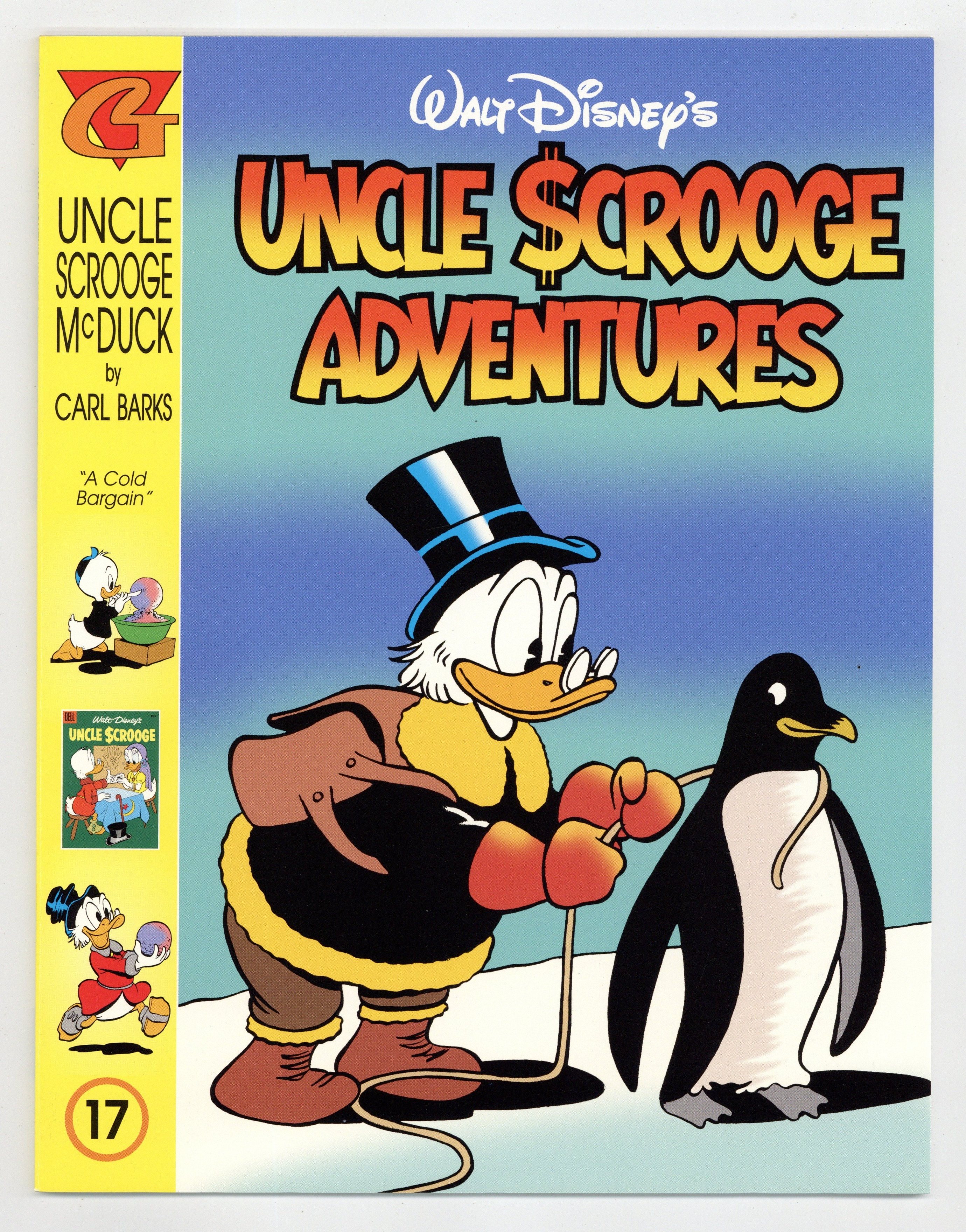 Cover by Carl Barks. Stories and art by Carl Barks and Geoffrey Blum. Gladstone presents classic Scrooge stories by Carl Barks and behind-the-scenes articles, originally factory bagged with a trading card. Scrooge purchases a rare element at auction, but to safely store it, he must travel to the South Pole, so he takes Donald and his nephews along. Plus articles about Barks' political satire in "A Cold Bargain," the portrayal of the Brutopians in the story, and Barks' cover to Uncle Scrooge #17. A Cold Bargain; The Long Arm of Brutopia; Cold War, Warm Heart; Palm It Off on Daisy. NOTE: May or may not come with trading card. 8 1/2-in. x 11-in., 32 pages, Full Color. Cover price $8.95.