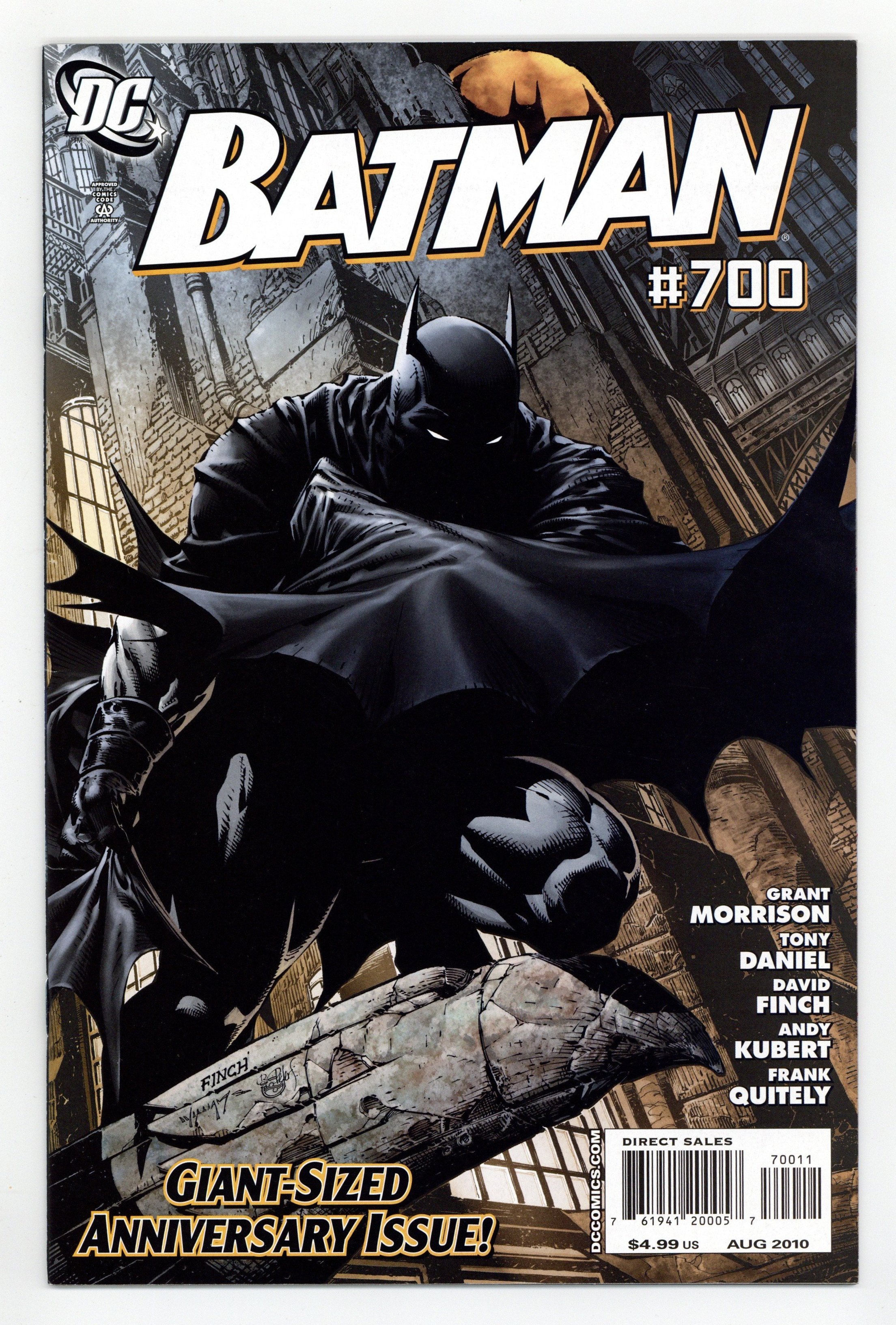 Cover by DAVID FINCH. Written by GRANT MORRISON. Art by ANDY KUBERT, TONY DANIEL, and FRANK QUITELY. Also featuring interior art contributions by DAVID FINCH, SCOTT KOLINS and RICHARD FRIEND, plus a Batman Gallery by SHANE DAVIS, JUAN DOE, GUILLEM MARCH, DUSTIN NGUYEN, TIM SALE, BILL SIENKIEWICZ and PHILIP TAN, and 'Secrets of the Batcave' with designs by FREDDIE WILLIAMS II. Grant Morrison returns to BATMAN with this oversized special! And he's brought an all-star roster of artists along with him including Andy Kubert, Tony Daniel and Frank Quitely to celebrate this milestone 700th issue featuring stories spotlighting each of the Batmen from different eras - Bruce Wayne, Dick Grayson and Damian Wayne. You won't want to miss this blockbuster story that paves the way for the return of Bruce Wayne and sports mind-boggling covers by superstars David Finch (BRIGHTEST DAY) and Mike Mignola (BATMAN: GOTHAM BY GASLIGHT, Hellboy)! 60 Pages, Full Color. Cover price $4.99.