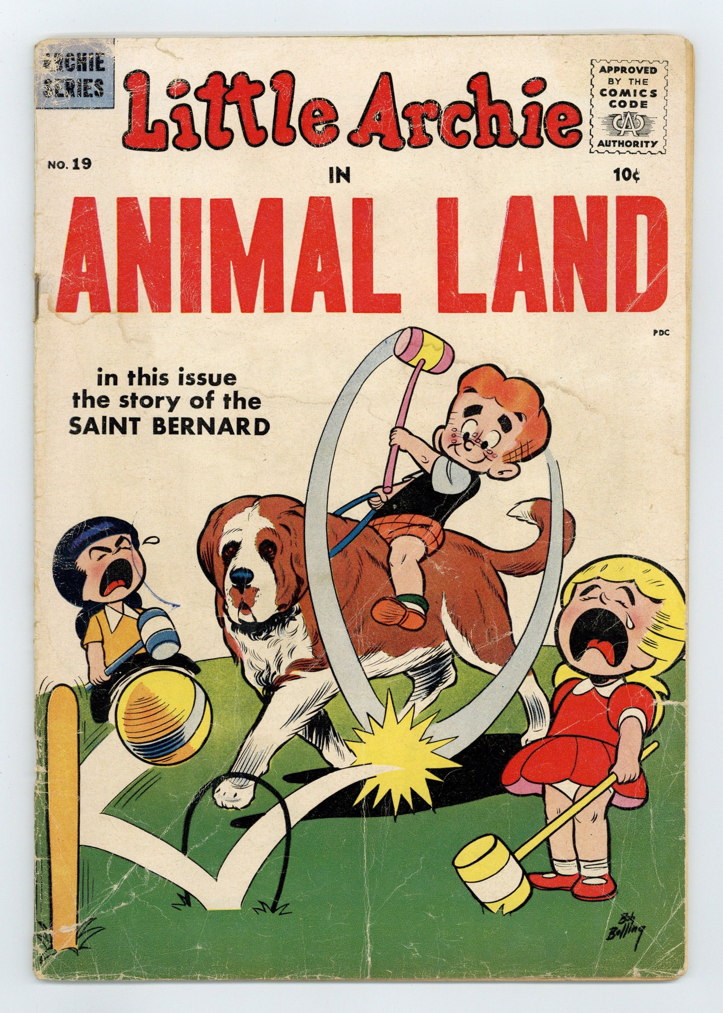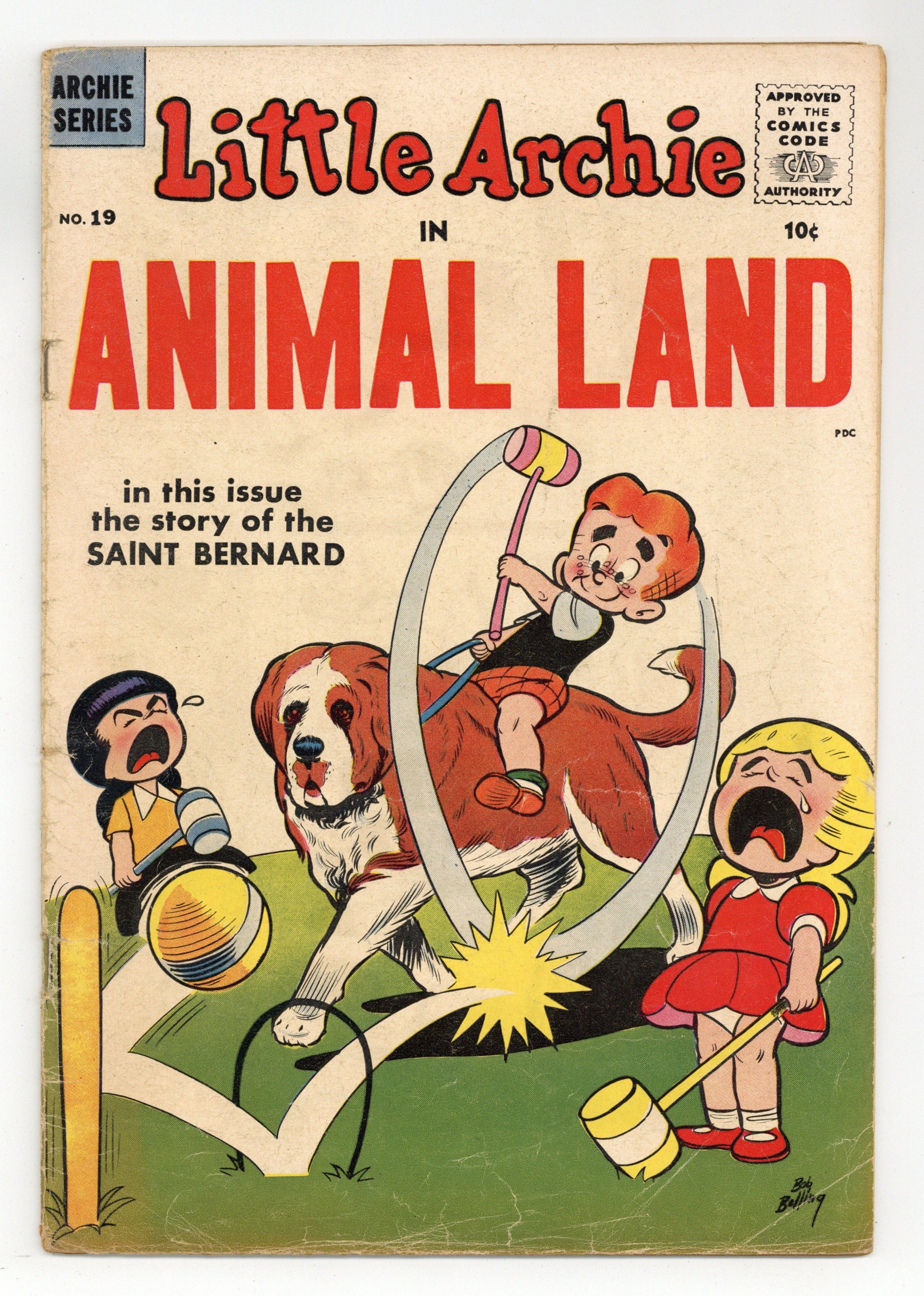 NOTE: #1 - one-shot, #17-#19 continued from Lil Jinx (1956). Cover art by Bob Bolling. Cover art by Bob Bolling. "On the Ball," script and art by Bob Bolling; The kids see a snowshoe rabbit, who gives them an idea of how Ambrose can recover a lost tennis ball. "Love That Water" one-page Li'l Jinx story by Joe Edwards. "To the Rescue," script and art by Bob Bolling; Super sleuth Ambrose tries to solve the mystery of who stole Fred's ice cubes. "Tip Trip," script and art by Samm Schwartz; Scout delivers groceries. "Fish Facts," script and art by Bob Bolling; After Little Archie's parents won't let him use Chick Cooper's diving equipment on a trip to the aquarium, he tries to use it in the bathtub. First appearance of Betty's brother Chick (sometimes spelled Chic). 36 pgs., full color. Cover price $0.10.