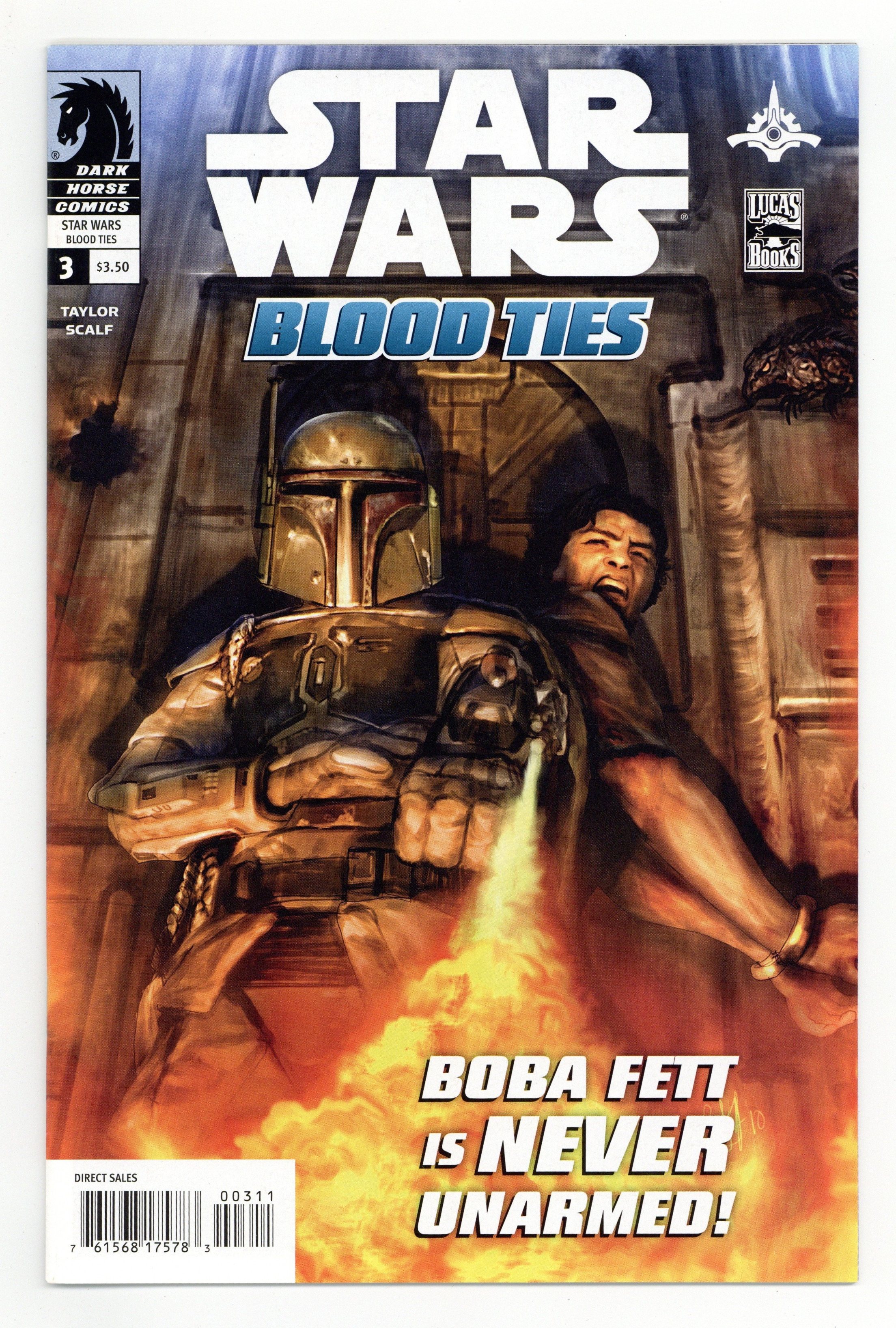 Tags: Star WarsPublished Oct 2010 by Dark Horse.$20.00STAR WARS: BLOOD TIES-A TALE OF JANGO AND BOBA FETT #3 (of 4) Tom Taylor (W) and Chris Scalf (A/Cover) On sale Oct 27 FC, 40 pages $3.50 Miniseries Boba Fett has discovered that his father left a legacy to someone Boba has never heard of. He manages to track down the man, but if he is to learn the reasons behind Jango's posthumous generosity, Boba Fett must first save the man from an army of bounty hunters who want the guy's head! Jango Fett and Boba Fett together! Cover price $3.50.