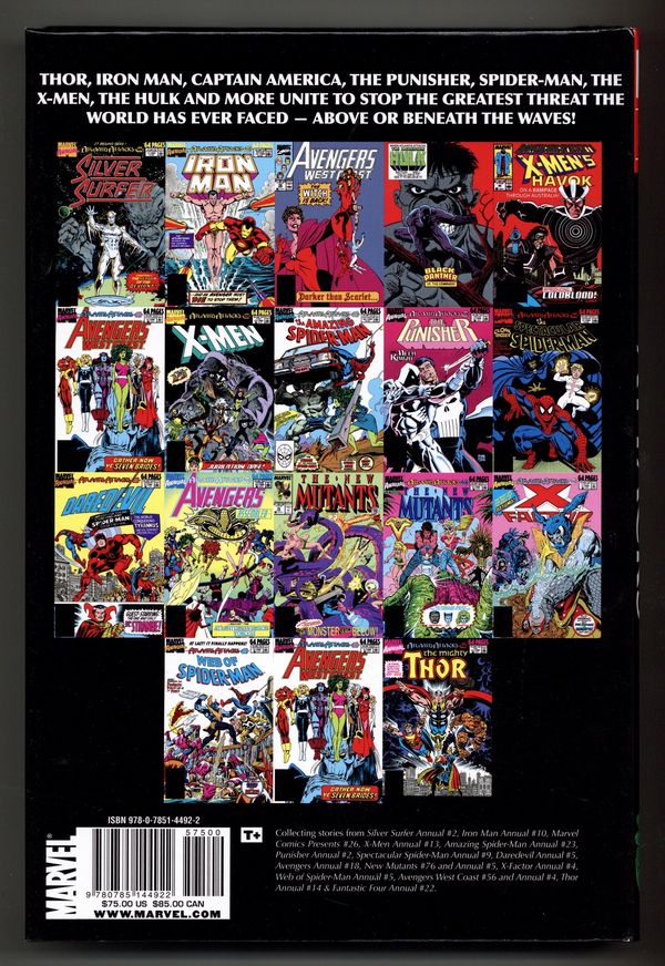 1st printing. Collects Silver Surfer Annual (1987-1998) 2, Iron Man Annual (1968-1996) #10, Marvel Comics Presents (1988-1995 1st Series) #26, Uncanny X-Men Annual (1963-2001) #13, Amazing Spider-Man Annual (1963-1998) #23, Punisher Annual (1987-1994) #2, Spectacular Spider-Man Annual (1976-1998 1st Series) #9, Daredevil Annual (1964-1998 1st Series) #4B (mis-numbered #5 Annual), Avengers Annual (1963-1996) #18, New Mutants (1983-1991 1st Series) #76, New Mutants Annual (1983-1991) #5, X-Factor Annual (1986-1998 1st Series) #4, Web of Spider-Man Annual (1985-1994) #5, Avengers West Coast (1985-1994) #56, Avengers West Coast Annual (1986-1993) #4, Thor Annual (1962-1996) #14 and Fantastic Four Annual (1961-1996) #22.