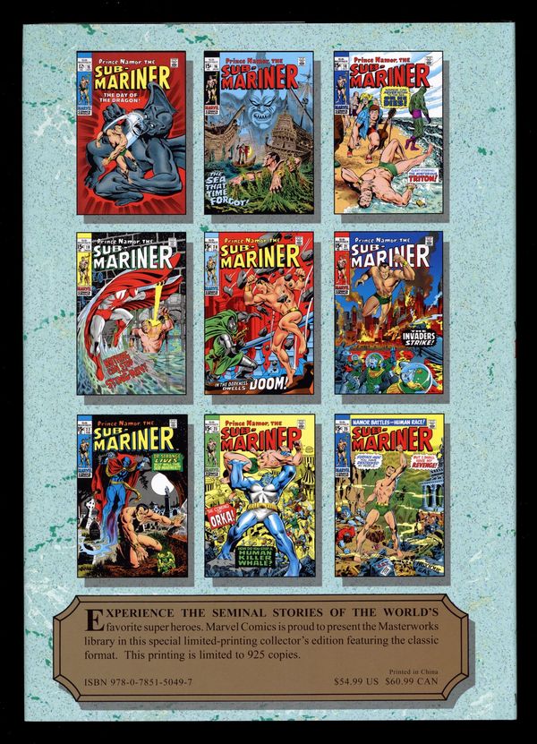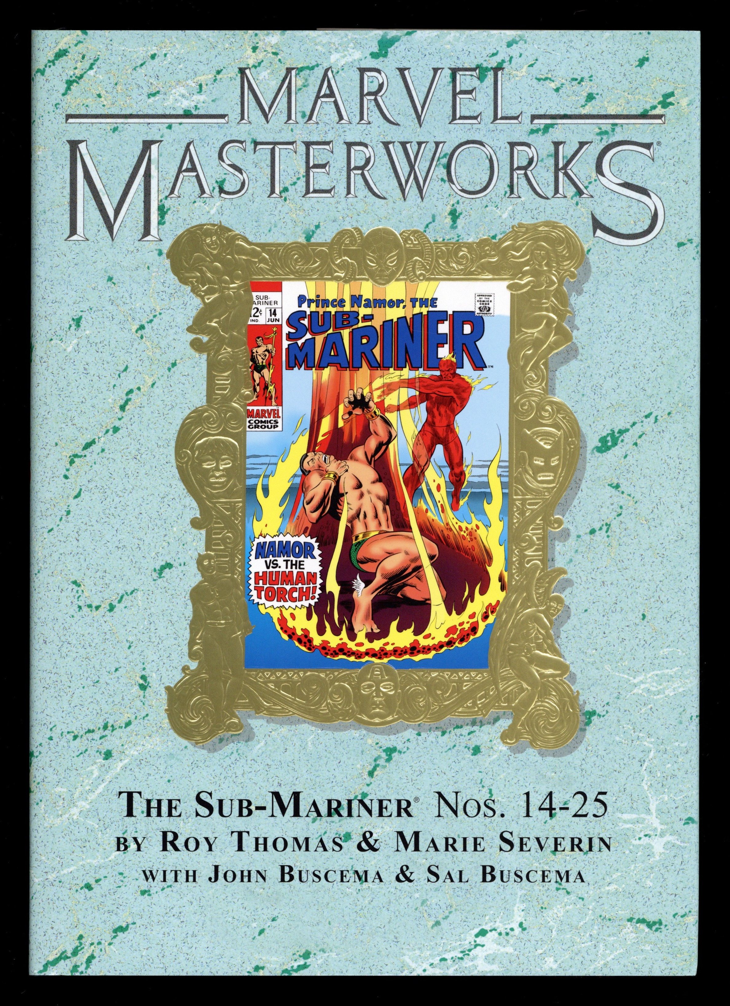 Volume 153 - 1st printing. "Sub-Mariner: Book 4!" Collects SUB-MARINER (1968-1974) #14-25. Written by ROY THOMAS. Art by MARIE SEVERIN, JOHN BUSCEMA, SAL BUSCEMA and JACK KATZ. Cover by MARIE SEVERIN. There's no mariner like the Sub-Mariner as you're about to see! Yes, Prince Namor is back for another dip with the Marvel Masterworks. Featuring scripts Roy Thomas and art by Marie Severin-with a little help from the brothers Buscema-comics' first anti-hero embarks upon 12 action-packed adventures in this classic collection! It all starts off with the return of a legend from comics' Golden Age-the Human Torch, or is he? Then a triumvirate of villains pits the Sub-Mariner against Dragon Man in a knuckle-buster that'll rattle your fillings. The drama ratchets up another notch when the alien Stalker robs Namor of his ability to fly and to breathe underwater. Stranded on land, the Avenging Son is public enemy #1 and even Dr. Doom tries for the target on his back. You can't threaten a prince without calling down the wrath of his dominion-and you know what that means. Invasion! After Atlantis rocks NYC, Subby ventures on an otherworldly adventure with Dr. Strange, and then faces an all-out attack by the vicious Tiger Shark and Orca. They're true Marvel classics, most of which have never been collected before, so need we say more? Reserve that copy today, True Believer! Hardcover, 264 pages, full color. Cover price $54.99.