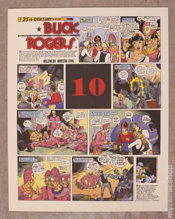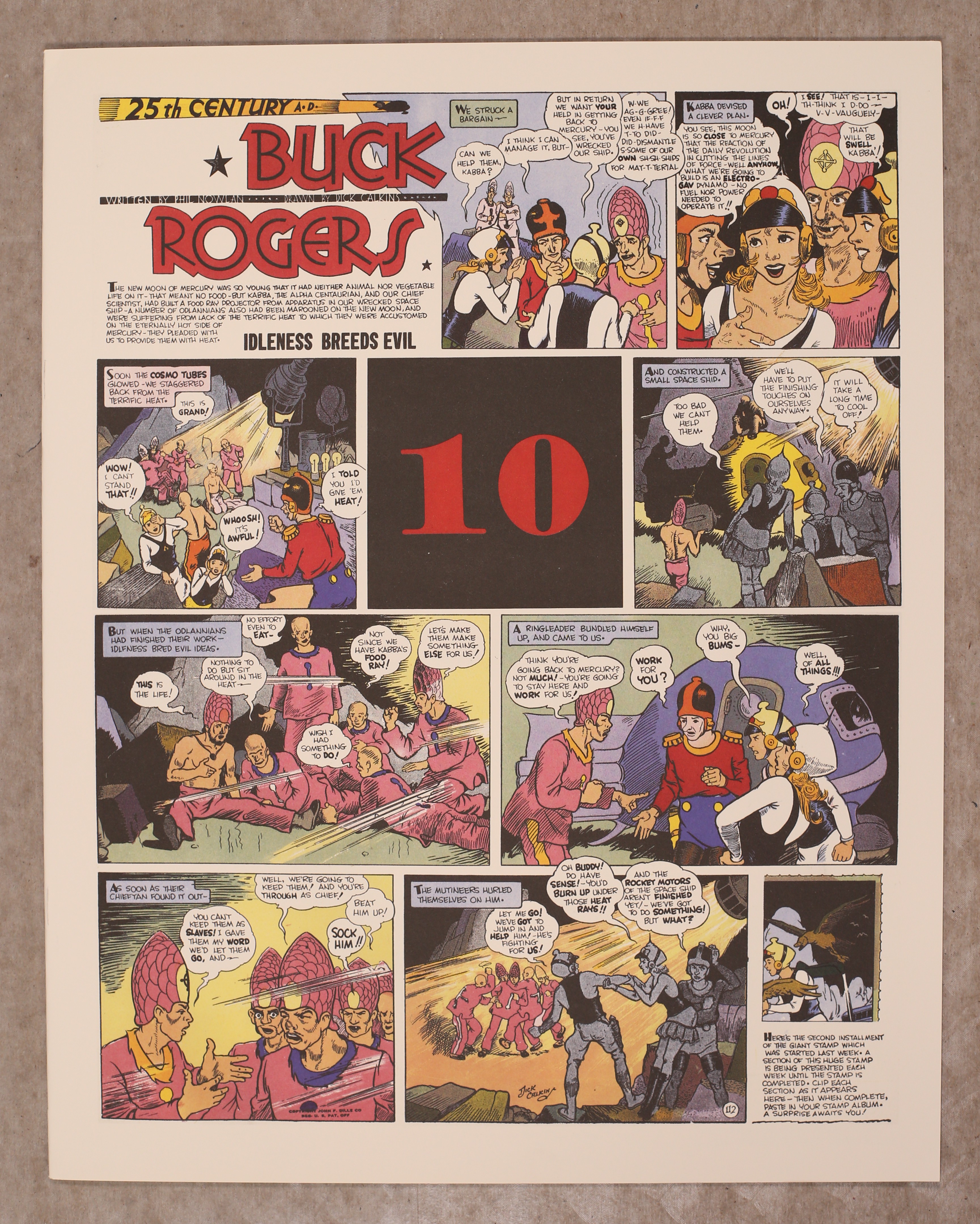 Published 1981 by Club Anni Trenta.$2.50"Idleness Breeds Evil." Stories by Phil Nowlan. Art and cover by Russell Keaton (credited as Dick Calkins). Reprints of the early comic strip that defined "science fiction" for an entire generation. 20th-century soldier Buck Rogers is revived in the 25th century to have space adventures. Reprints the Buck Rogers Sunday strips from number 109 to number 120. Reproduced in full color and full size, the Sunday strips (with a different storyline than the daily strip) follow the adventures of Buddy Deering, younger brother of Buck's compadre Wilma Deering. Buddy and his friends help the hot-kingdom Mercurians survive their exile on the planet's new moon, but the treacherous aliens soon turn against them. Includes "giant stamps" to be assembled for the Buck Rogers stamp album, a feature of the original strip. 12.5-in. x 15.75-in., 20 pages, Full Color.