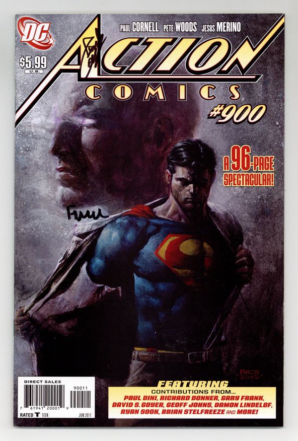 Cover by DAVID FINCH. The Black Ring: Part 11 of 11 - Reign of Doomsday: Part 6 of 6 - Written by Paul Cornell. Art by Pete Woods and Jesus Merino. A 51-page story that concludes the "Black Ring" story and begins the next act of the "Reign of Doomsday" epic; includes vignettes illustrated by Dan Jurgens & Norm Rapmund, Rags Morales, Ardian Syaf, Jamal Igle and Jon Sibal, Gary Frank and more. Also includes bonus short stories by the writer/artist teams of Damon Lindelof & Ryan Sook; Paul Dini, R.B. Silva & Rob Lean; David S. Goyer & Miguel Sepulveda; and Geoff Johns & Gary Frank. Plus: Richard Donner & Derek Hoffman write a story in screenplay form, with storyboard-style art by Matt Camp; and Brian Stelfreeze contributes a 2-page spread depicting Superman in an homage to many of the great artists who have drawn him. 100 Pages, Full Color. Cover price $5.99.