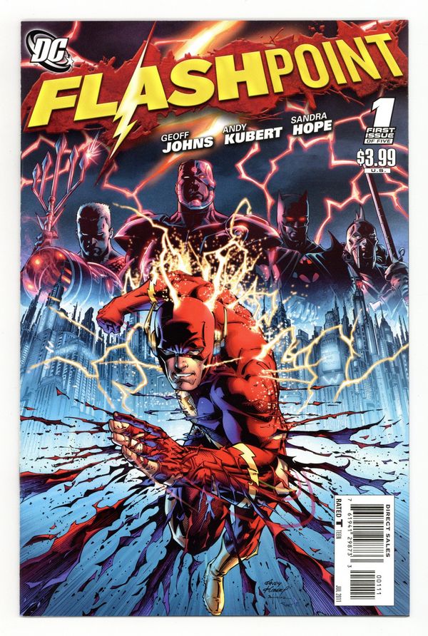 Tags: Flashpoint (part 1)$25.00Cover by ANDY KUBERT Written by GEOFF JOHNS Art by ANDY KUBERT Not a dream, not an imaginary story, not an elseworld. This is Flash Fact: When Barry Allen wakes at his desk, he discovers the world has changed. Family is alive, loved ones are strangers, and close friends are different, gone or worse. It's a world on the brink of a cataclysmic war - but where are Earth's Greatest Heroes to stop it? It's a place where America's last hope is Cyborg, who hopes to gather the forces of The Outsider, The Secret 7, S!H!A!Z!A!M!, Citizen Cold and other new and familiar-yet-altered faces! It's a world that could be running out of time, if The Flash can't find the villain who altered the time line! Welcome to FLASHPOINT! 40 pg, FC Cover price $3.99.