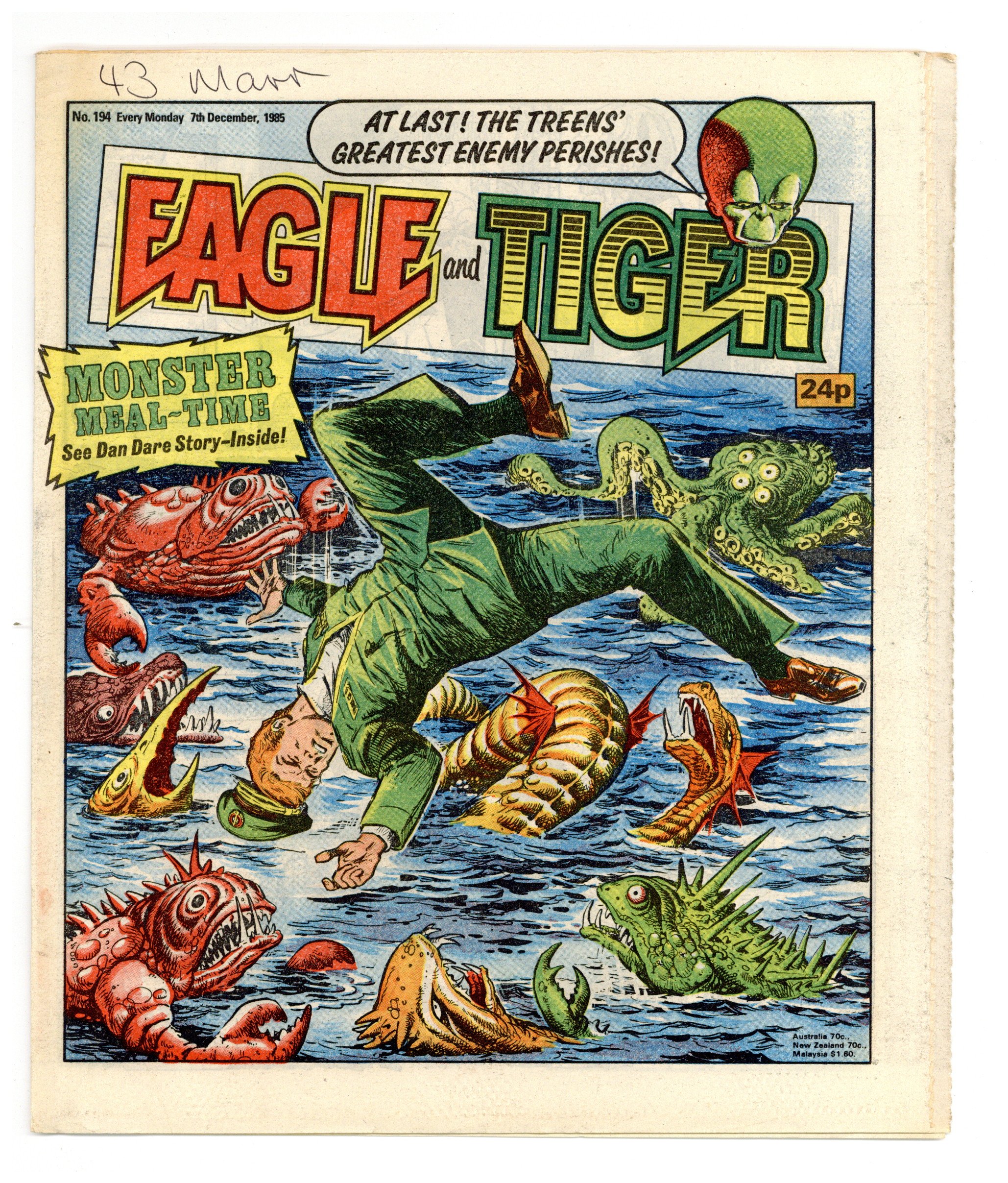 Dec. 7, 1985. "Eagle and Tiger" on cover. Dan Dare, plus other features. Published in the United Kingdom, 8-1/2-in. x 11-1/2-in, 32-pages including cover, all newsprint stock. Mix of color and black/white interior.