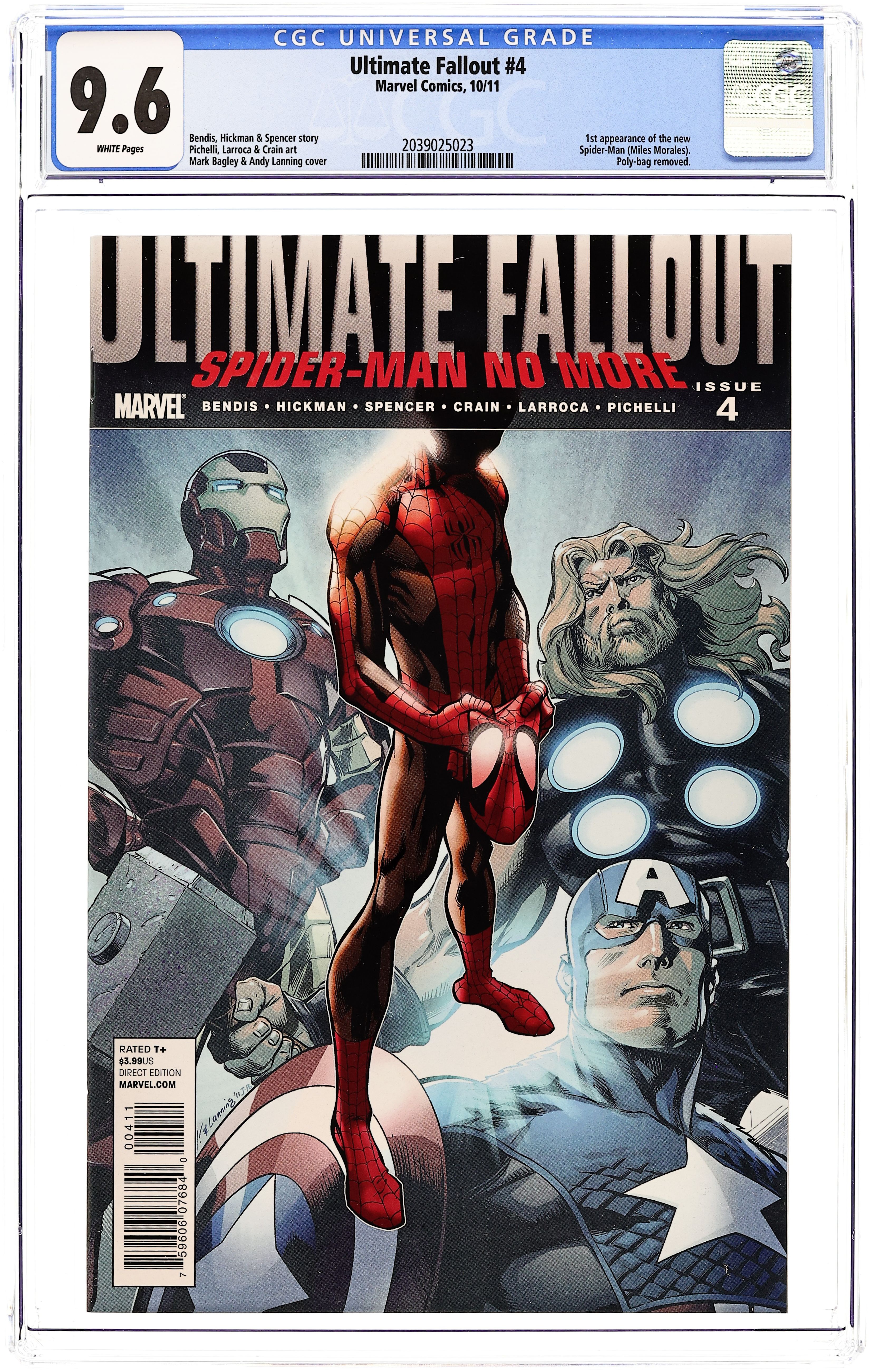 Direct Edition. 1st appearance of Miles Morales. Written by BRIAN BENDIS, JONATHAN HICKMAN & NICK SPENCER. Art by SARA PICHELLI, SALVADOR LARROCA & CLAYTON CRAIN. Cover by MARK BAGLEY. What will become of Captain America? Where have all the X-Men gone? And what is up with the new Spider-Man suit? Don't miss the final chapters of one of the most talked about Ultimate events ever. 36 PGS. (each)/Rated T+...$3.99 (each) Cover price $3.99.