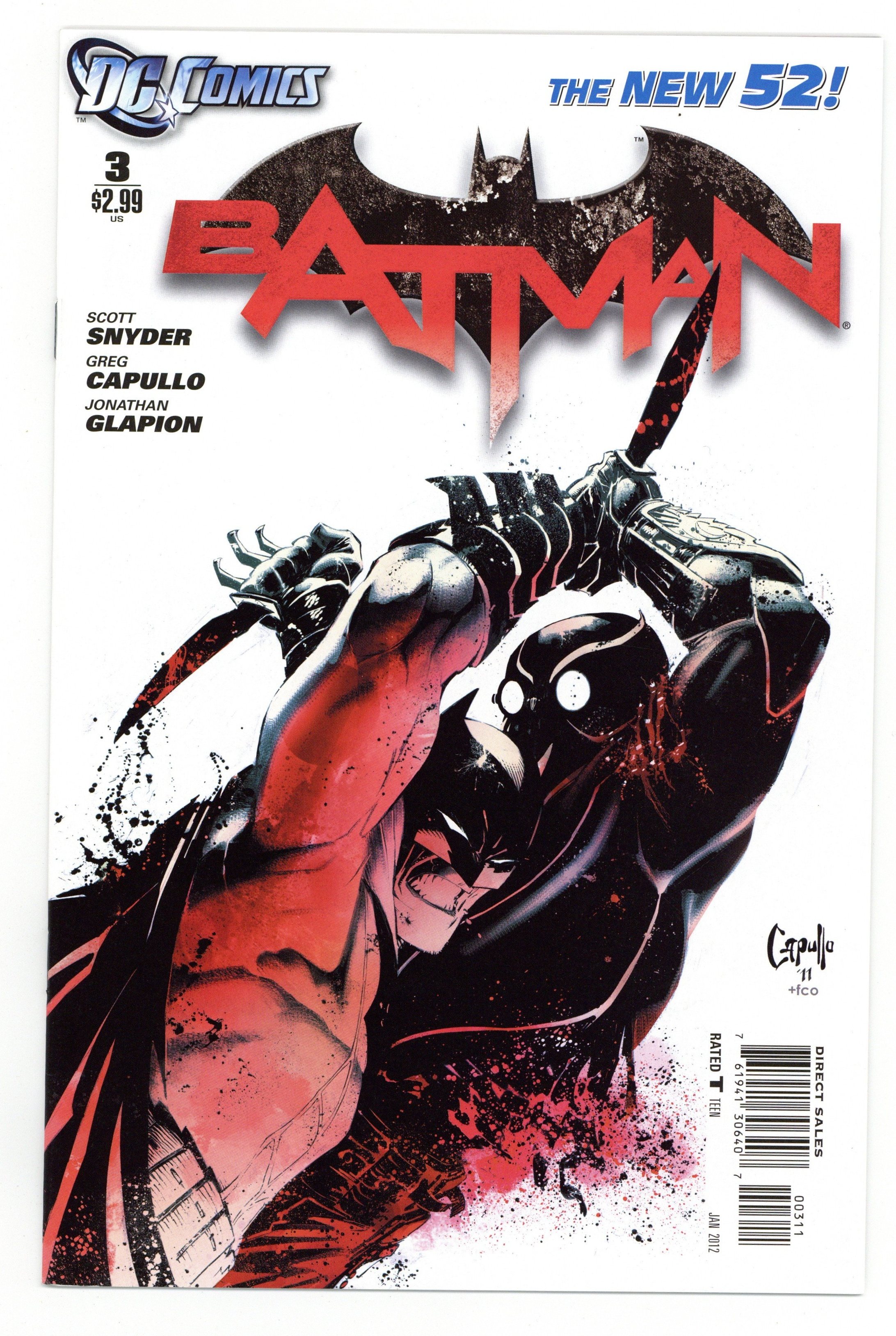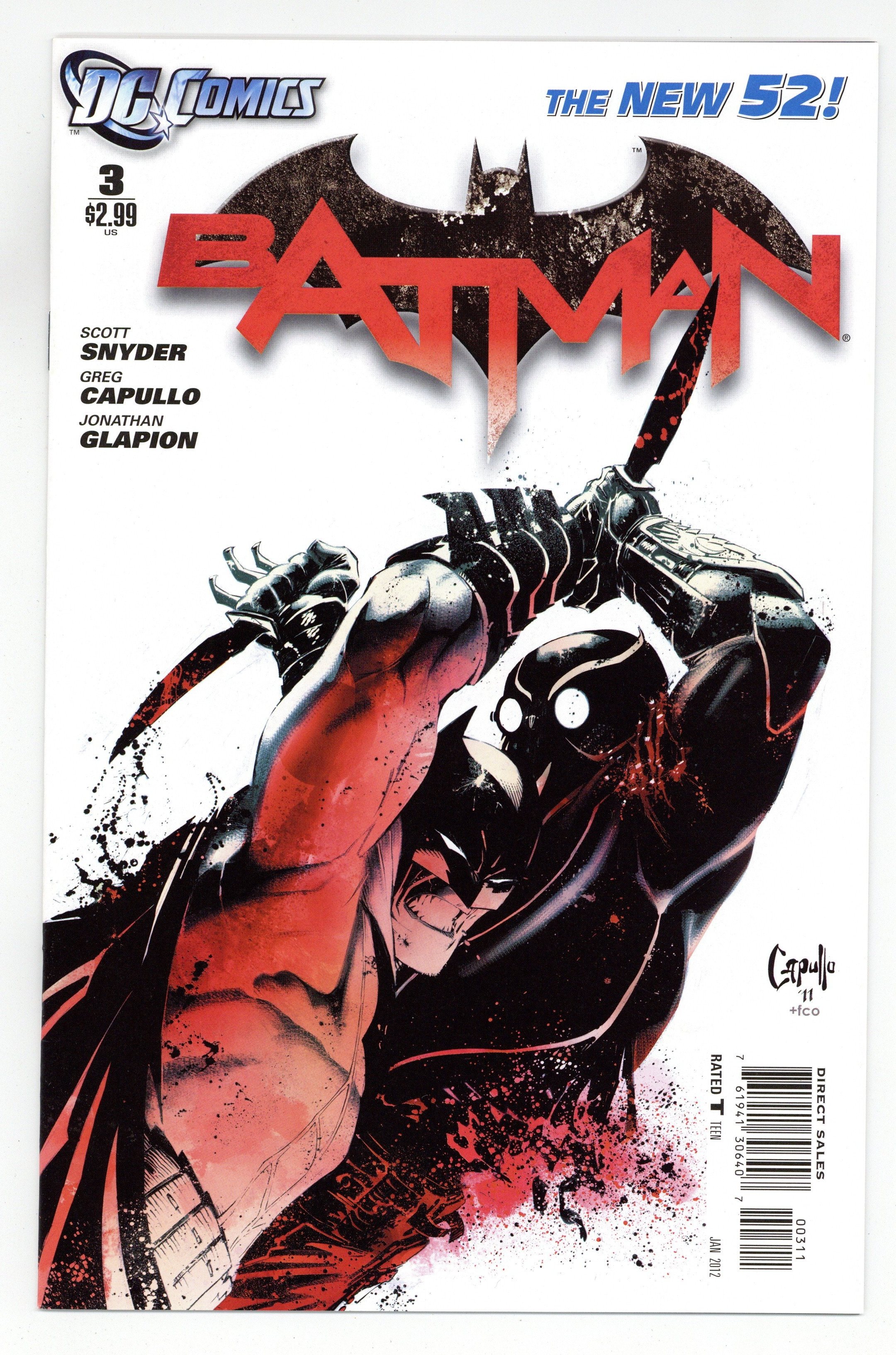 Cover by GREG CAPULLO Written by SCOTT SNYDER Art by GREG CAPULLO and JONATHAN GLAPION As Bruce digs deeper into the mystery of the recent owl murders, he soon finds himself face to face with a shocking enemy - an enemy the Wayne family has secretly been at war with for centuries. Be there for the first shots of the war for the soul of Gotham City. Friends will become deadly enemies and secrets will be revealed - revelations that will change the Bat-family forever. Cover price $2.99.